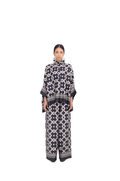 Description This loose tapped kaftan is distinguished by its fresh, versatile cut, enlightened by modern geomatic placement and floral batik . It is an authentic look characterized by sleek, well-defined silhouette that will bring glam to your sensations. Details • Composition of mate satin • V Neckline • cuff sleeves. • 4” opening at…