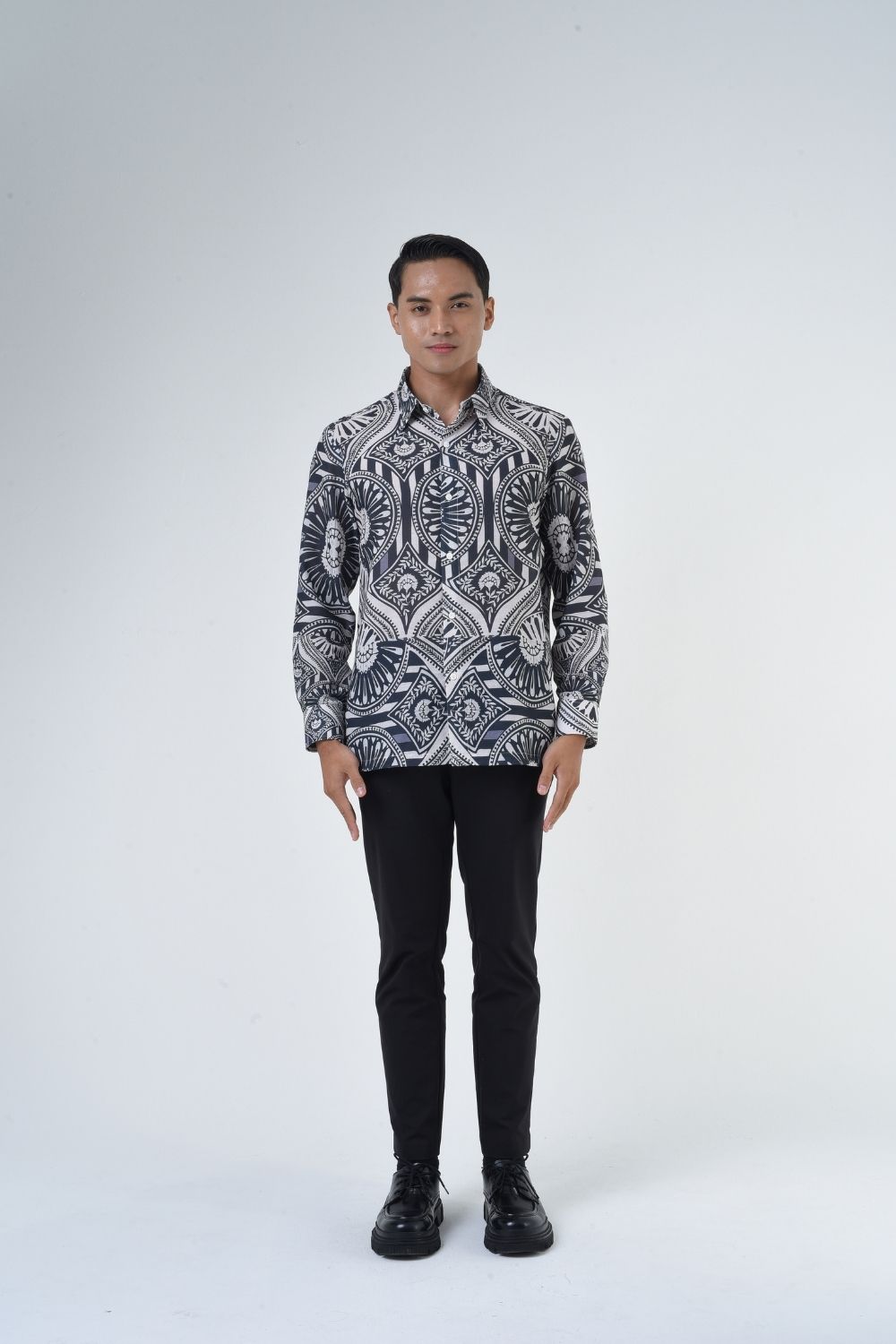 Description: This relaxed cut men’s long sleeve batik shirt features intricate geometric patterns. Its tailored fit makes it versatile for formal occasions, creating a striking statement piece that celebrates cultural heritage. Details: 70% Composition Cotton Shirt Collar Long sleeves with cuff button Color: Charcoal gray and silver