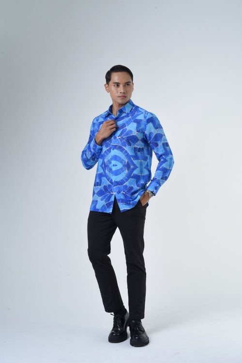 Description: This relaxes cut men’s long sleeve batik shirt features intricate geometric patterns. Its tailored fit makes it versatile for formal occasions, creating a striking statement piece that celebrates cultural heritage. Details: 100% Composition Linen Shirt Collar Long sleeves with cuff button Color: Bonnie blue base with Olympian blue and slightly with…
