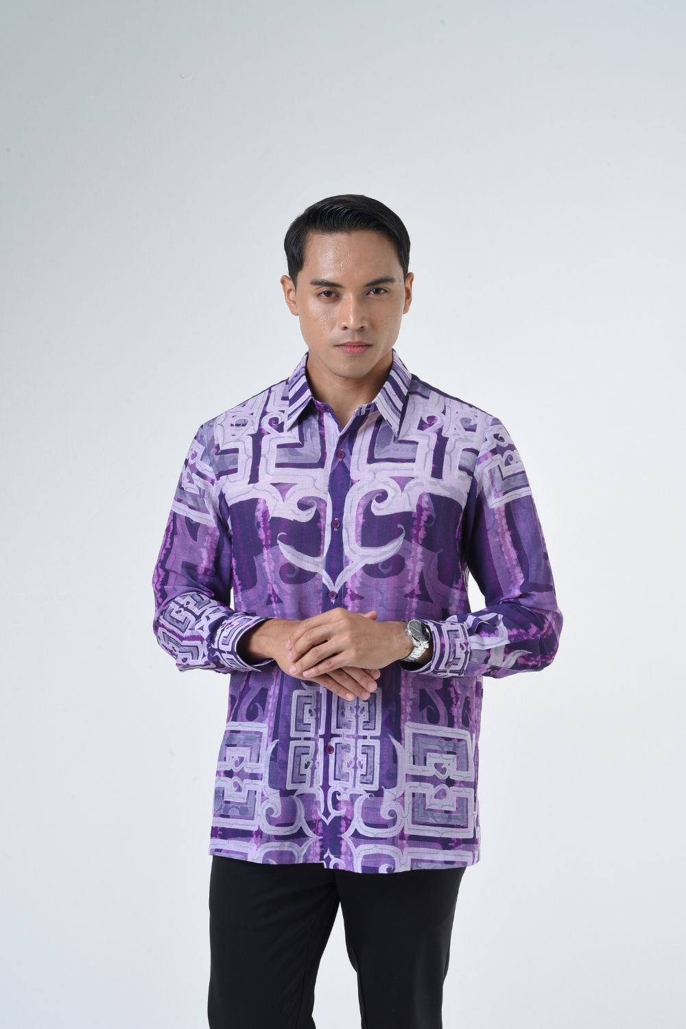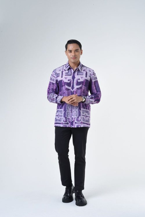 Description: This relaxed cut men’s long sleeve batik shirt features intricate ethnic patterns. Its tailored fit makes it versatile for formal occasions, creating a striking statement piece that celebrates cultural heritage. Details: 100% Composition Linen Shirt Collar Long sleeves with cuff button Color:Fair orchid mixed with logan berry and violet tulle