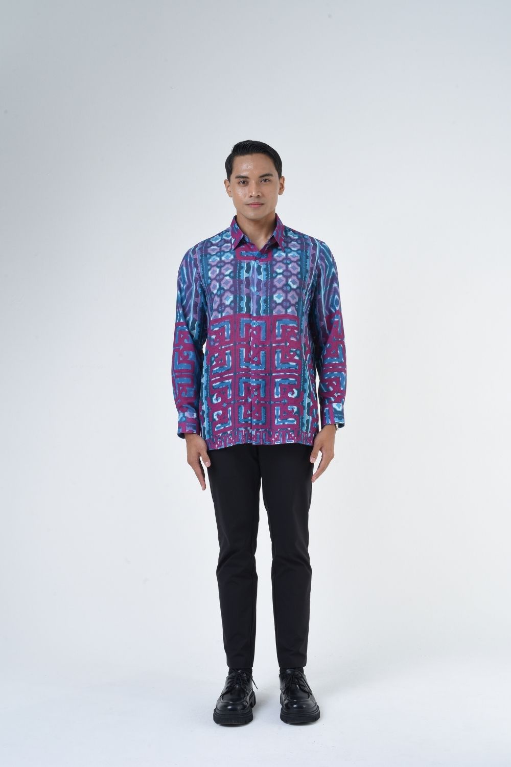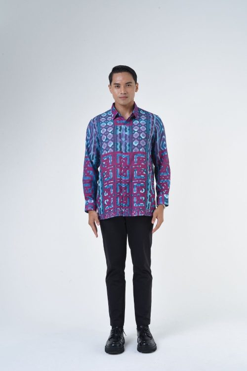 Description: This relaxed cut men’s long sleeve batik shirt features intricate ethnic patterns. Its tailored fit makes it versatile for formal occasions, creating a striking statement piece that celebrates cultural heritage. Details: 100% Composition Linen Shirt Collar Long sleeves with cuff button Color: Mosaic blue with boysenberry and slightly angel blue