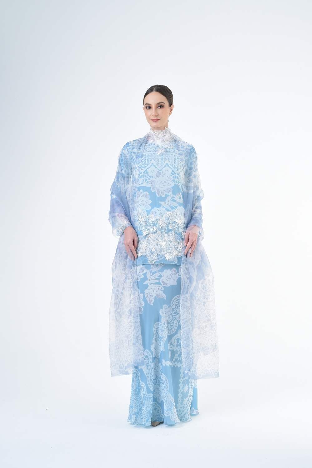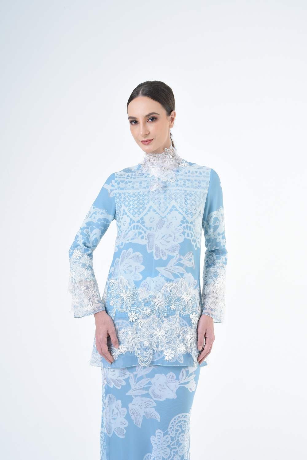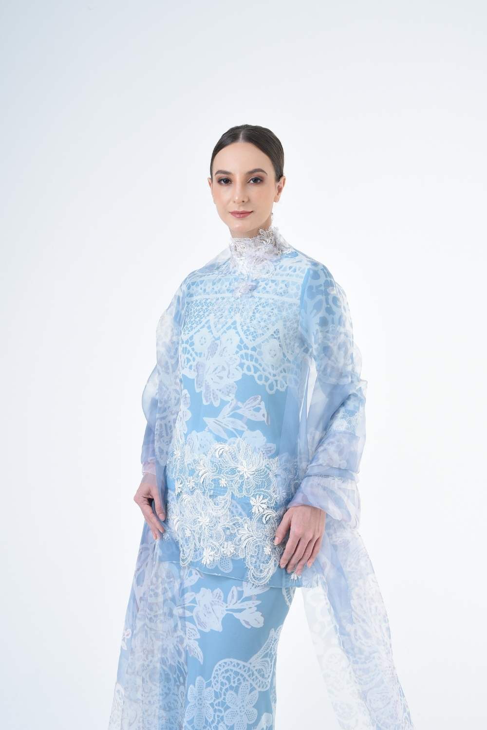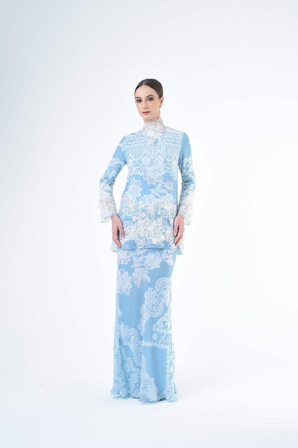 This two-piece short modern Kurang set features semi loose-fitting A cut top paired with a bias-cut skirt. Layered Lace details attach on bottom of Kurang and bottom of sleeves Designed with a modern geomatic antique lace motif, it offers a fresh, versatile look perfect for any occasion. Made for the confident, stylish woman, this collection brings effortless elegance and charm.