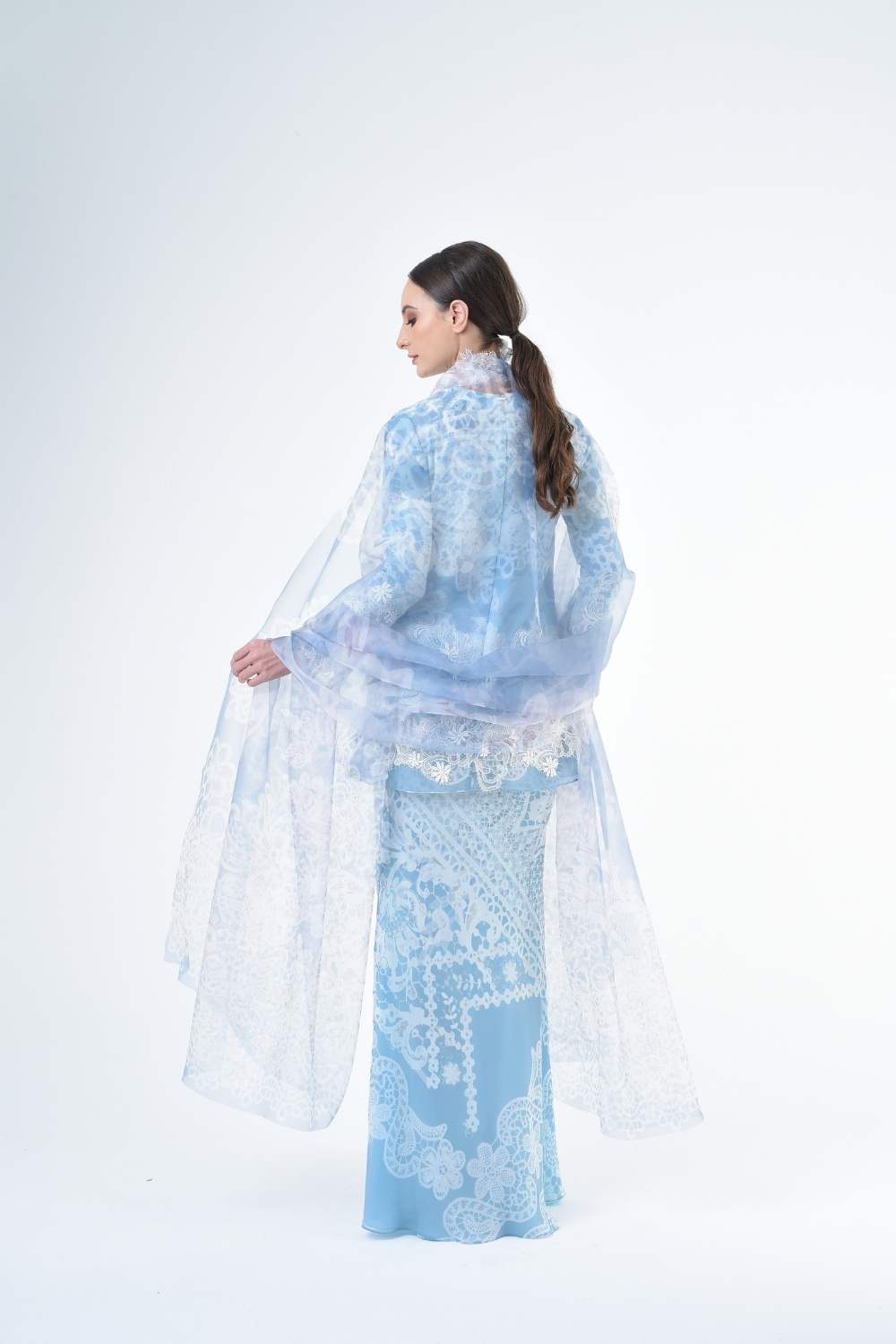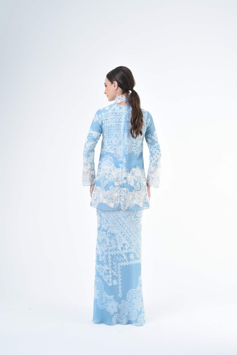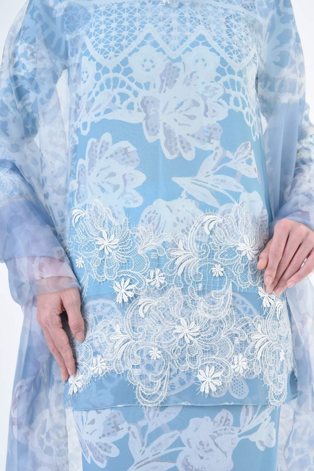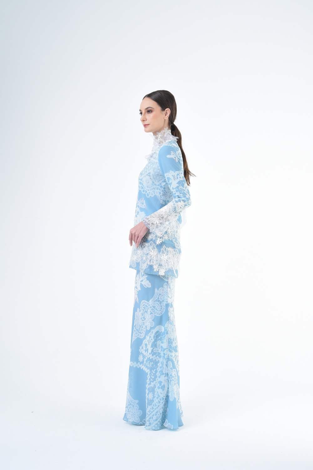 This two-piece short modern Kurang set features semi loose-fitting A cut top paired with a bias-cut skirt. Layered Lace details attach on bottom of Kurang and bottom of sleeves Designed with a modern geomatic antique lace motif, it offers a fresh, versatile look perfect for any occasion. Made for the confident, stylish woman, this collection brings effortless elegance and charm.
