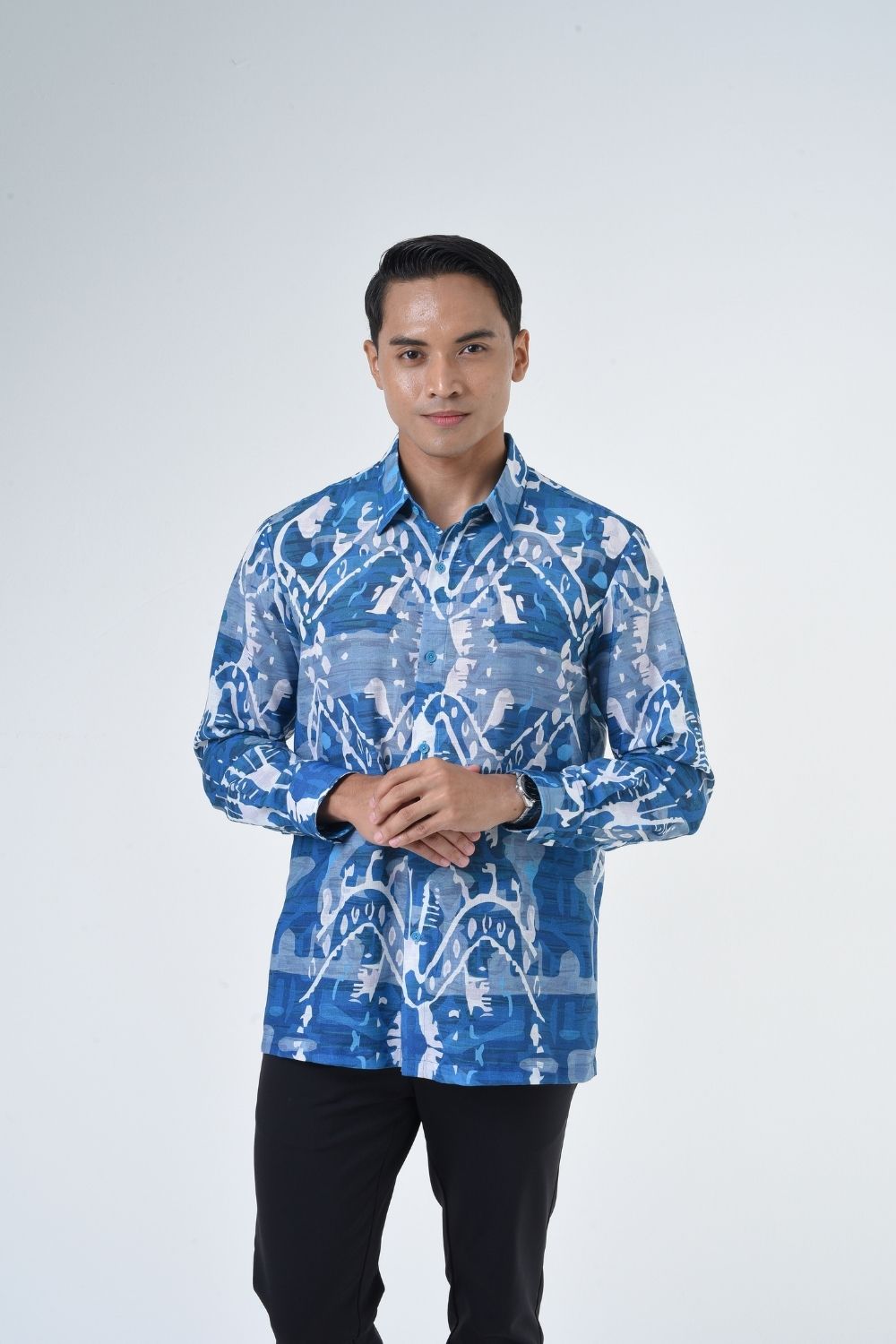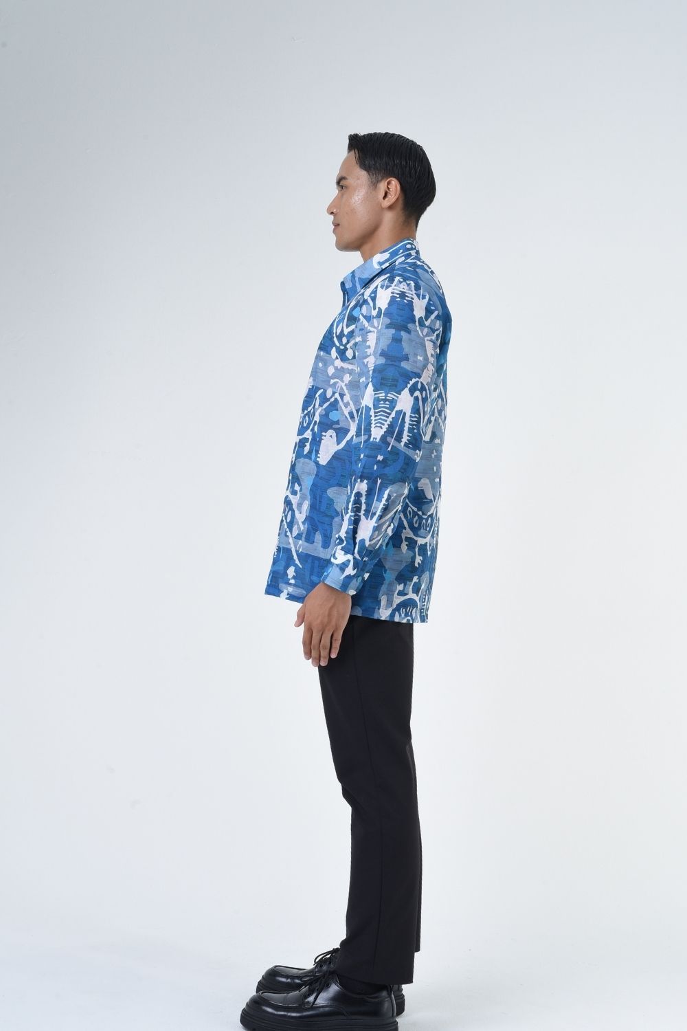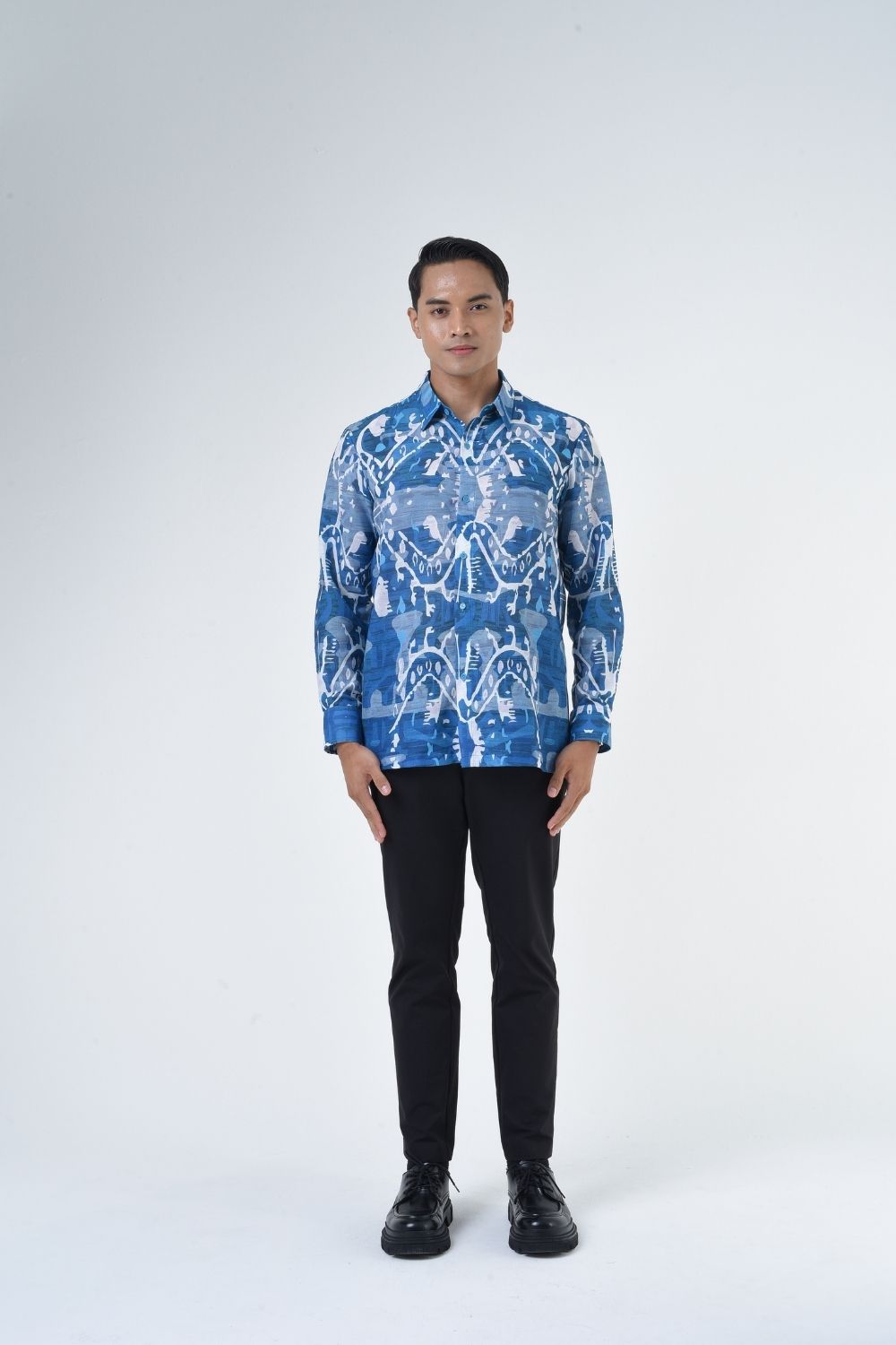 This relaxed cut men’s long sleeve batik shirt features intricate ethnic patterns. Its tailored fit makes it versatile for formal occasions, creating a striking statement piece that celebrates cultural heritage.