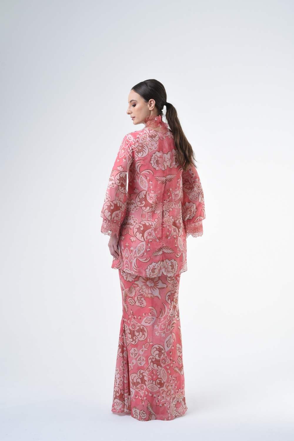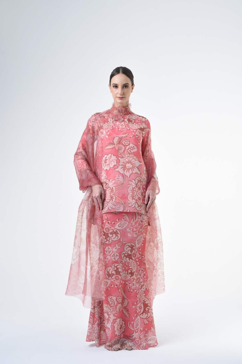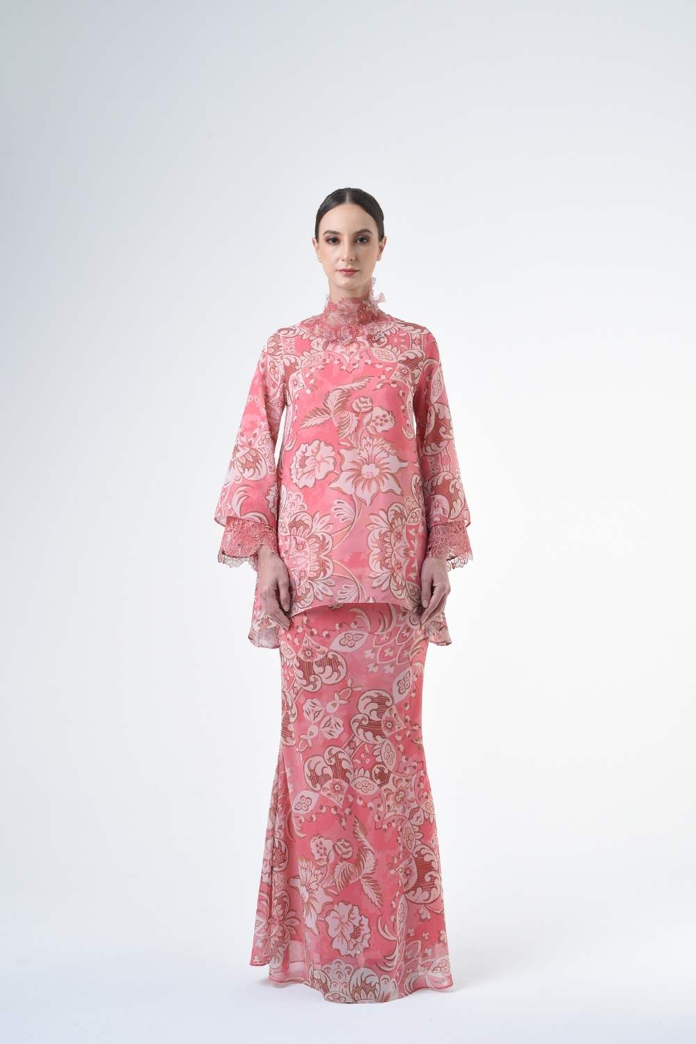 This two-piece short modern Kurang set features semi loose-fitting A cut top paired with a bias-cut skirt. Layered Lace details attach on bottom of sleeves. Designed with a contemporary floral batik motif, it offers a fresh and versatile look, perfect for any occasion. Tailored for the confident, stylish woman, this collection exudes effortless elegance and charm.