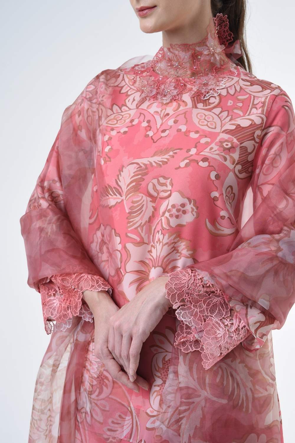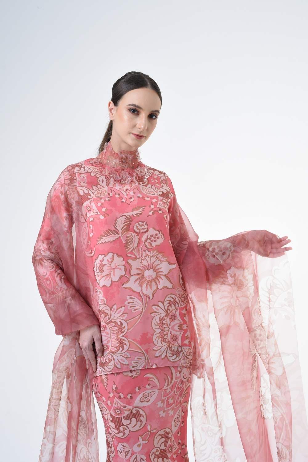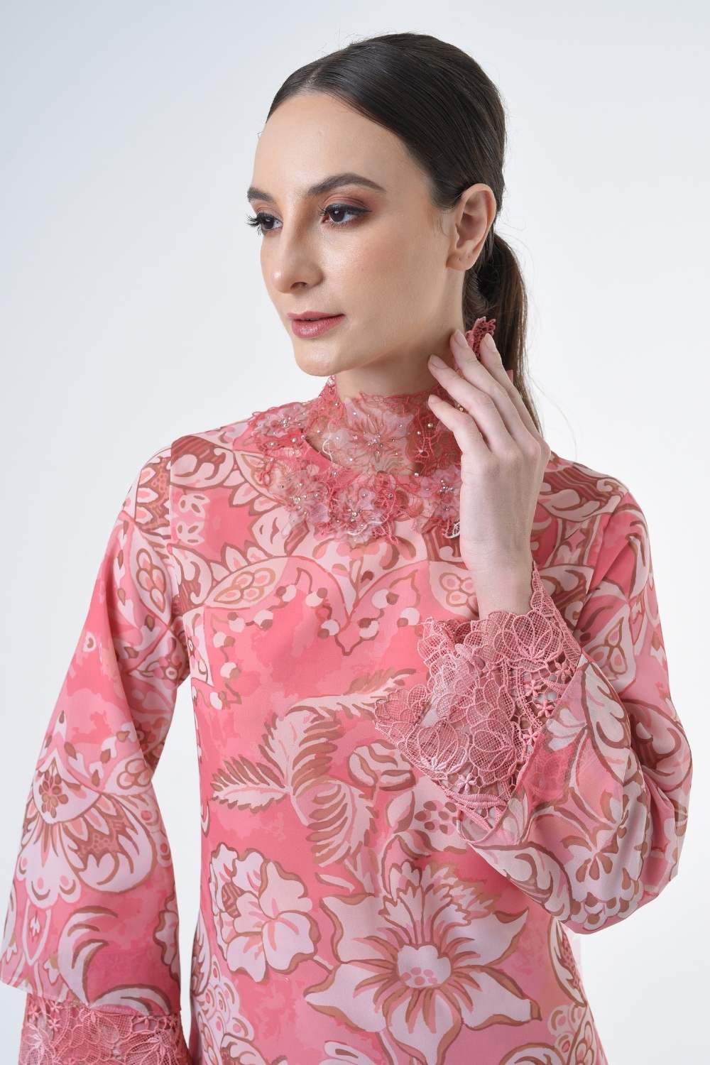 This two-piece short modern Kurang set features semi loose-fitting A cut top paired with a bias-cut skirt. Layered Lace details attach on bottom of sleeves. Designed with a contemporary floral batik motif, it offers a fresh and versatile look, perfect for any occasion. Tailored for the confident, stylish woman, this collection exudes effortless elegance and charm.