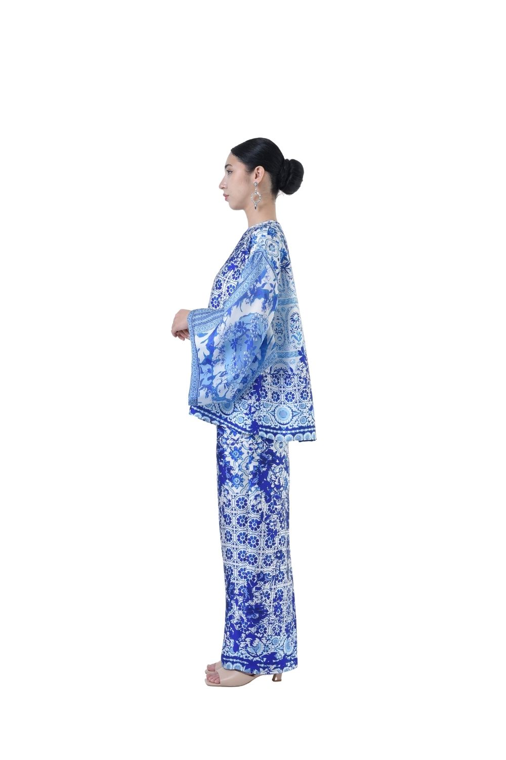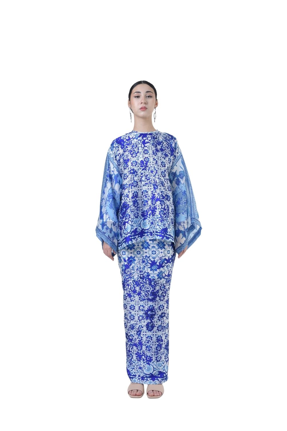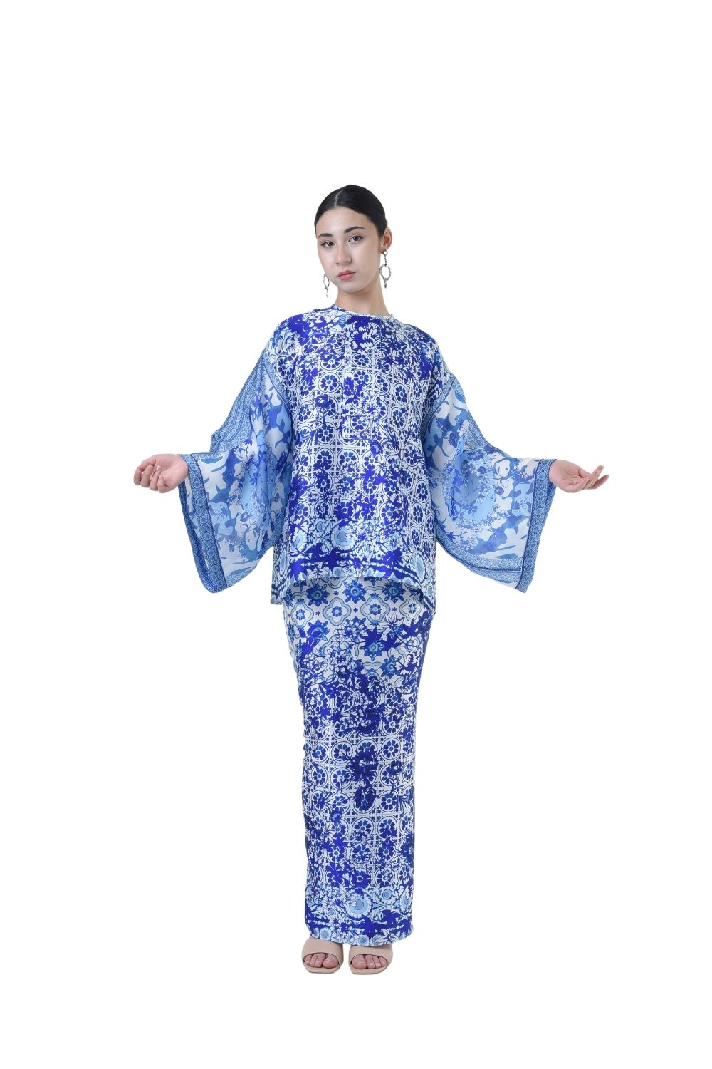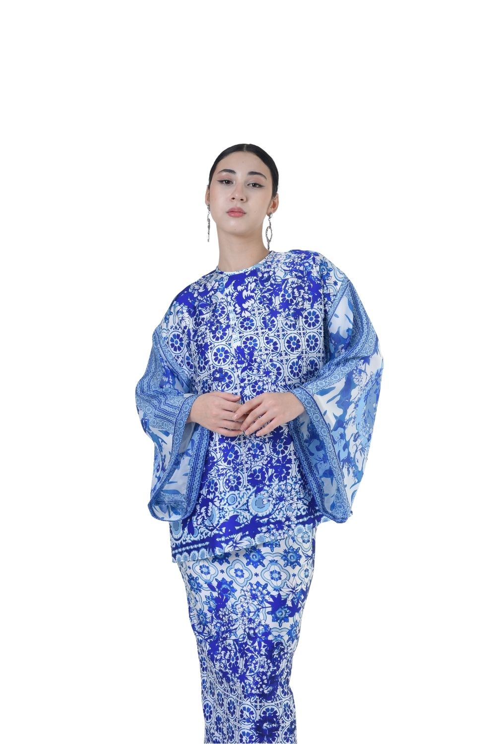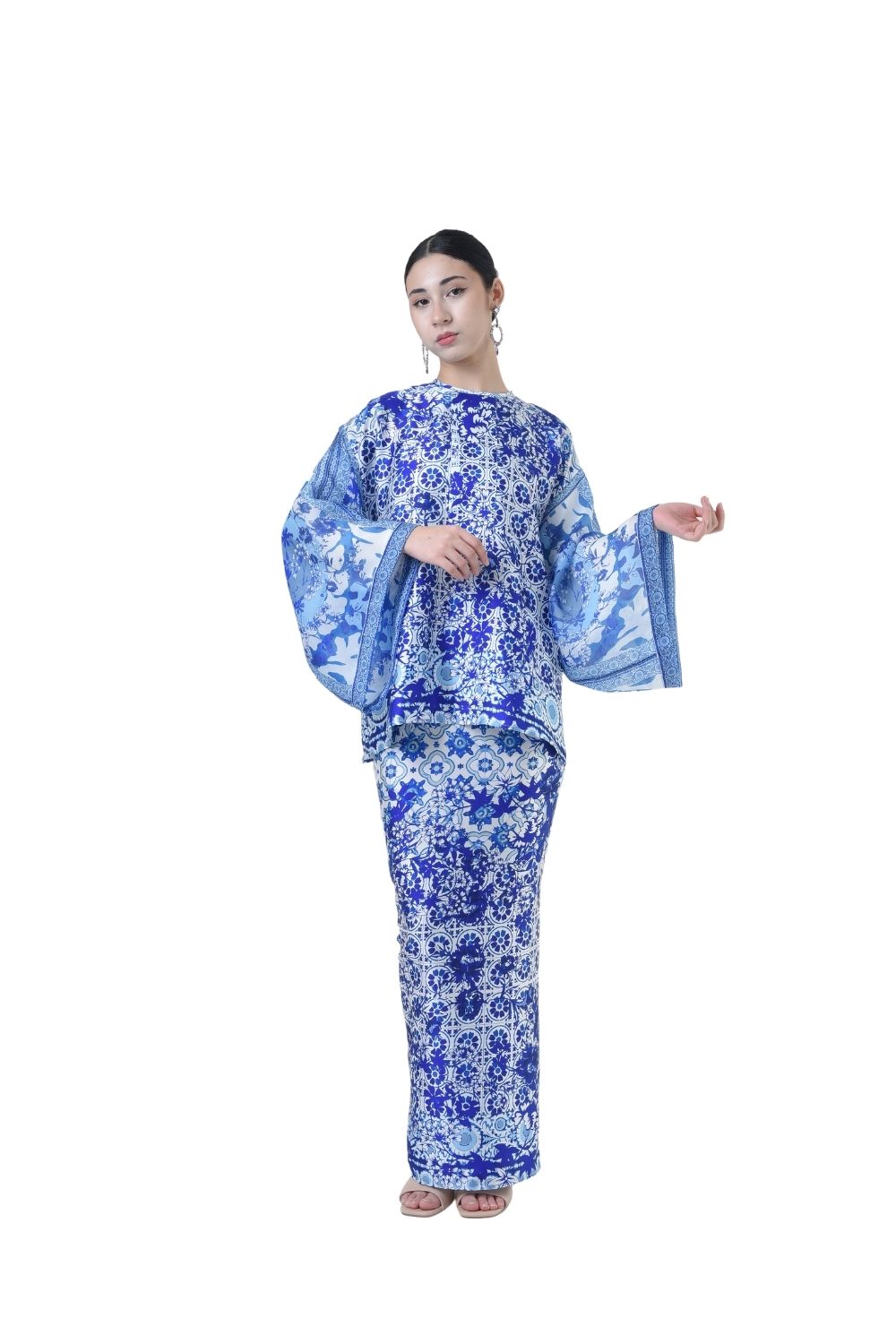 This stylish two-piece set features a loose A-cut top in the short kurung style, paired with a box pleated skirt. Designed with a contemporary geometric motif, it offers a fresh and versatile look, perfect for any occasion. Tailored for the confident, stylish woman, this collection exudes effortless elegance and charm.