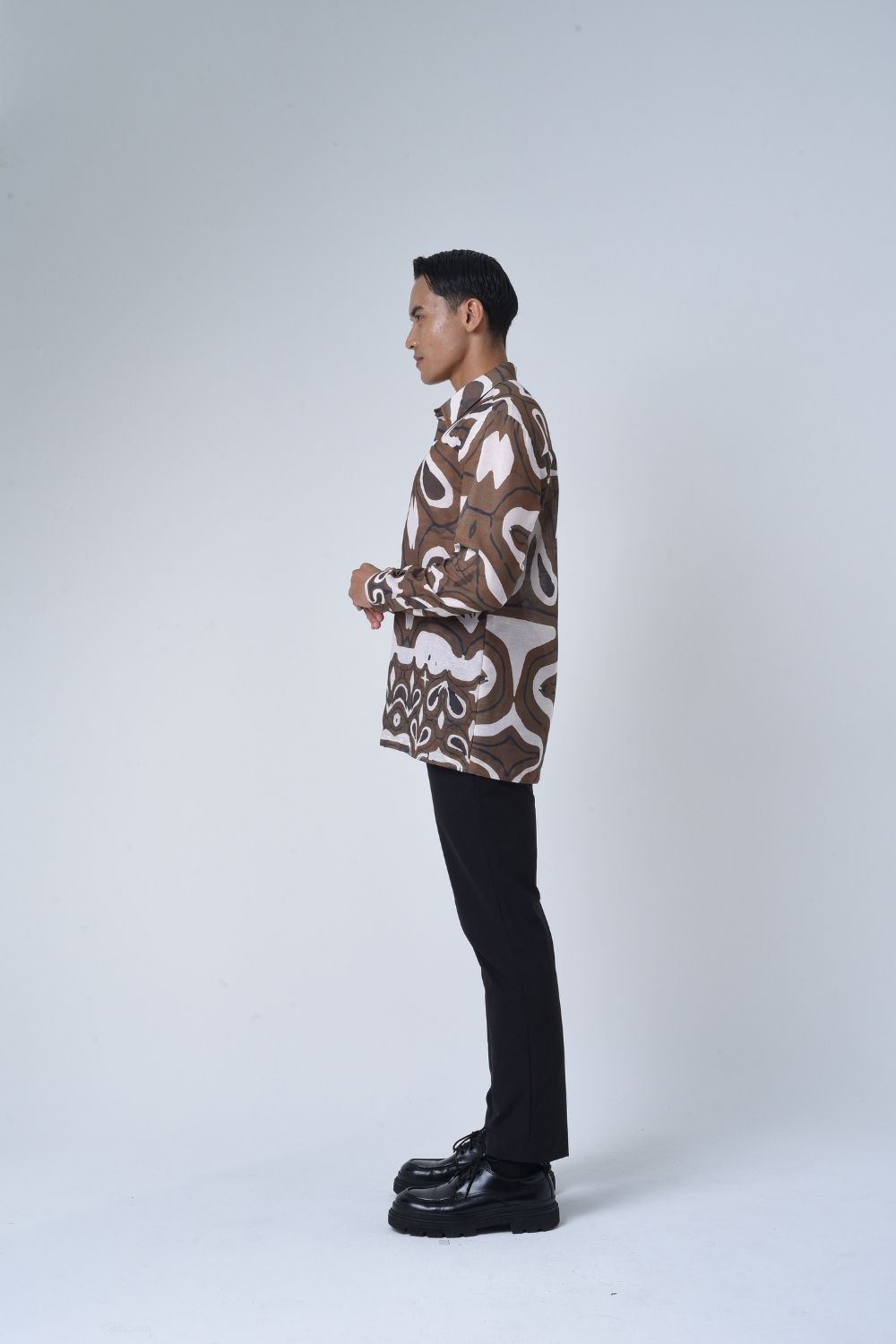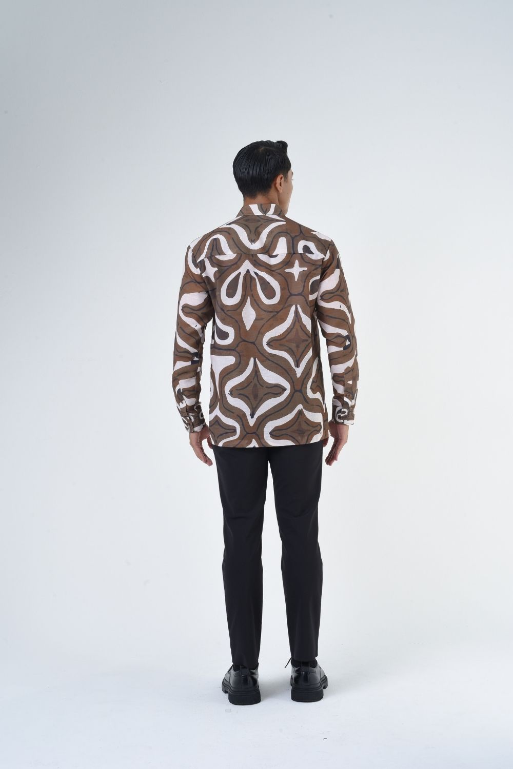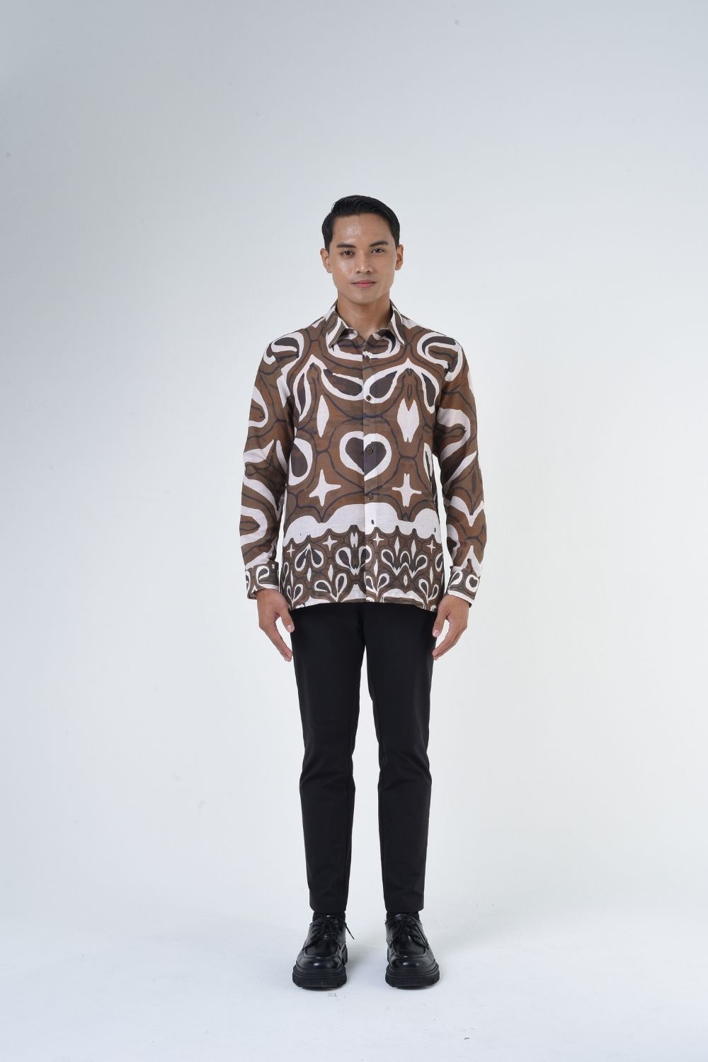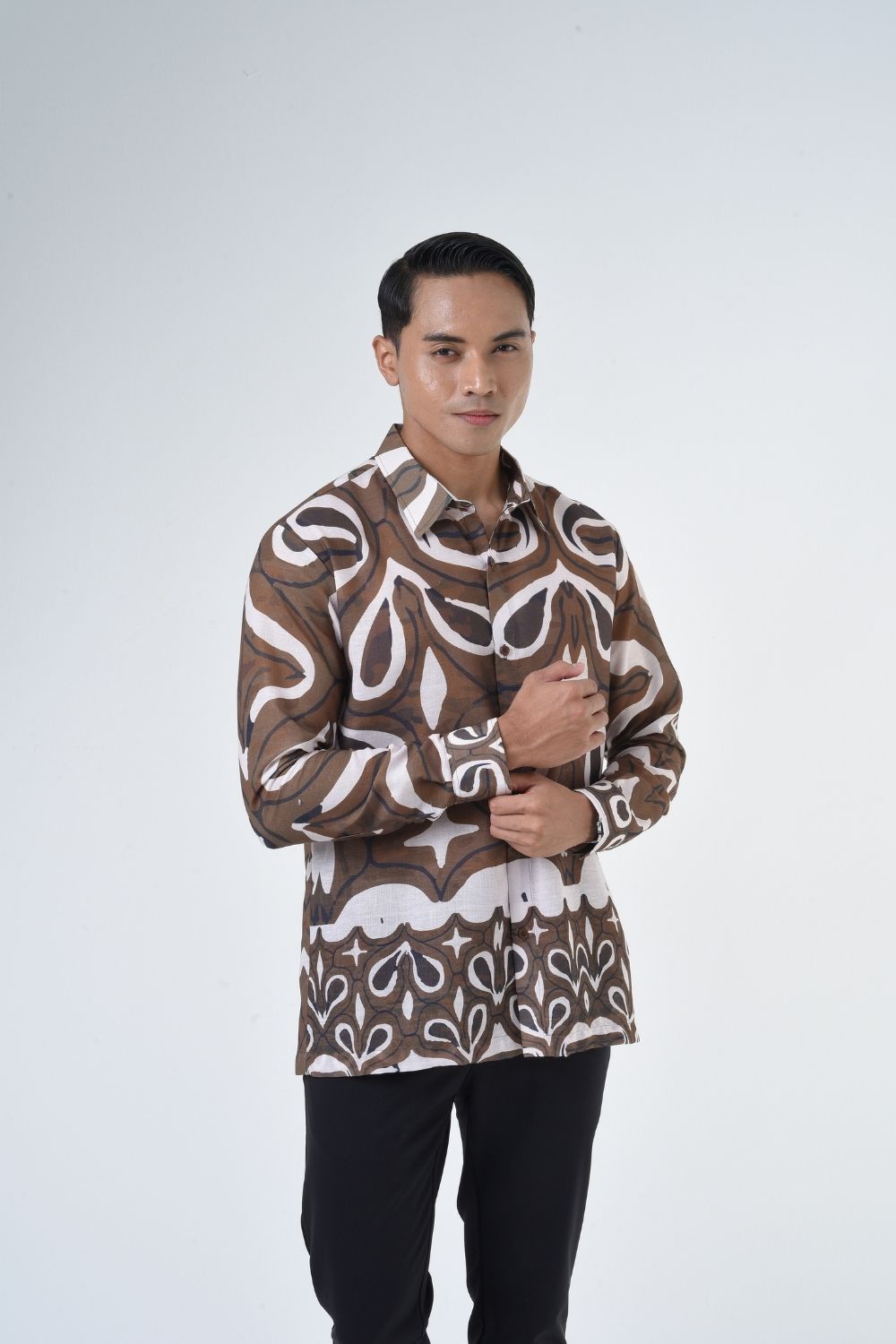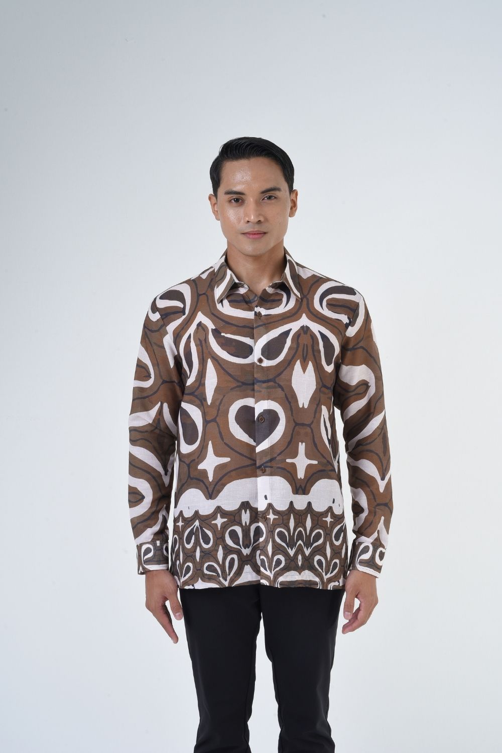 This relaxes cut men’s long sleeve batik shirt features intricate ethnic patterns. Its tailored fit makes it versatile for formal occasions, creating a striking statement piece that celebrates cultural heritage.