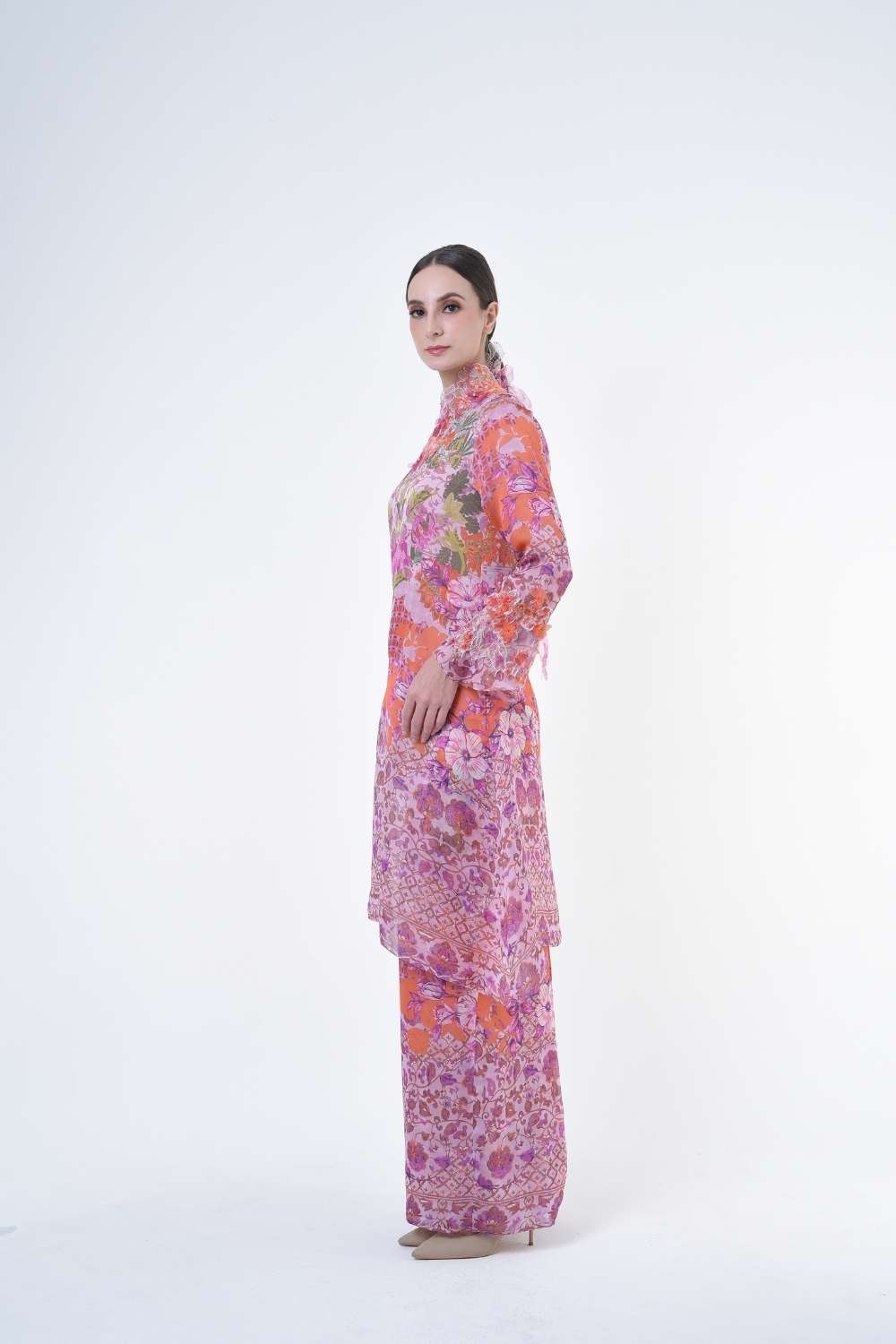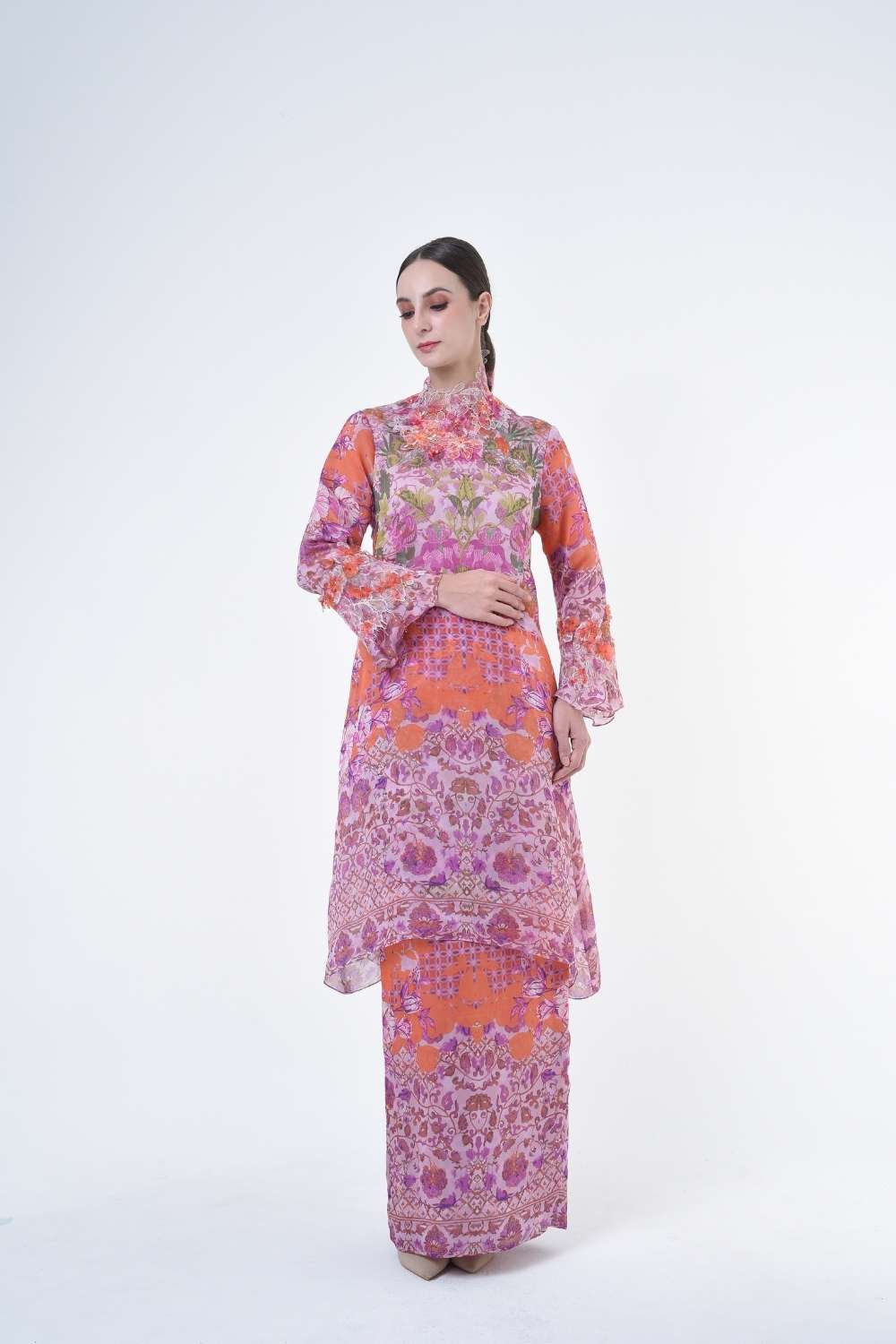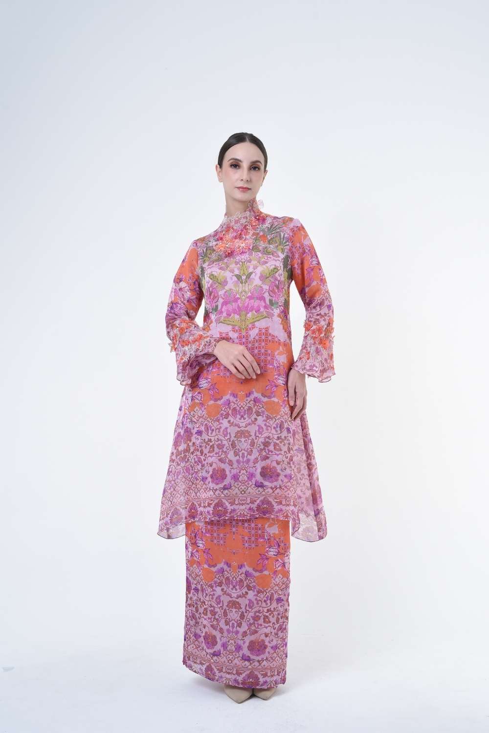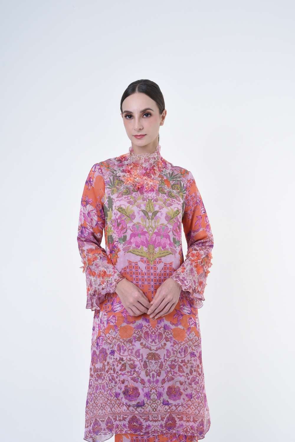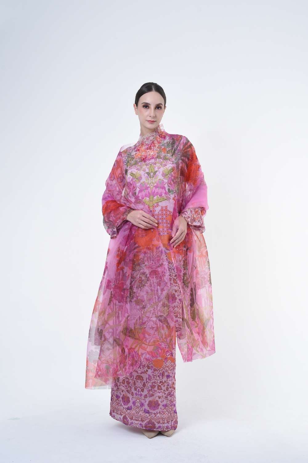 This stylish two-piece set features a loose A-cut top in the long modern Kurang style, paired with a box pleat skirt. Layered Lace details attach on bottom of sleeves with laser cut flowers enhance the beauty with diamanté with Designed with a contemporary geomatic and floral motif, it offers a fresh and versatile look, perfect for any occasion. Tailored for the confident, stylish woman, this collection exudes effortless elegance and charm