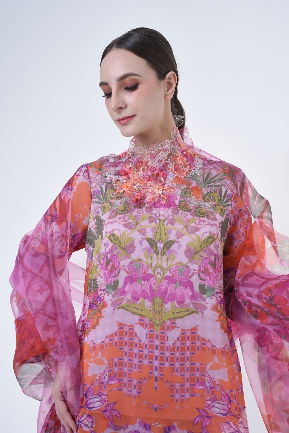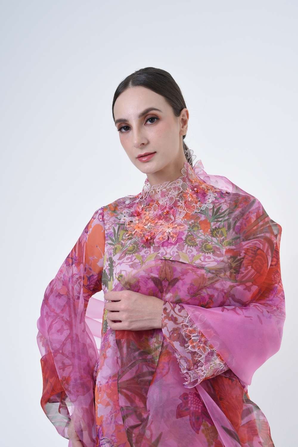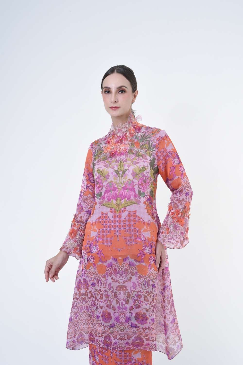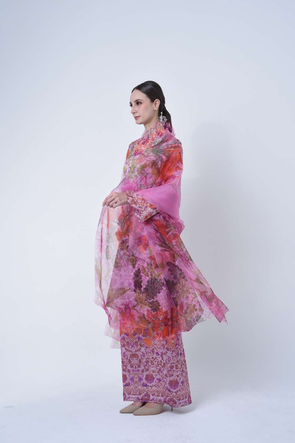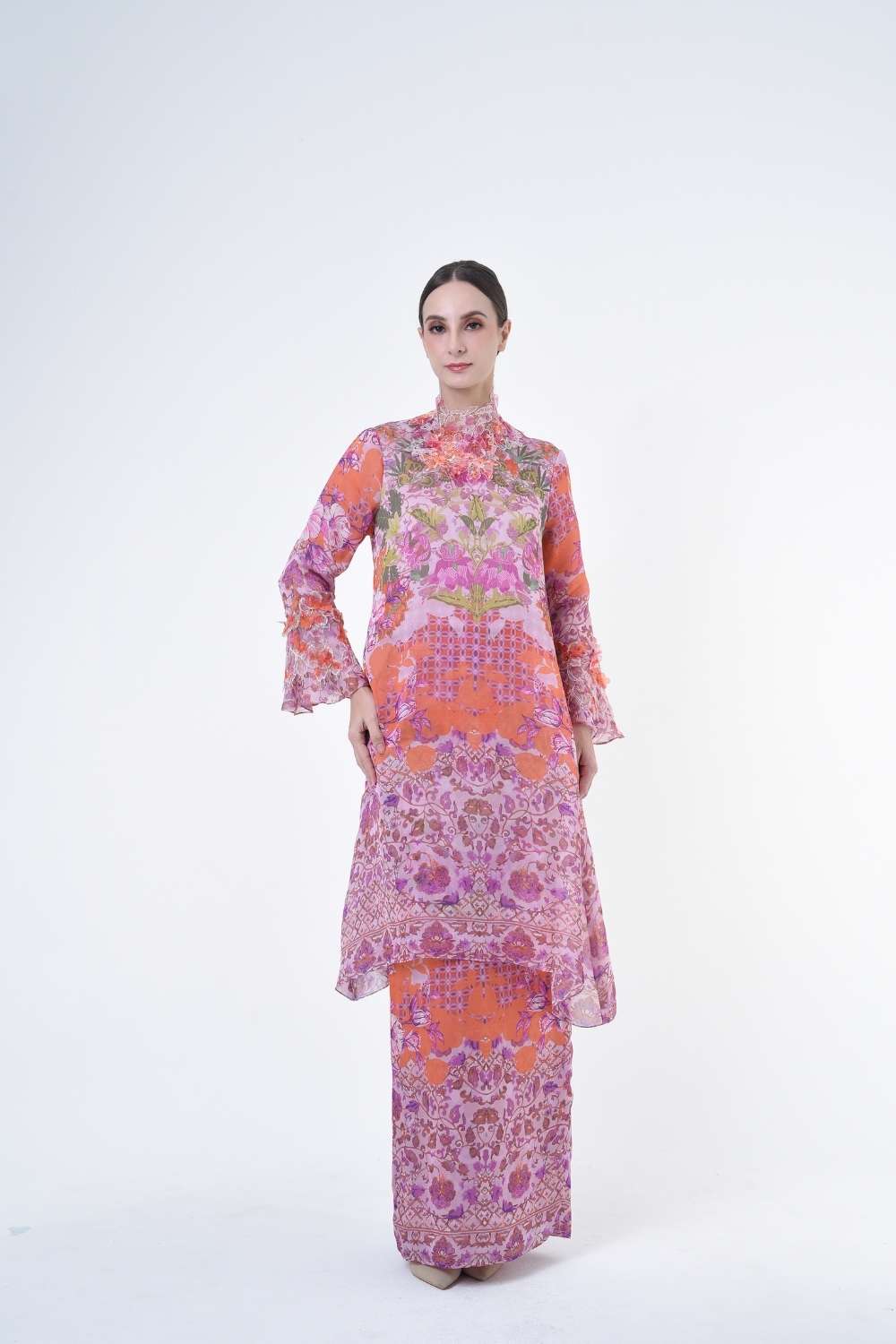 This stylish two-piece set features a loose A-cut top in the long modern Kurang style, paired with a box pleat skirt. Layered Lace details attach on bottom of sleeves with laser cut flowers enhance the beauty with diamanté with Designed with a contemporary geomatic and floral motif, it offers a fresh and versatile look, perfect for any occasion. Tailored for the confident, stylish woman, this collection exudes effortless elegance and charm