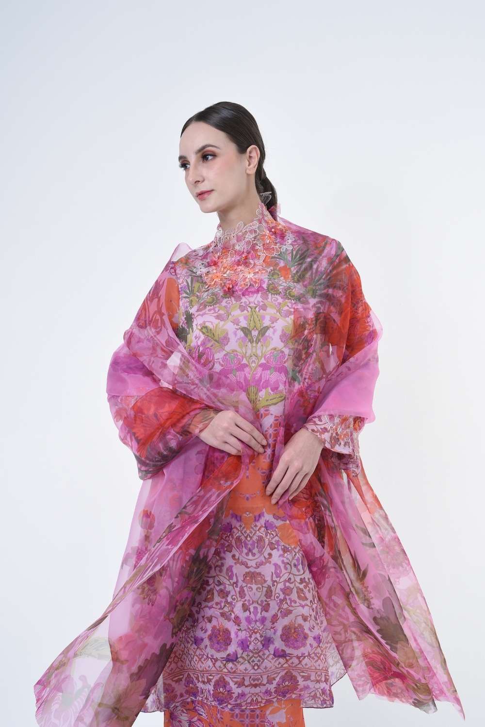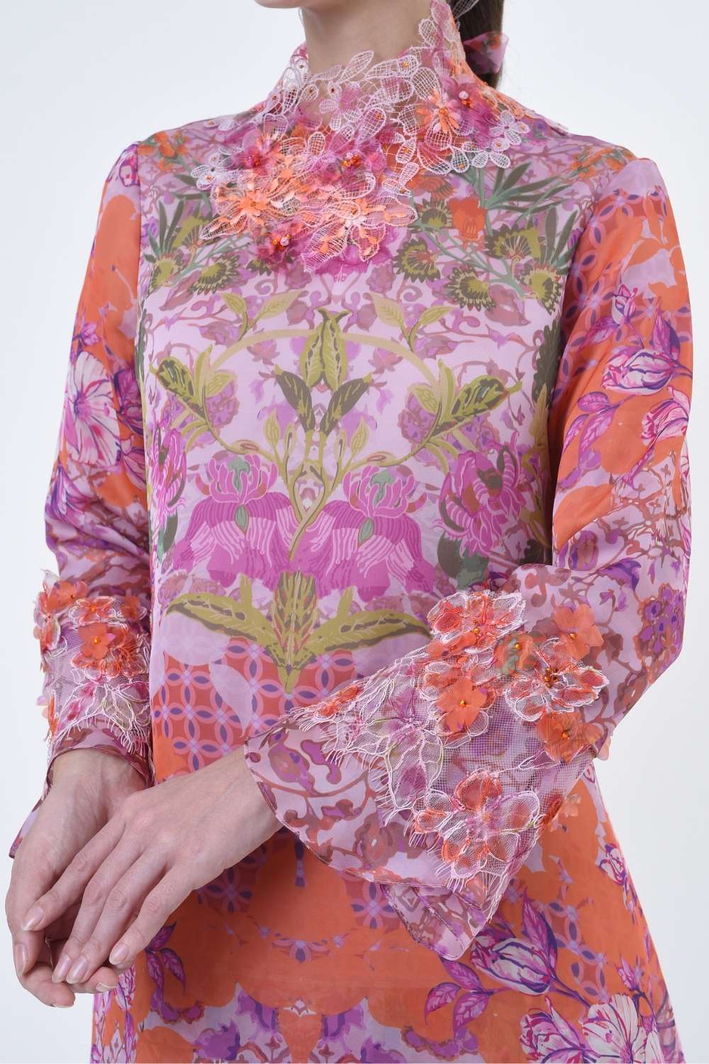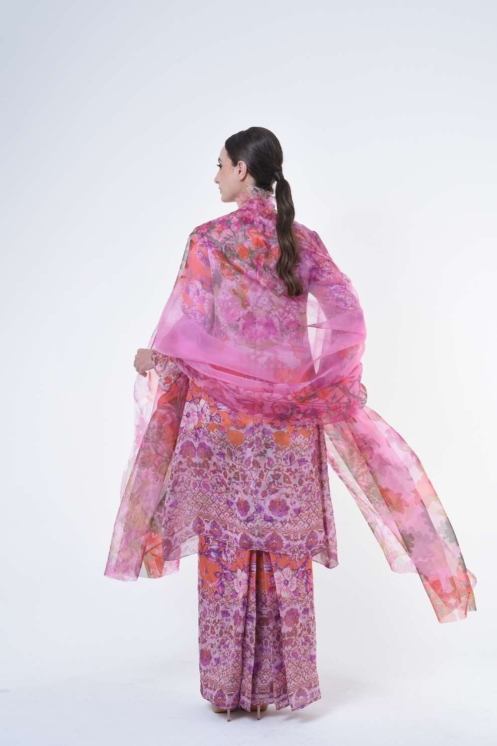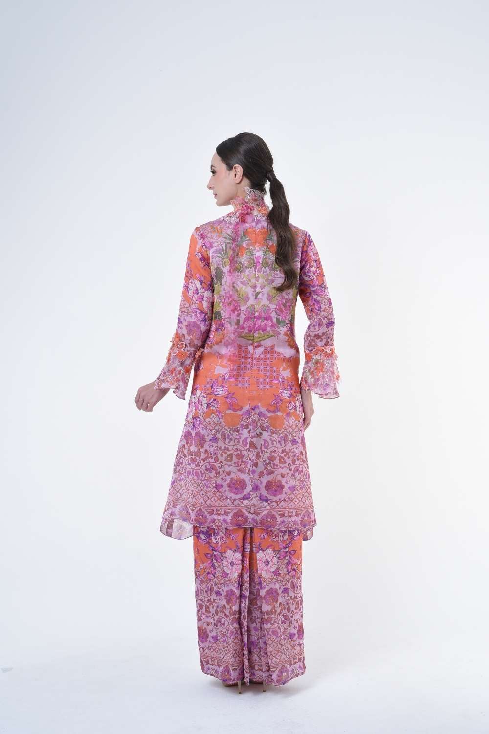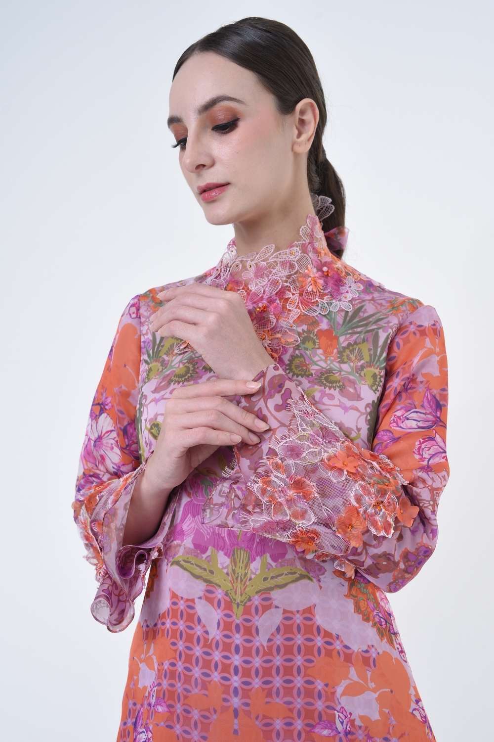 This stylish two-piece set features a loose A-cut top in the long modern Kurang style, paired with a box pleat skirt. Layered Lace details attach on bottom of sleeves with laser cut flowers enhance the beauty with diamanté with Designed with a contemporary geomatic and floral motif, it offers a fresh and versatile look, perfect for any occasion. Tailored for the confident, stylish woman, this collection exudes effortless elegance and charm