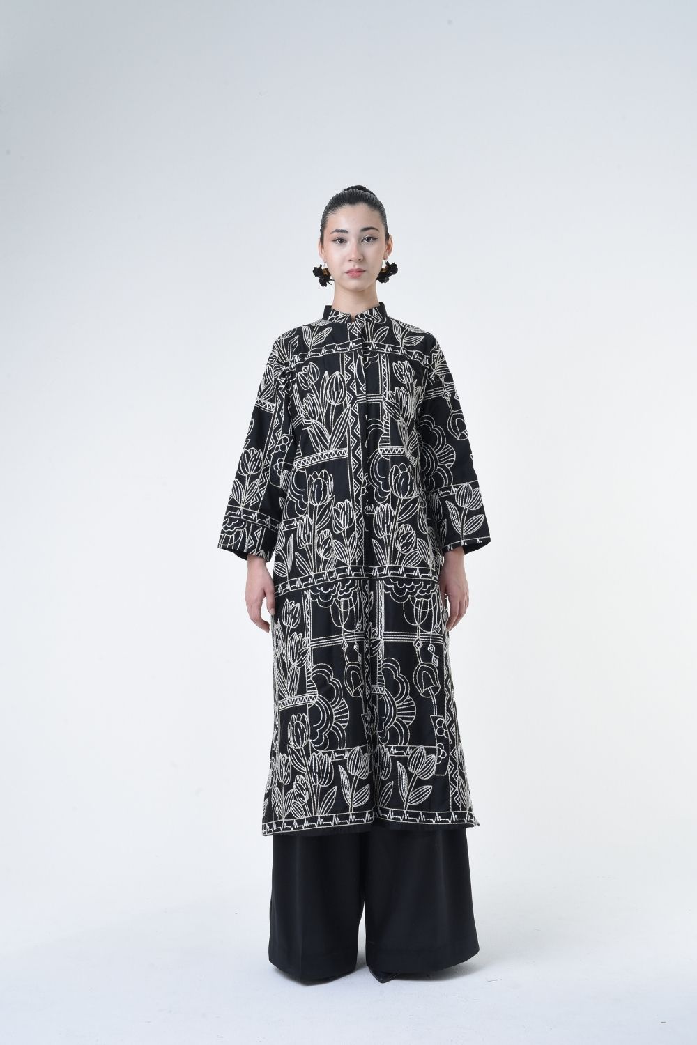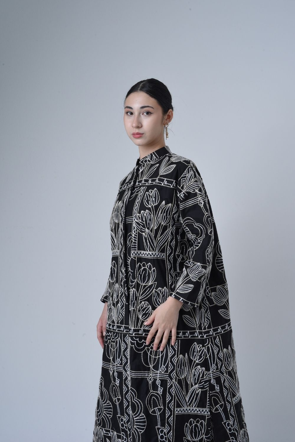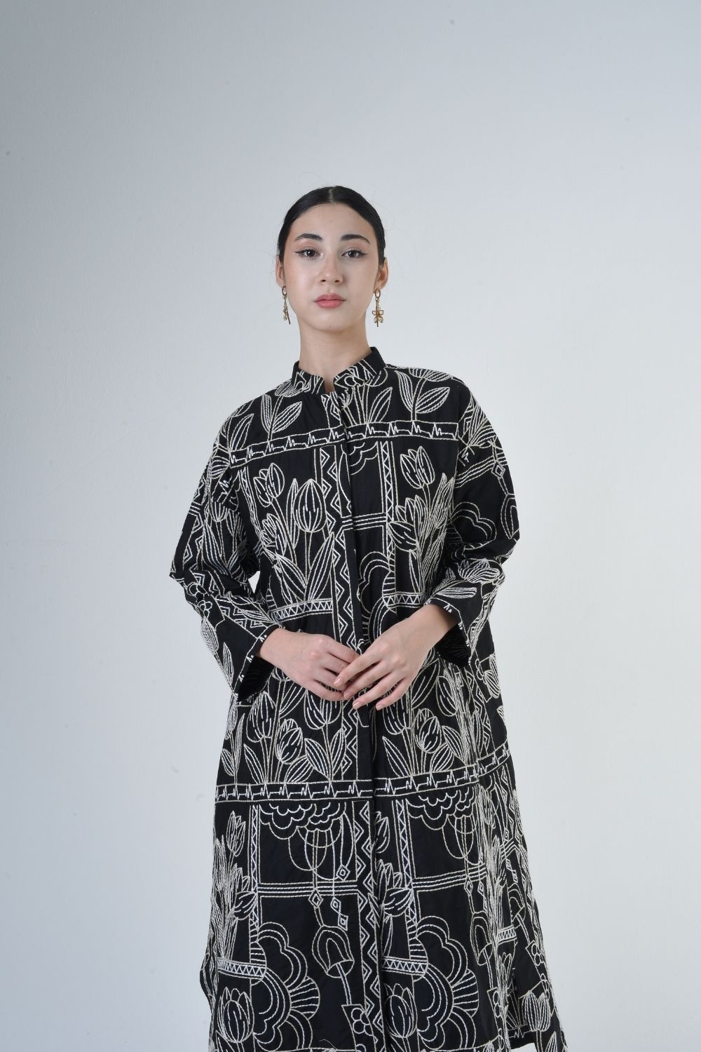 This elegant black embroidered cotton long tunic, featuring intricate white thread floral and geometric embroidery. The detailed needlework adds a touch of sophistication and artistry to a timeless silhouette.