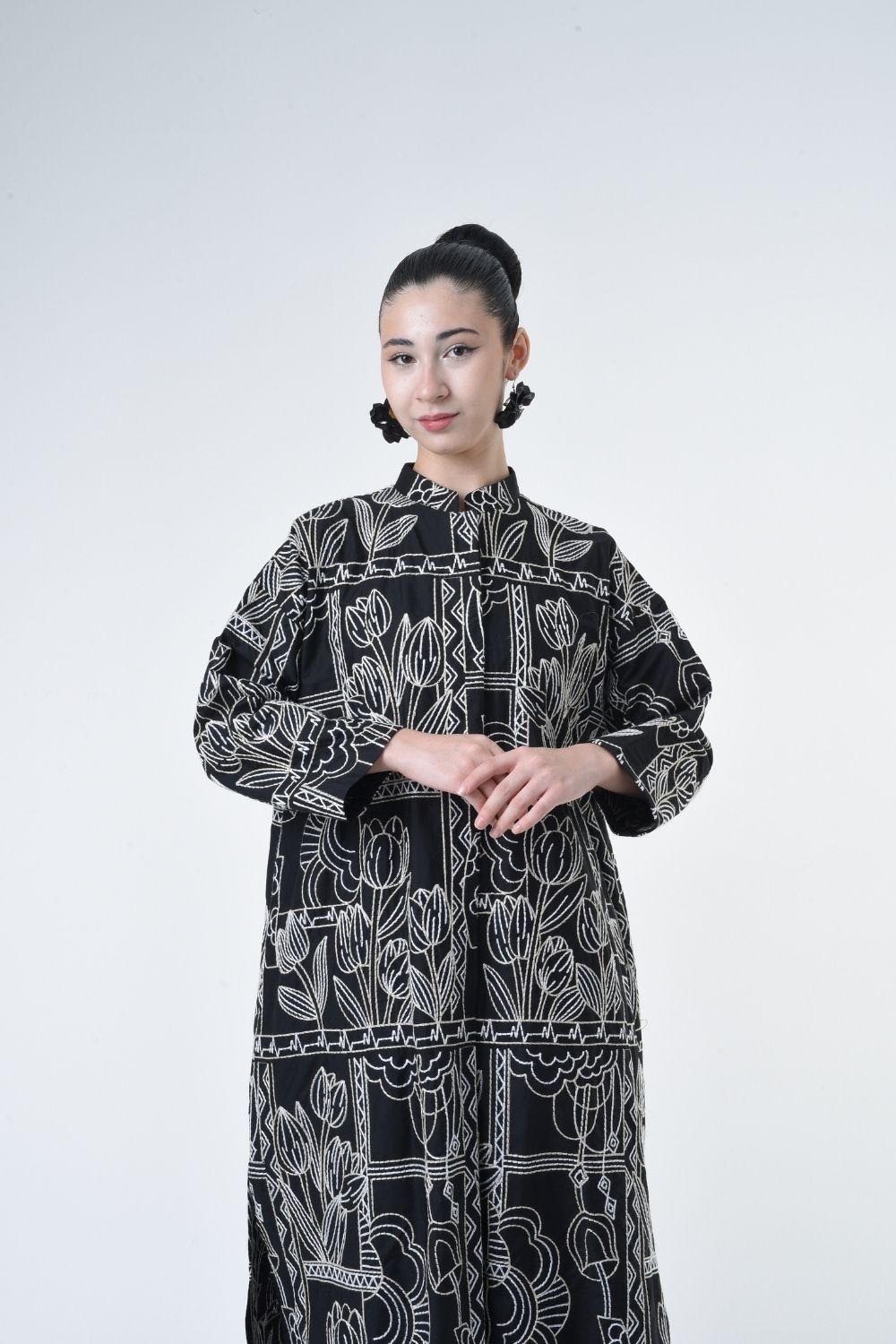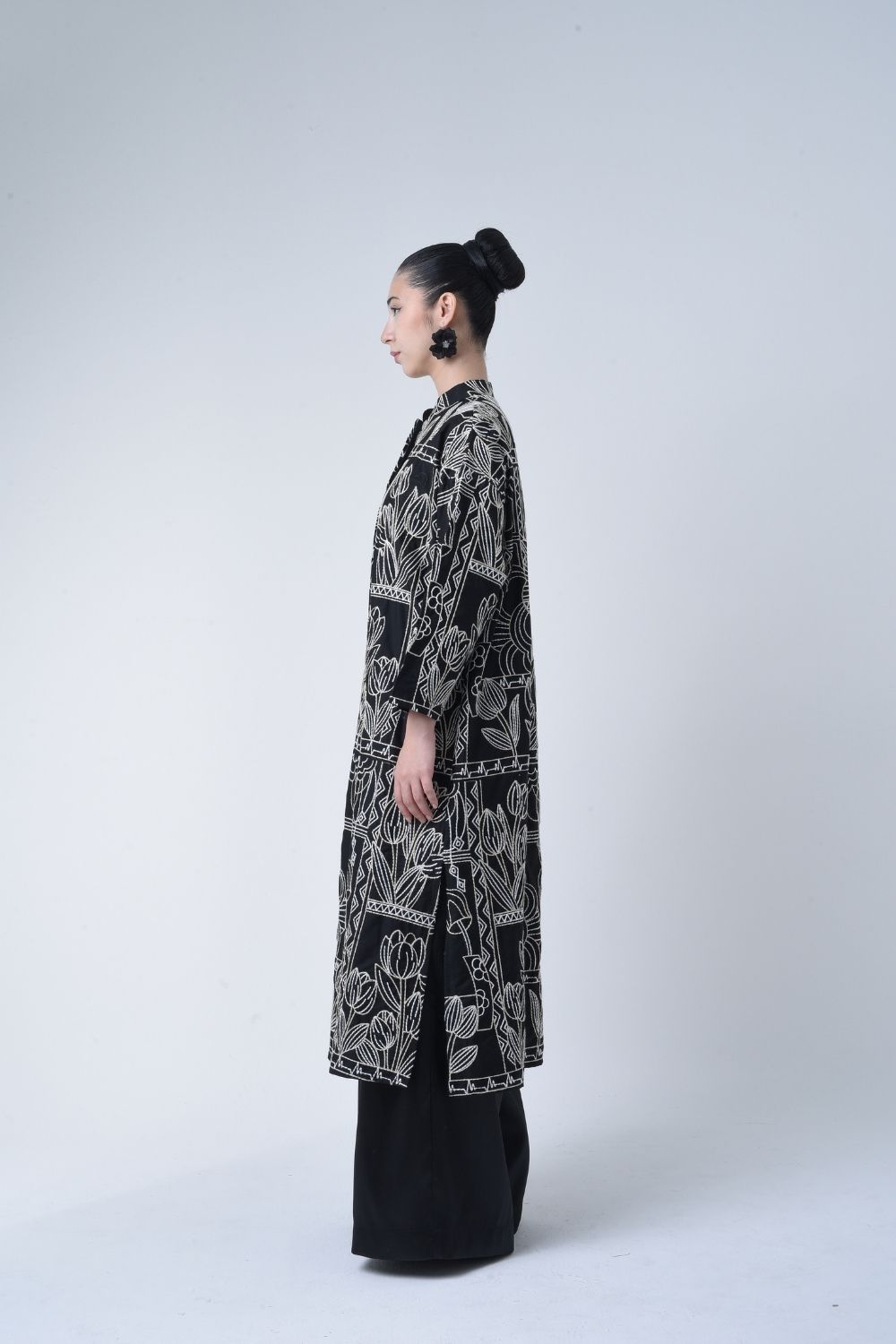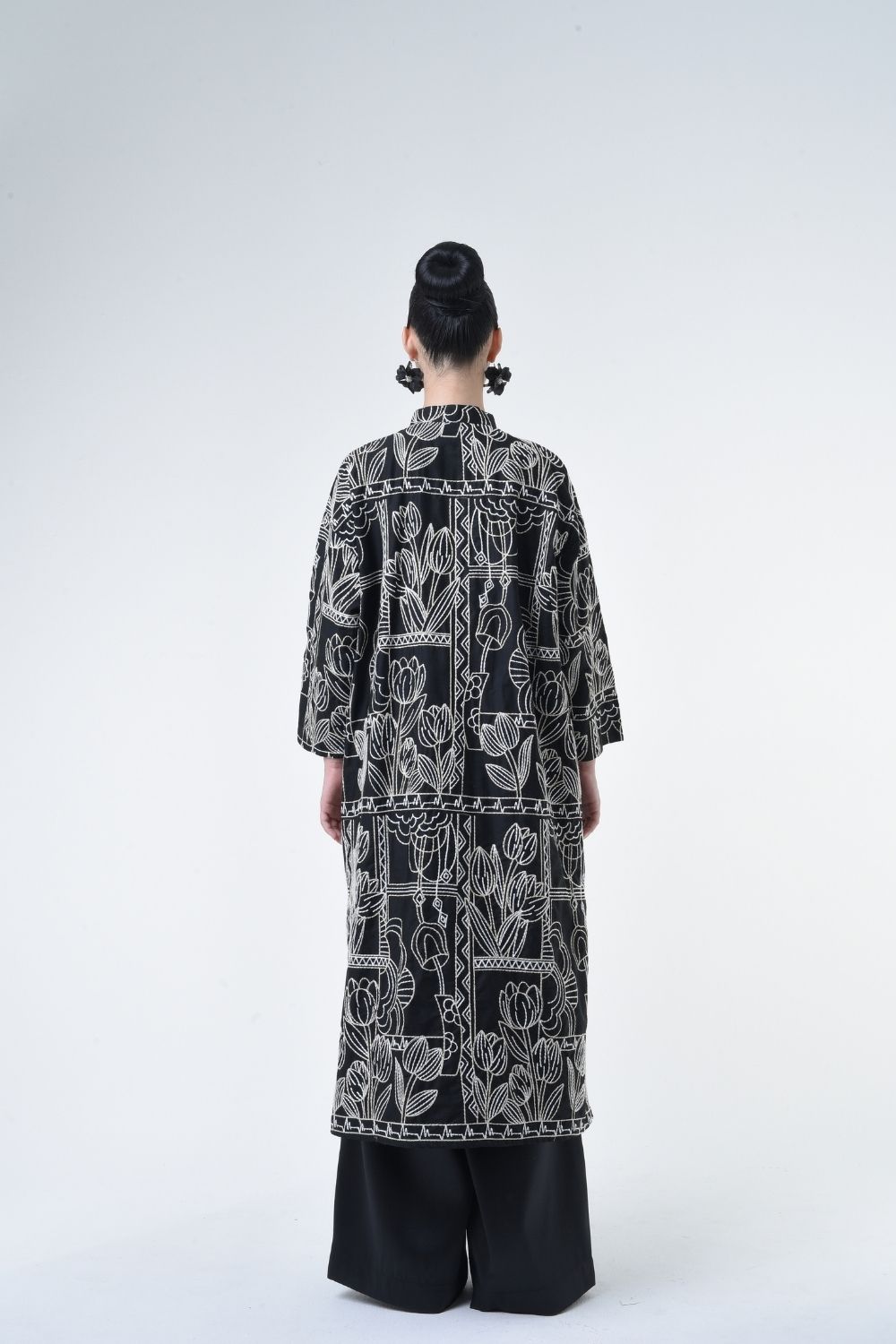 This elegant black embroidered cotton long tunic, featuring intricate white thread floral and geometric embroidery. The detailed needlework adds a touch of sophistication and artistry to a timeless silhouette.