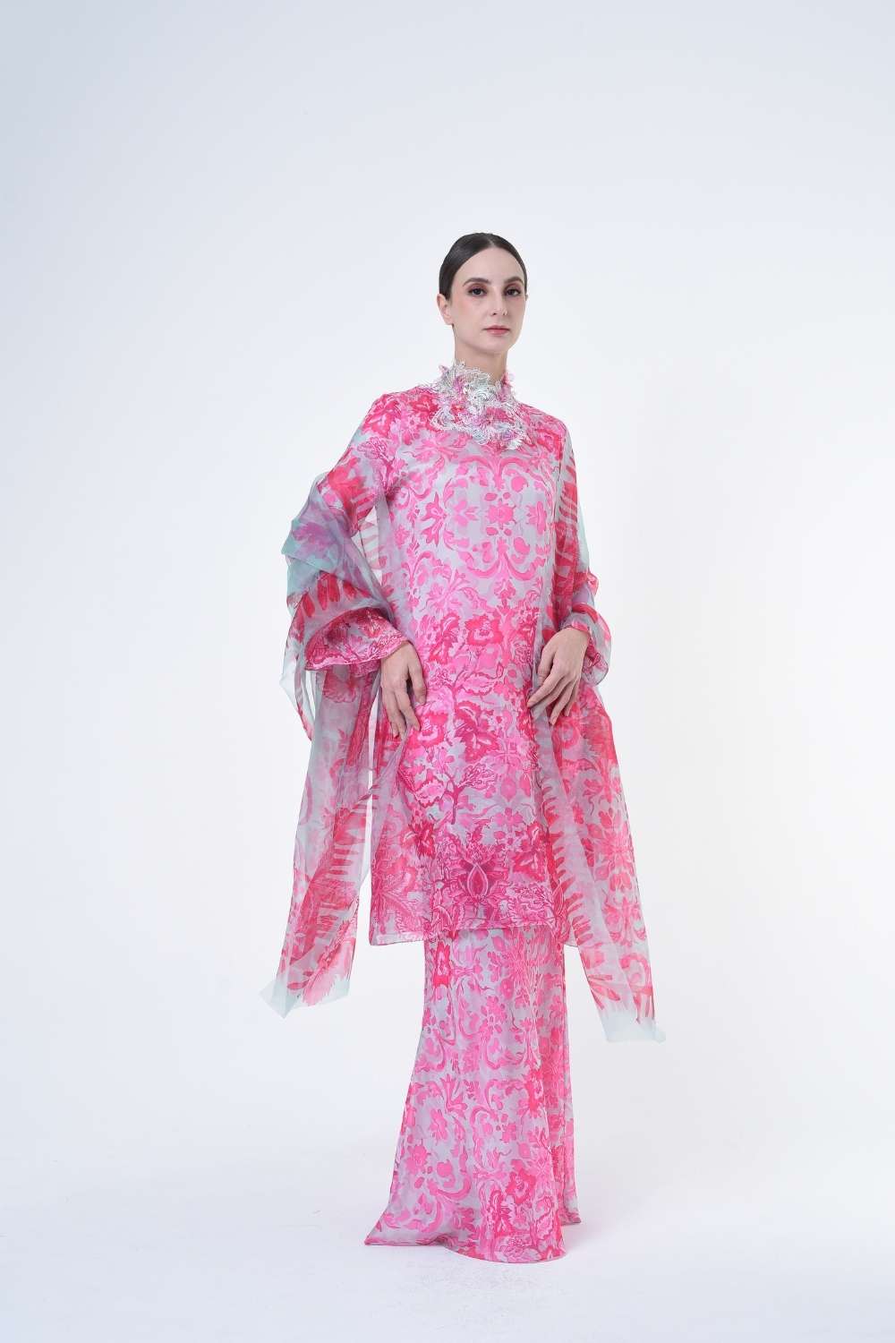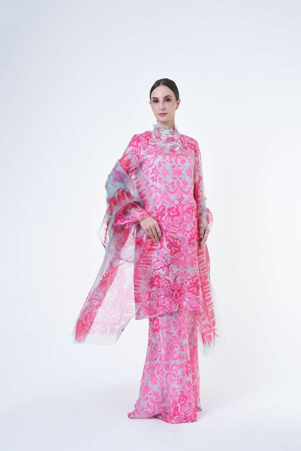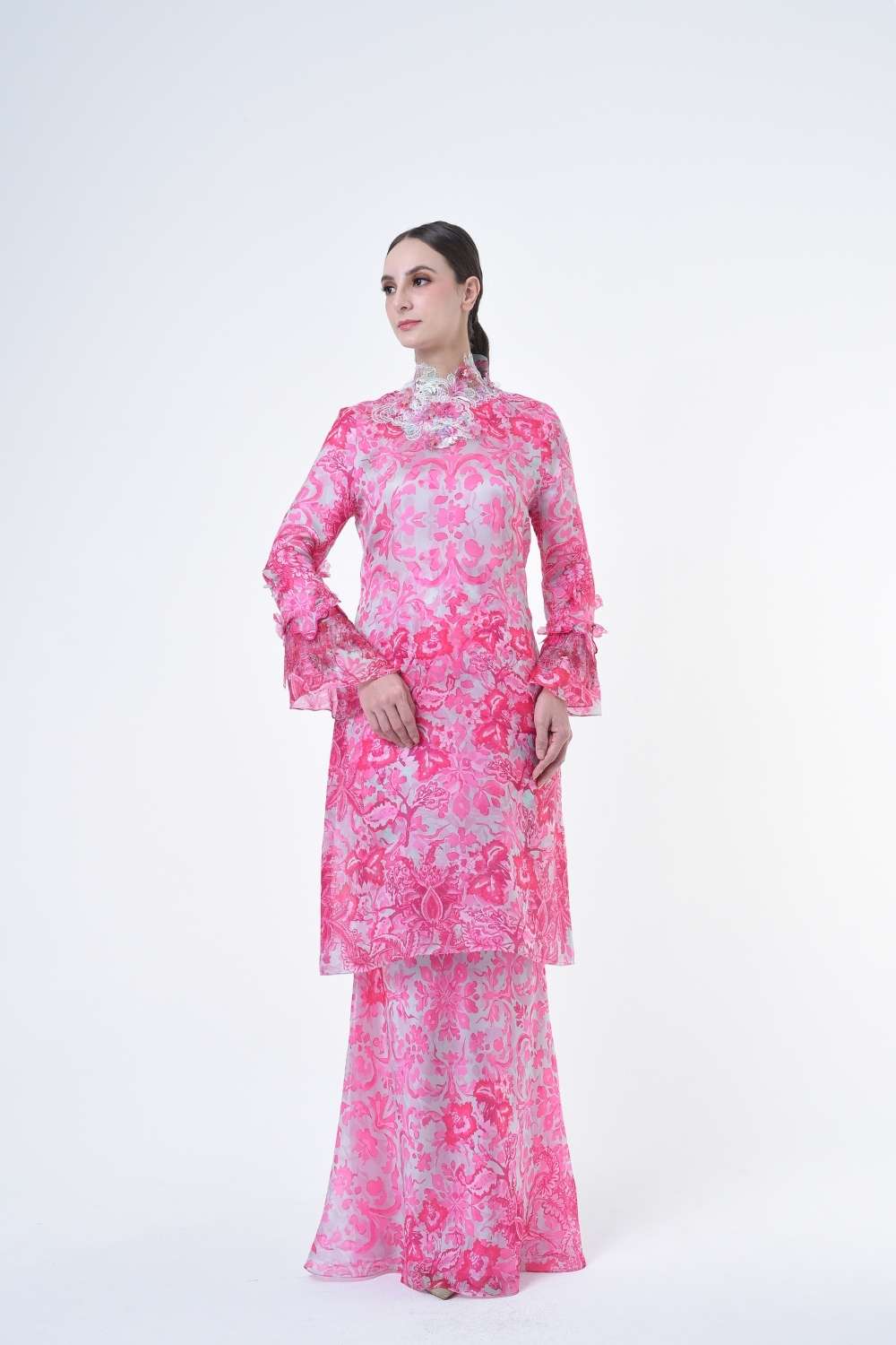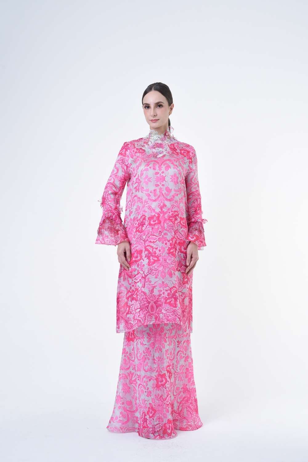 This stylish two-piece set features a loose A-cut top in the long modern Kurang style, paired with a bias cut skirt. Embroidery edge finishing , Layered Lace details attach on bottom of sleeves with laser cut flowers enhance the beauty with diamanté with Designed with a contemporary geomatic and floral motif, it offers a fresh and versatile look, perfect for any occasion. Tailored for the confident, stylish woman, this collection exudes effortless elegance and charm
