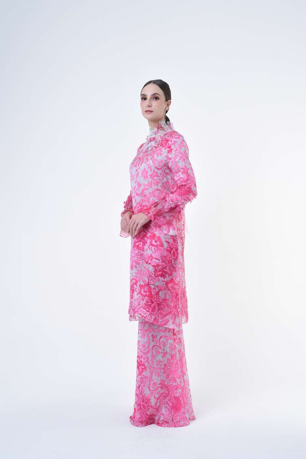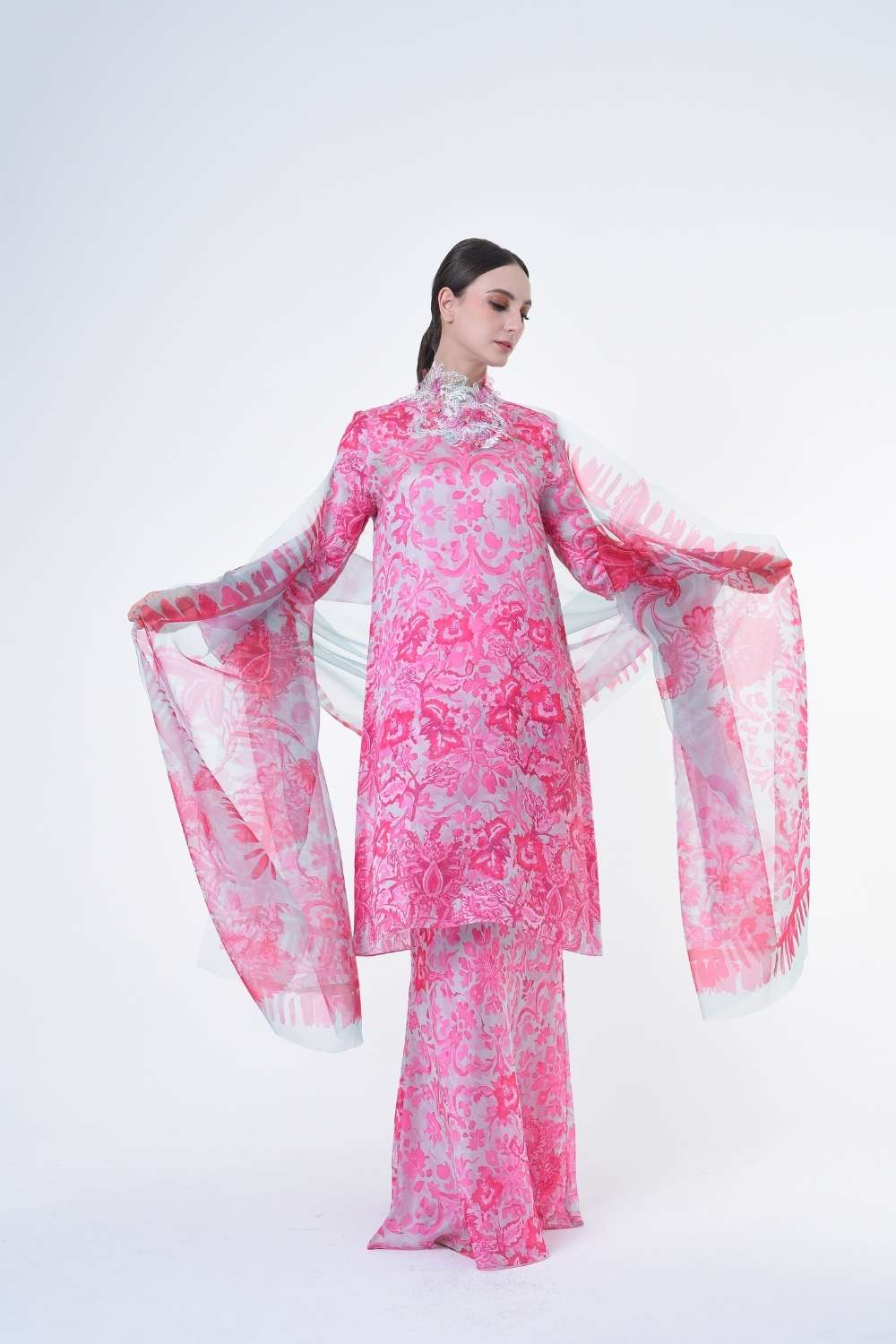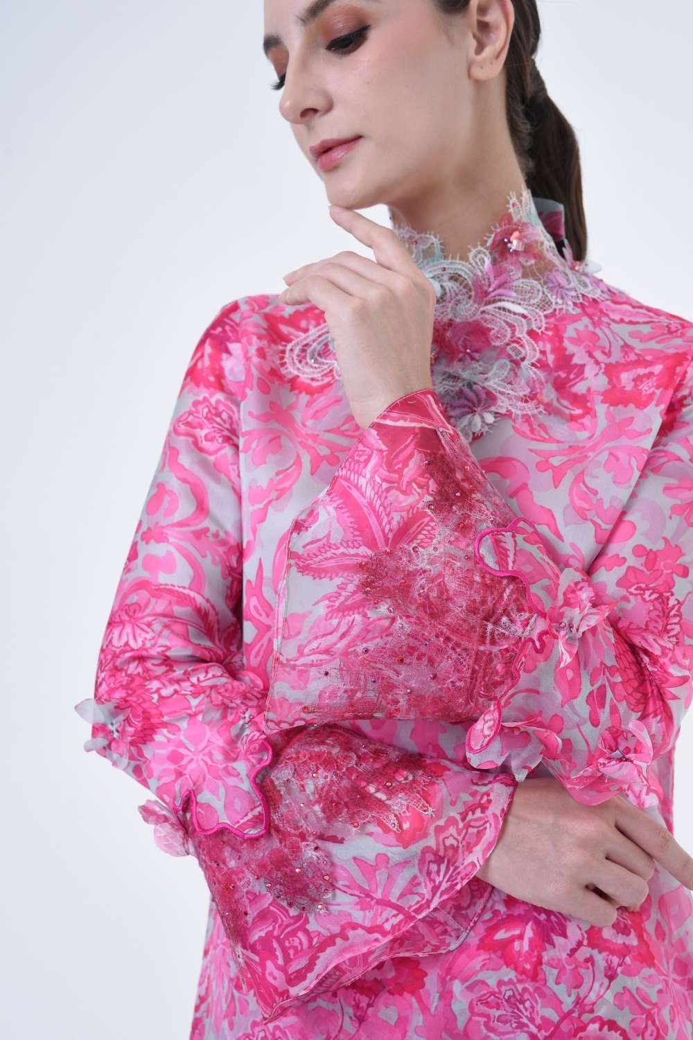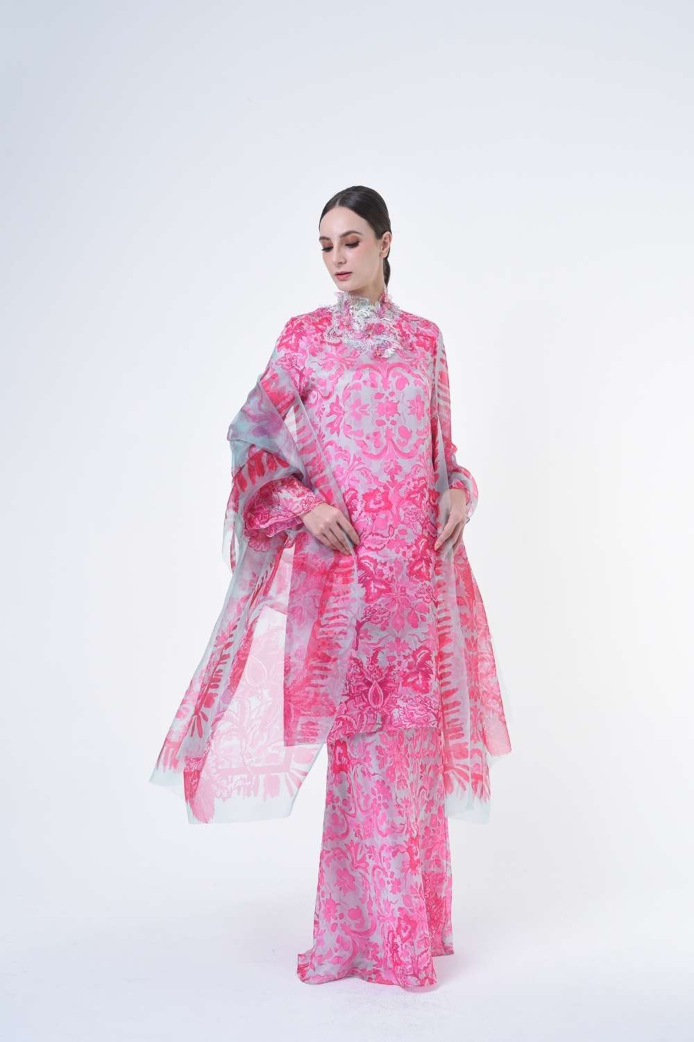 This stylish two-piece set features a loose A-cut top in the long modern Kurang style, paired with a bias cut skirt. Embroidery edge finishing , Layered Lace details attach on bottom of sleeves with laser cut flowers enhance the beauty with diamanté with Designed with a contemporary geomatic and floral motif, it offers a fresh and versatile look, perfect for any occasion. Tailored for the confident, stylish woman, this collection exudes effortless elegance and charm