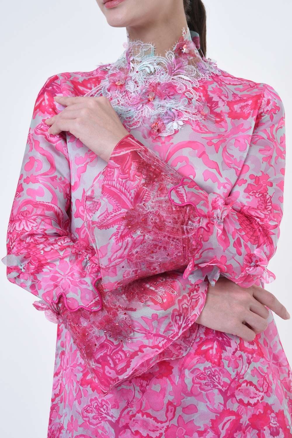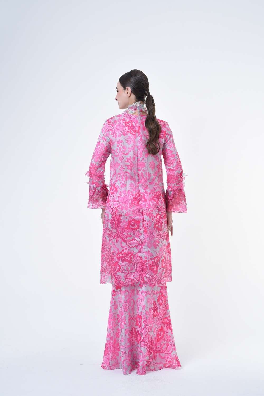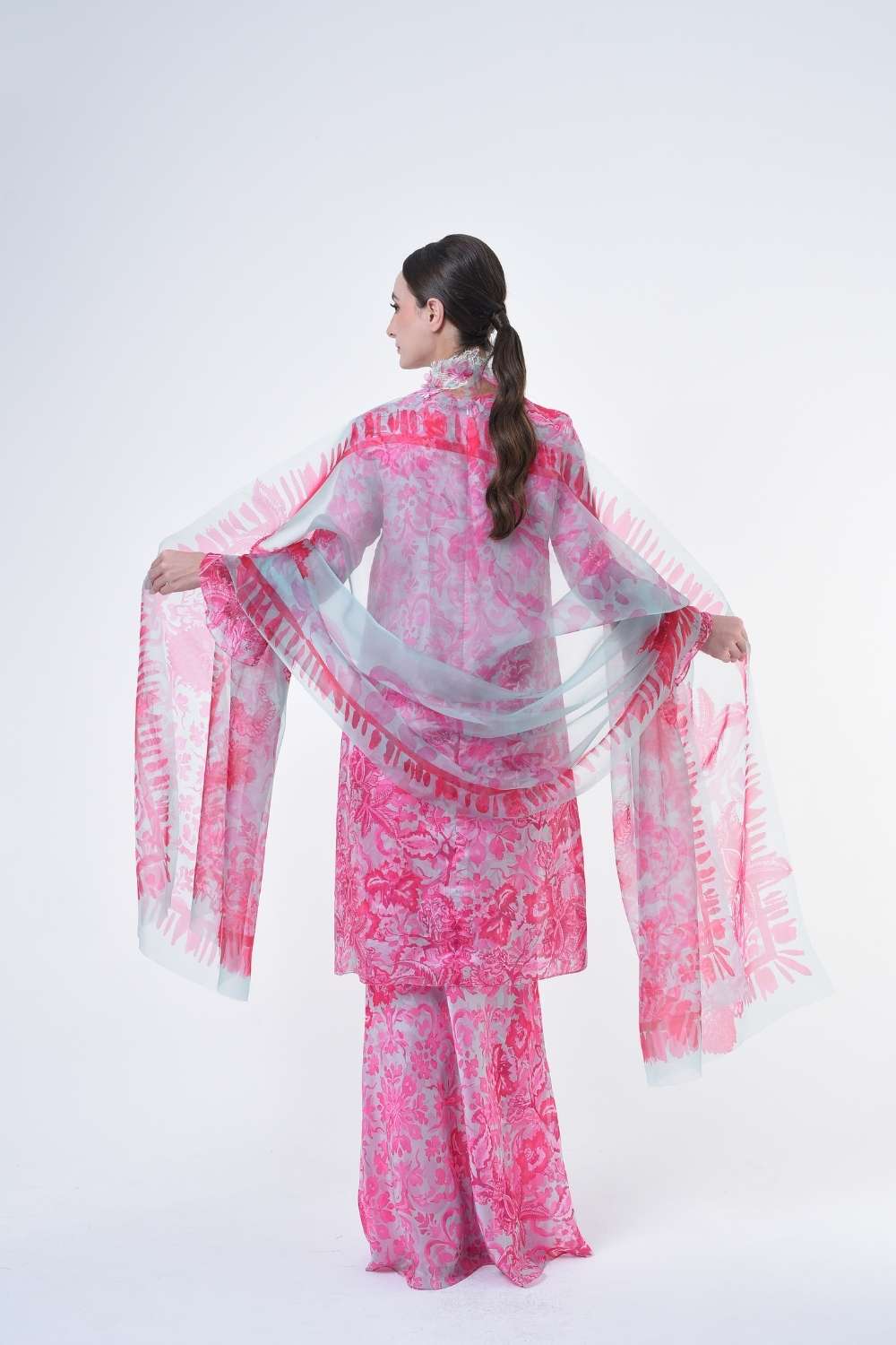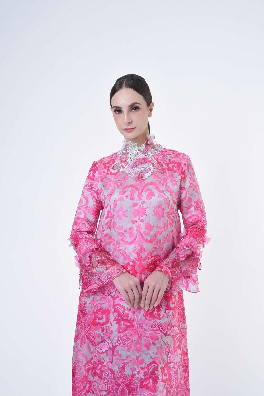 This stylish two-piece set features a loose A-cut top in the long modern Kurang style, paired with a bias cut skirt. Embroidery edge finishing , Layered Lace details attach on bottom of sleeves with laser cut flowers enhance the beauty with diamanté with Designed with a contemporary geomatic and floral motif, it offers a fresh and versatile look, perfect for any occasion. Tailored for the confident, stylish woman, this collection exudes effortless elegance and charm