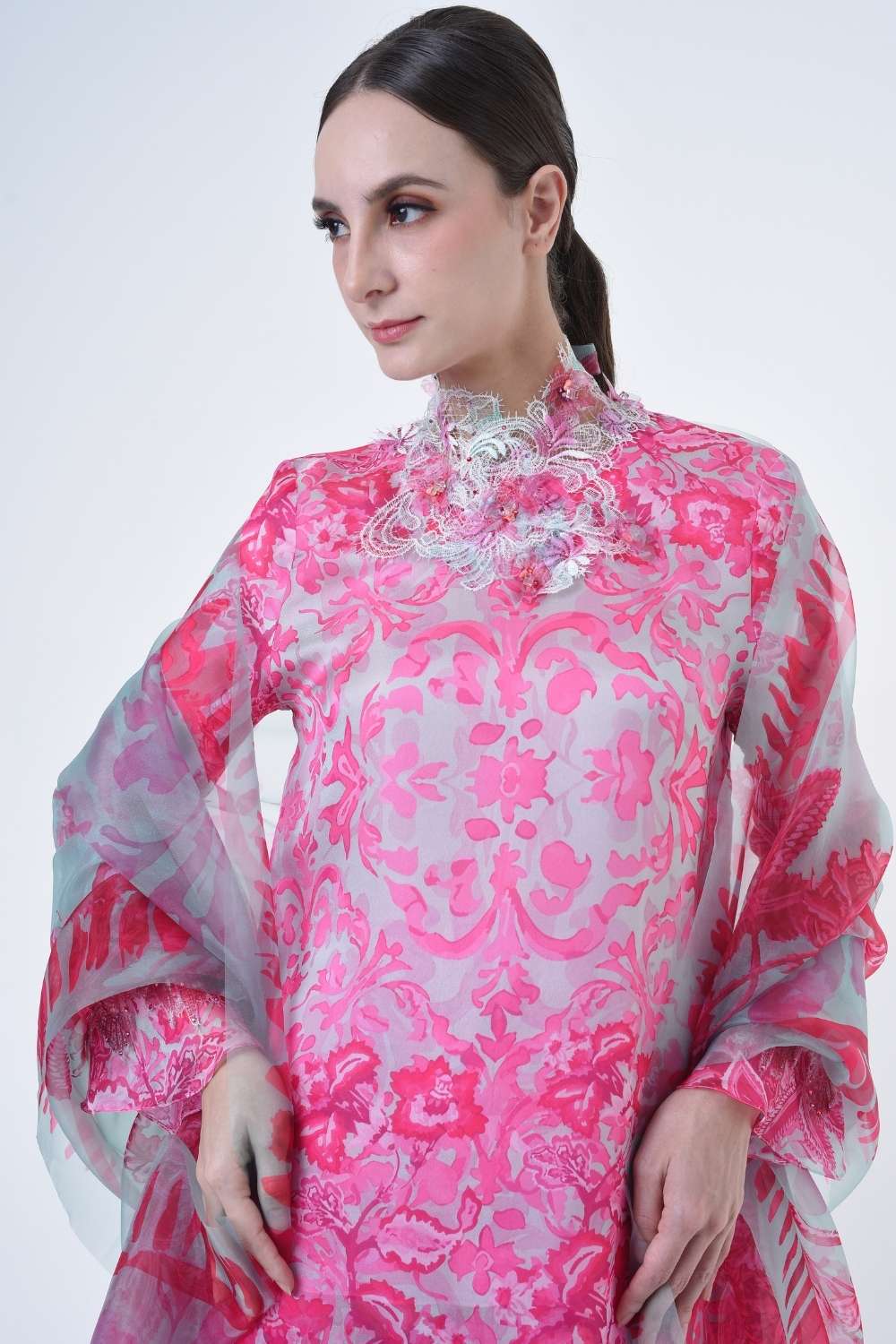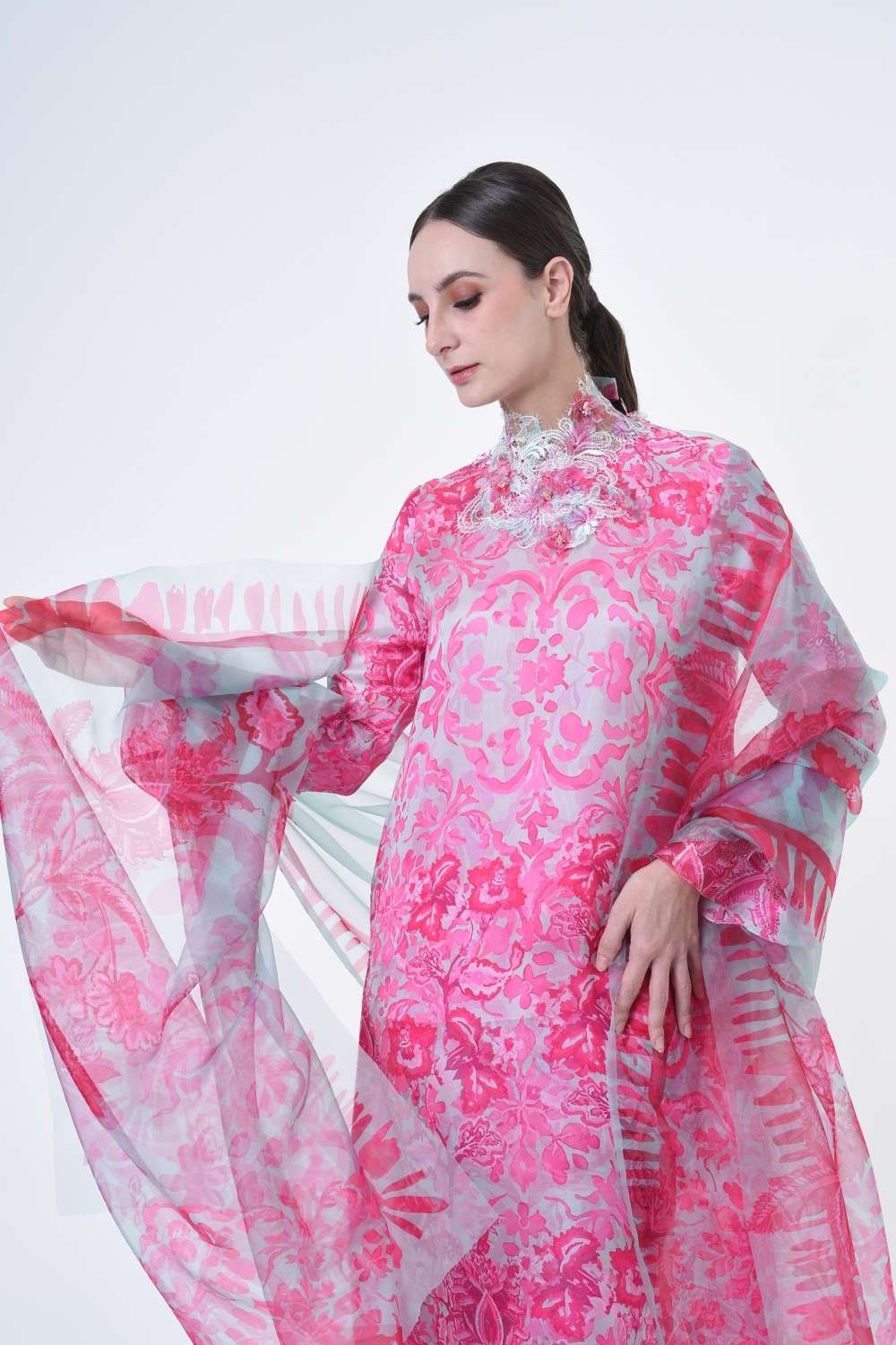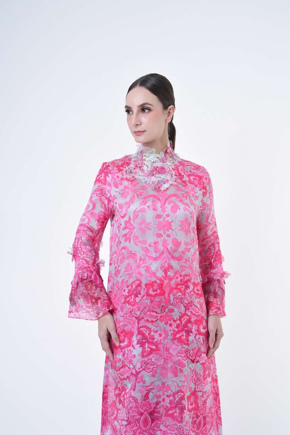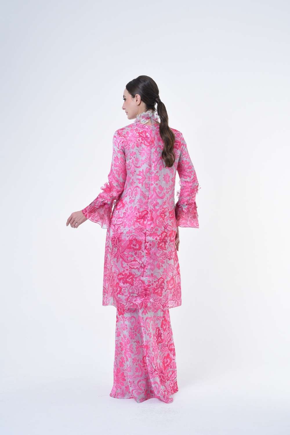 This stylish two-piece set features a loose A-cut top in the long modern Kurang style, paired with a bias cut skirt. Embroidery edge finishing , Layered Lace details attach on bottom of sleeves with laser cut flowers enhance the beauty with diamanté with Designed with a contemporary geomatic and floral motif, it offers a fresh and versatile look, perfect for any occasion. Tailored for the confident, stylish woman, this collection exudes effortless elegance and charm