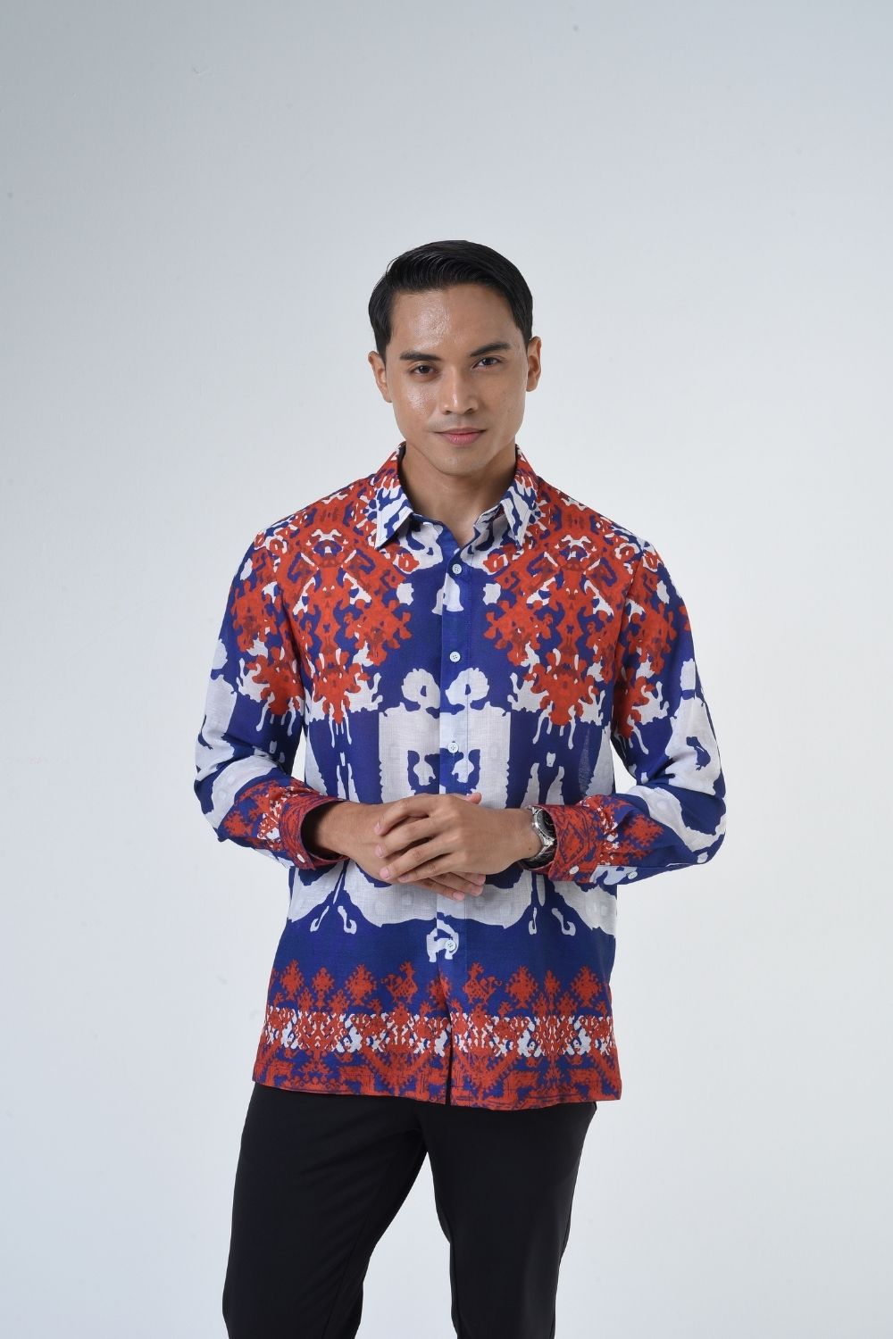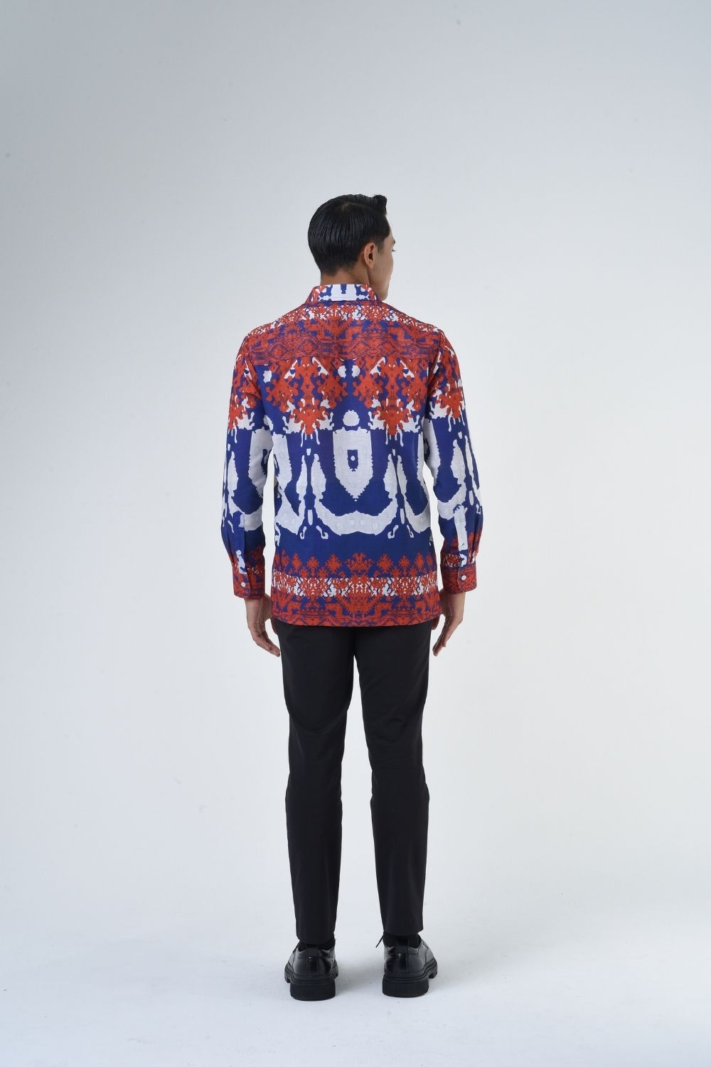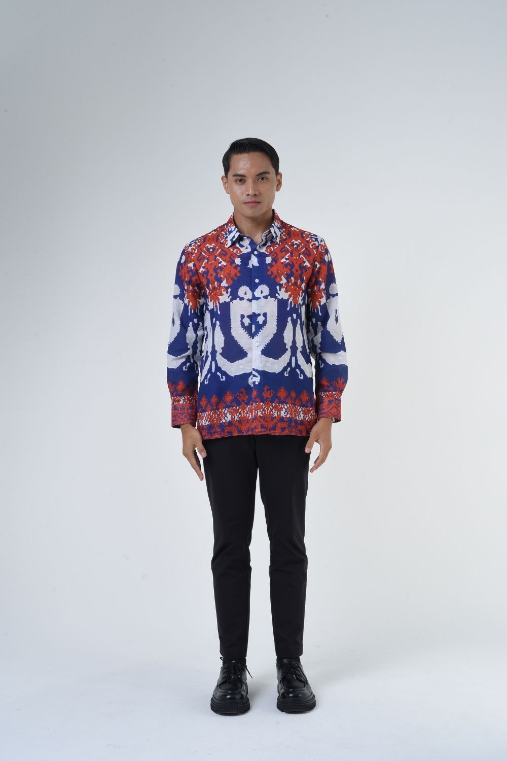 This relaxes cut men’s long sleeve batik shirt features intricate ethnic patterns. Its tailored fit makes it versatile for formal occasions, creating a striking statement piece that celebrates cultural heritage.