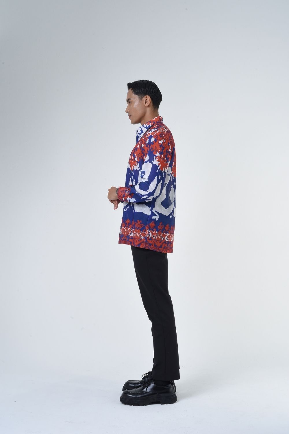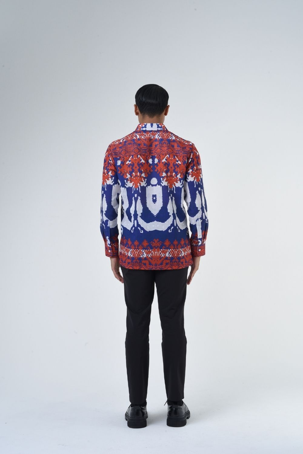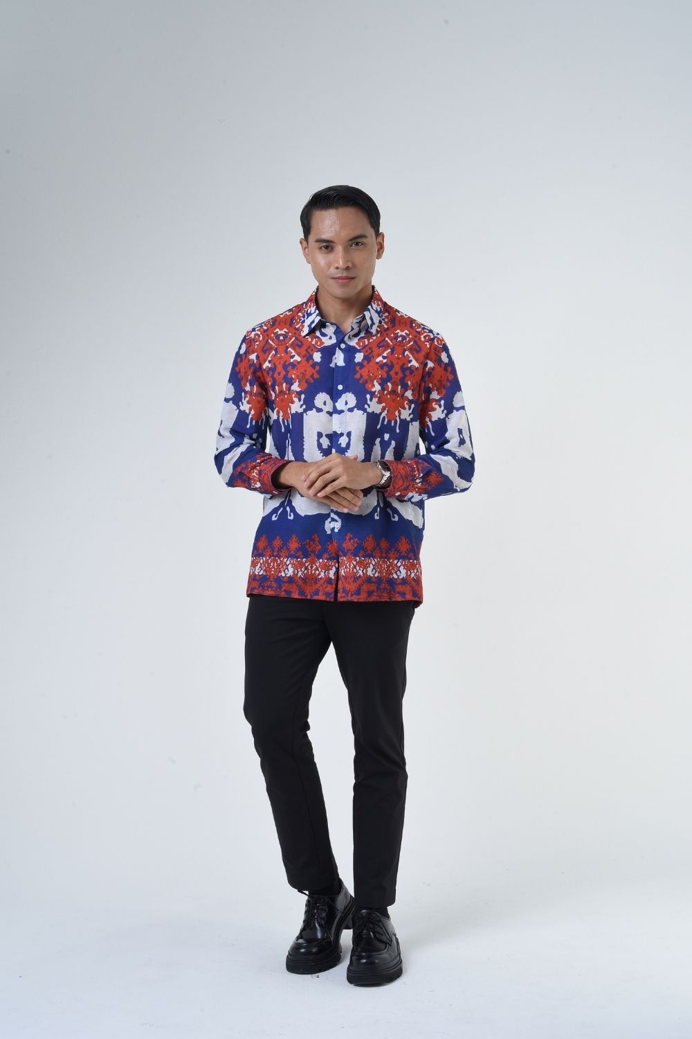 This relaxes cut men’s long sleeve batik shirt features intricate ethnic patterns. Its tailored fit makes it versatile for formal occasions, creating a striking statement piece that celebrates cultural heritage.