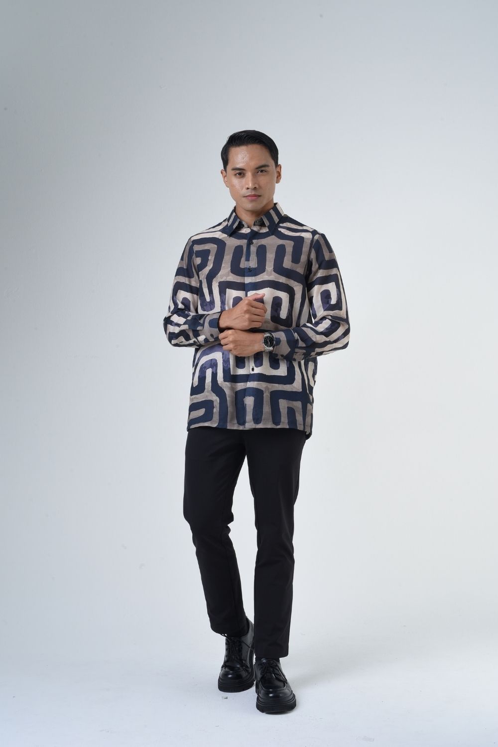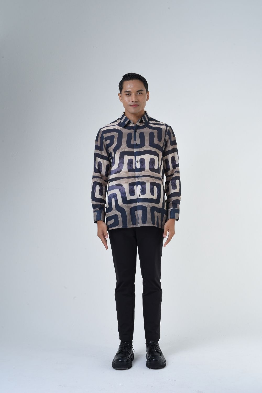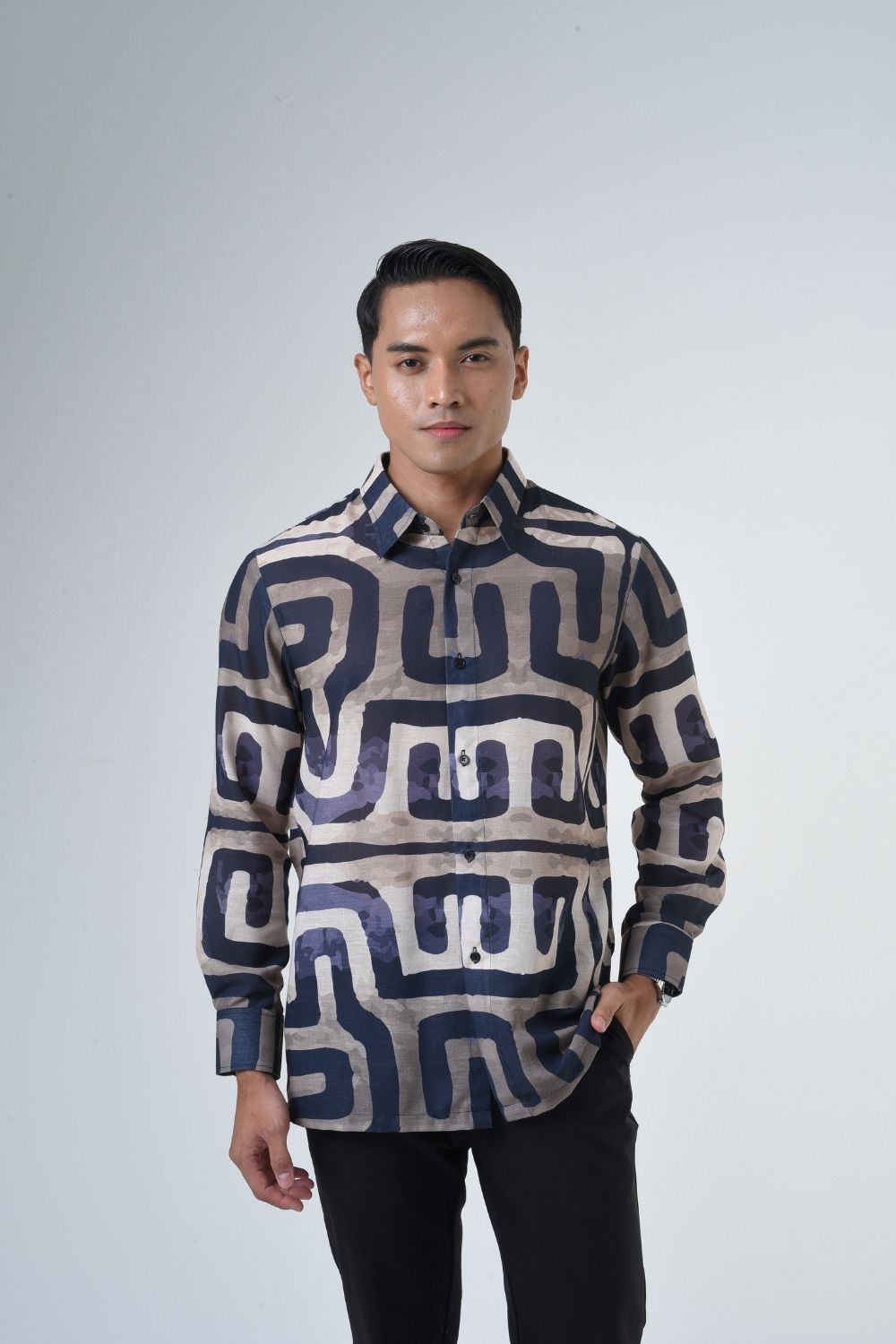 This relaxes cut men’s long sleeve batik shirt features intricate geometric patterns. Its tailored fit makes it versatile for formal occasions, creating a striking statement piece that celebrates cultural heritage.