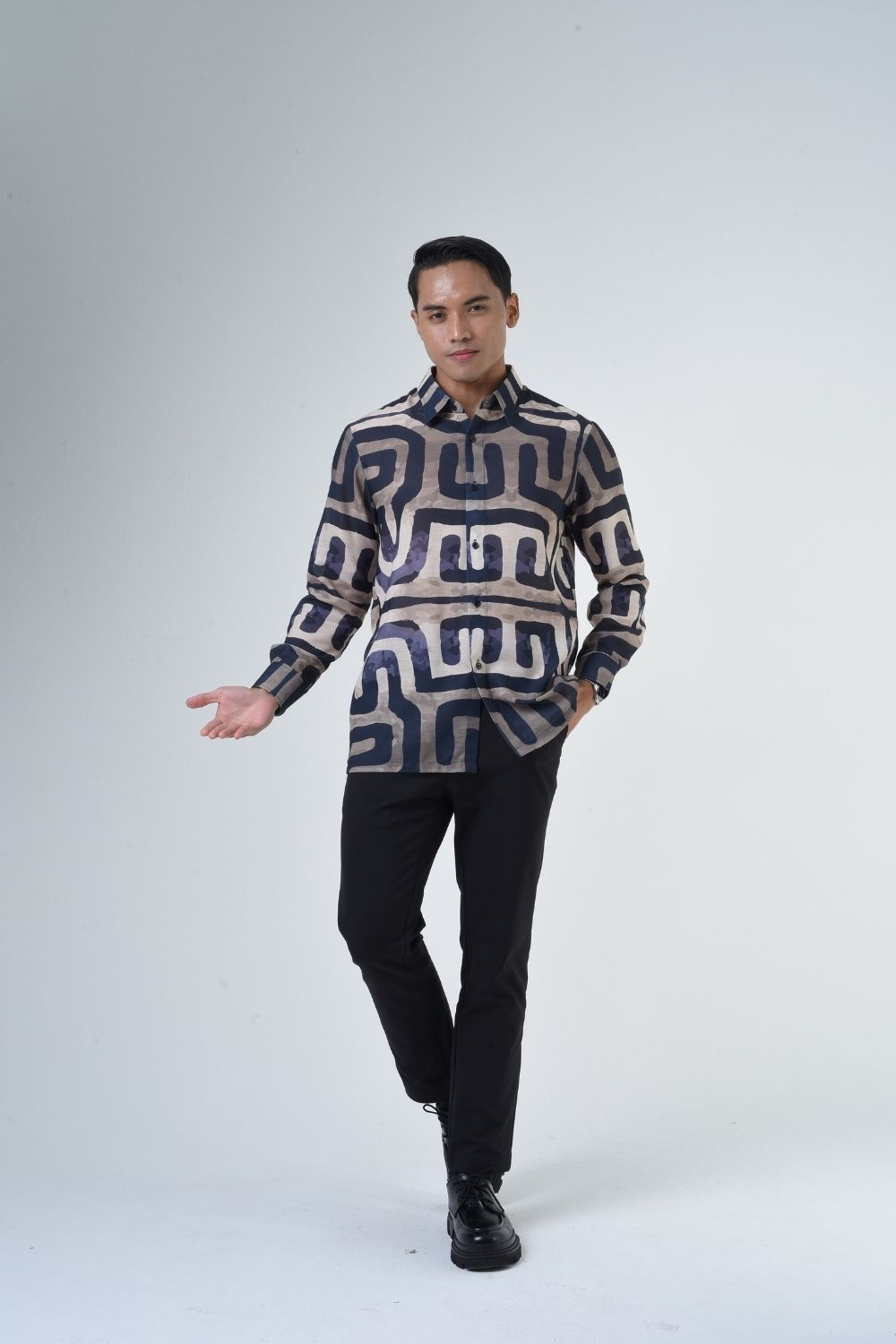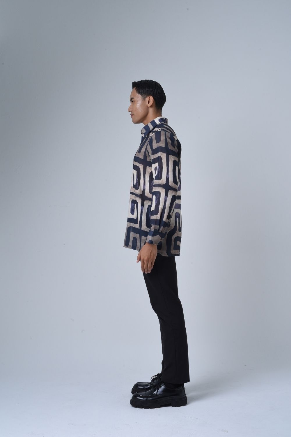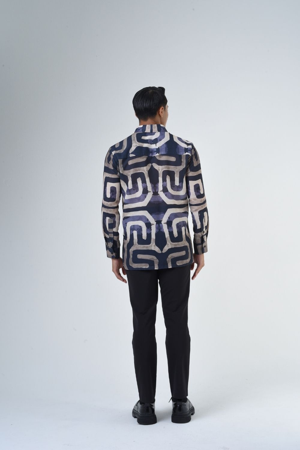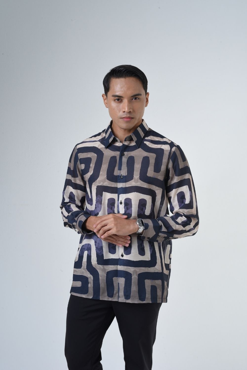 This relaxes cut men’s long sleeve batik shirt features intricate geometric patterns. Its tailored fit makes it versatile for formal occasions, creating a striking statement piece that celebrates cultural heritage.