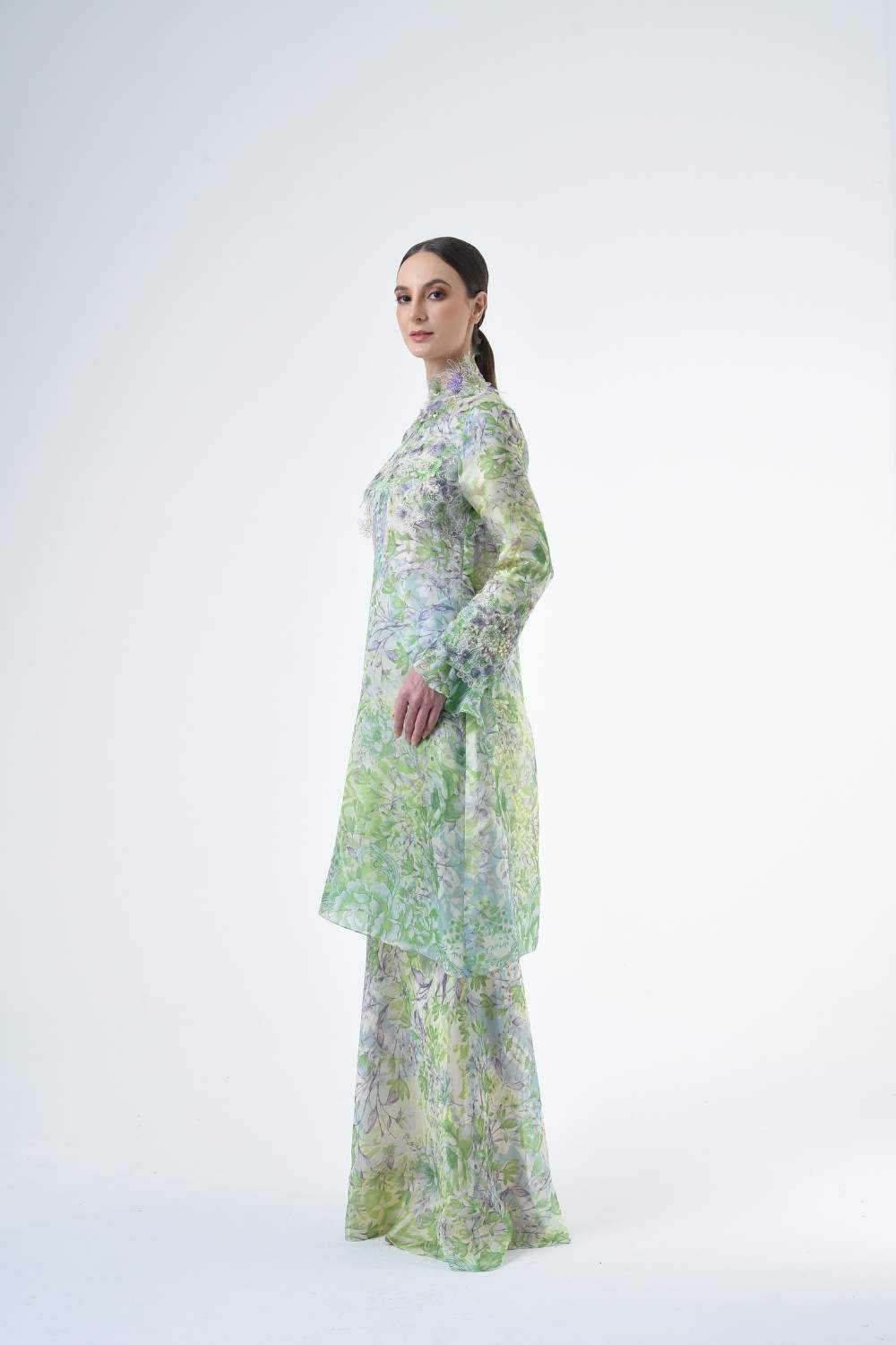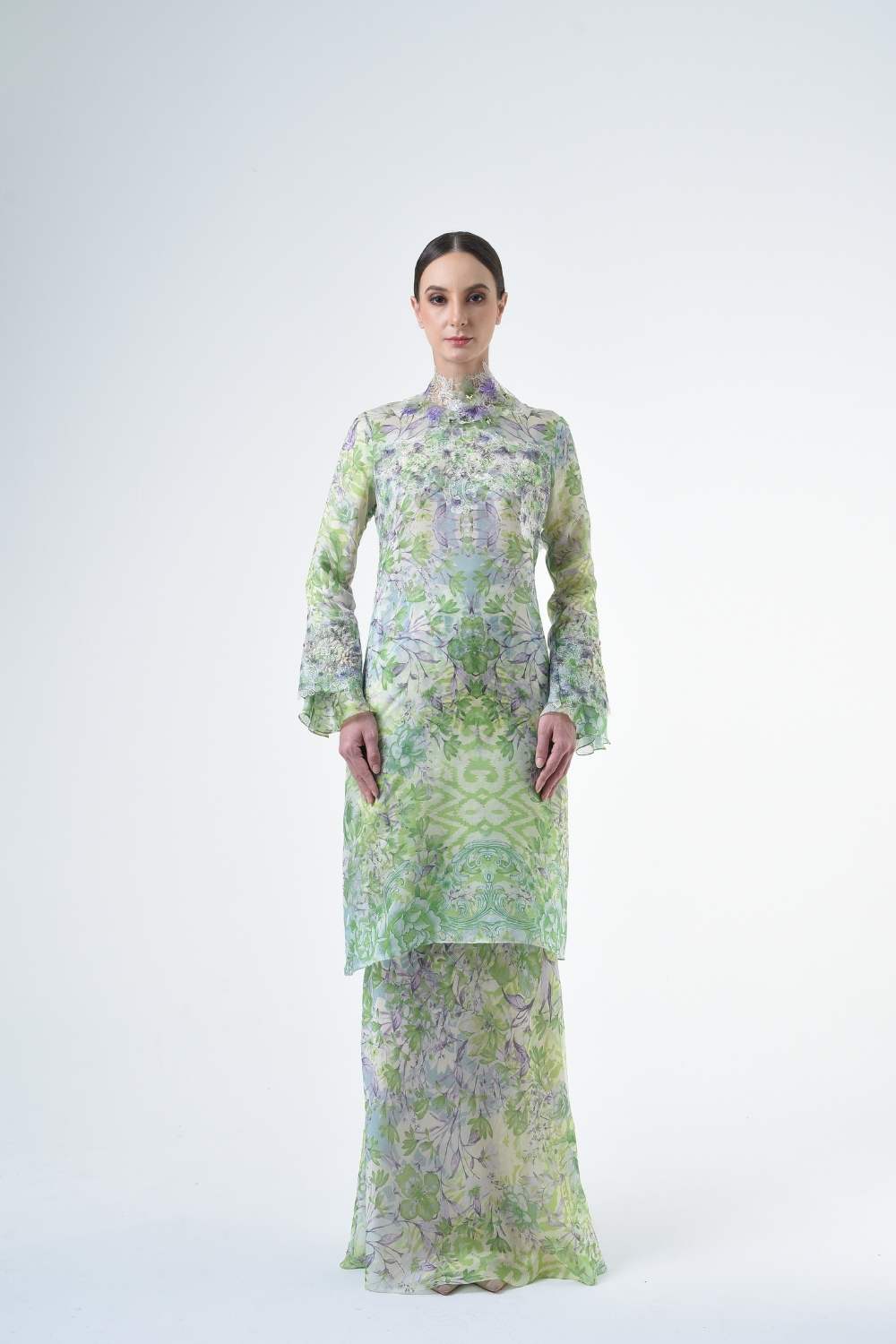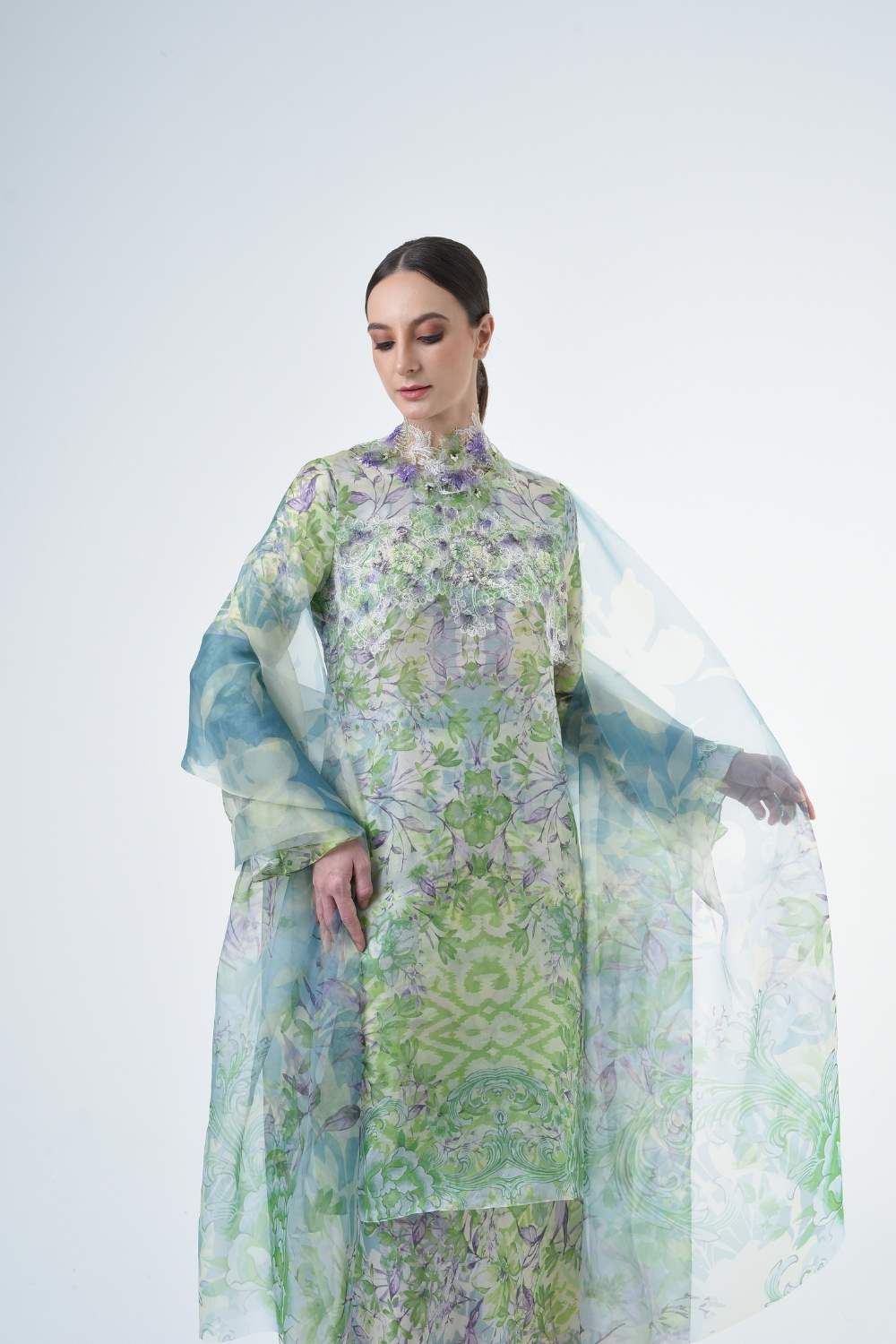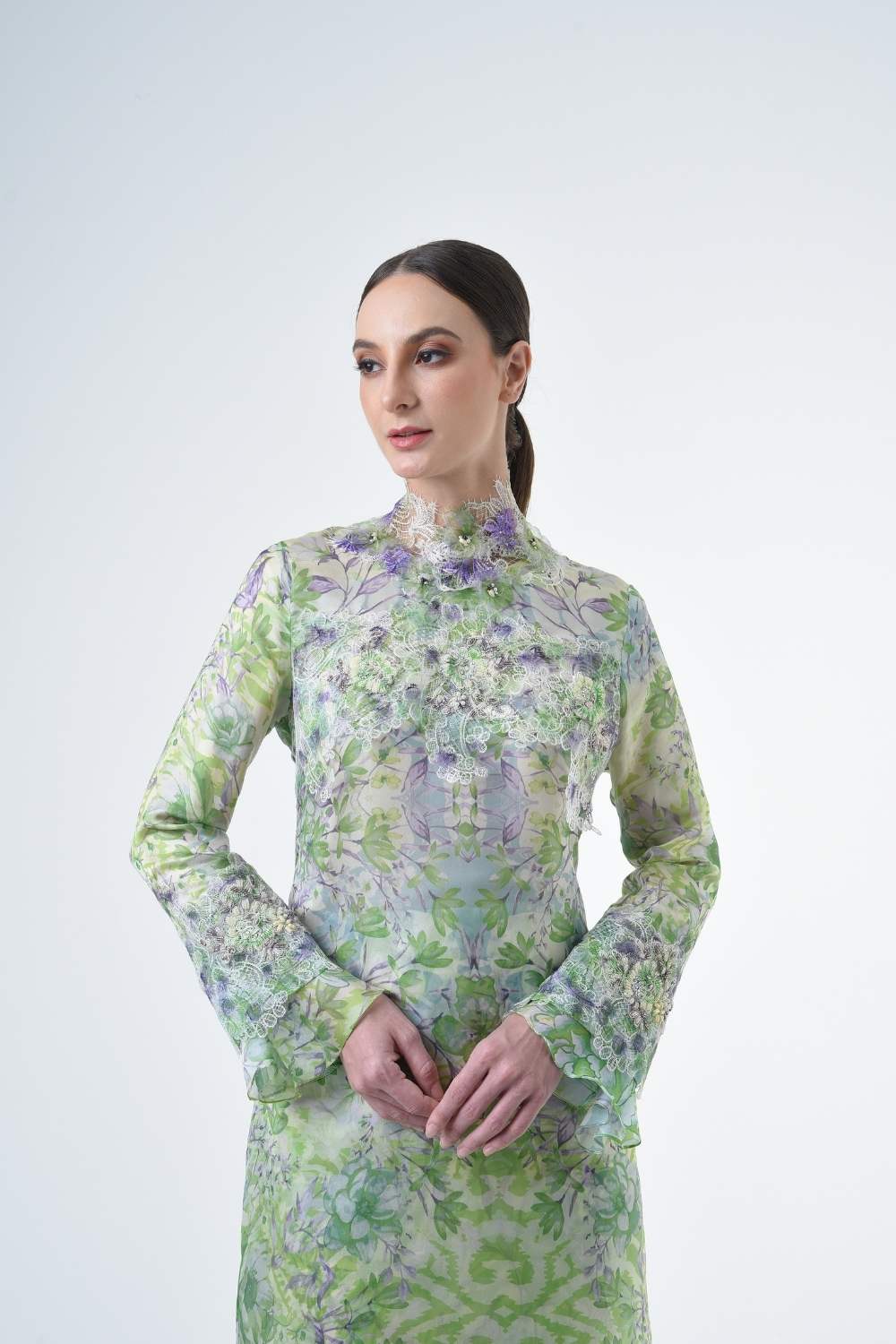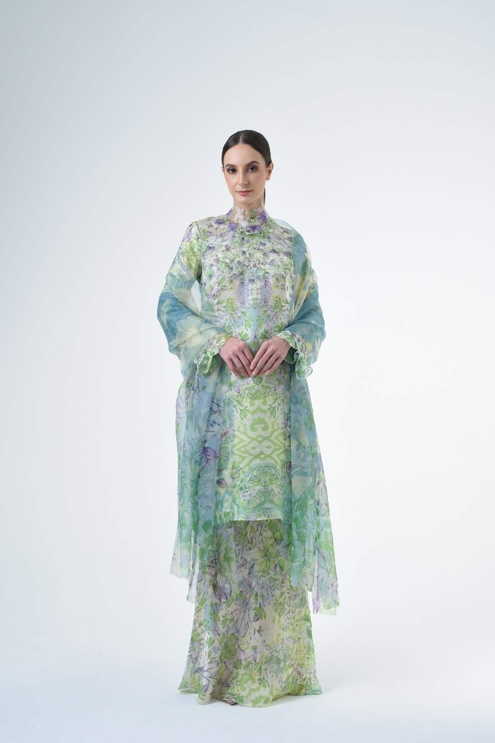 This stylish two-piece set features a loose A-cut top in the long modern Kurang style, paired with a bias-cut skirt. Layered Lace details attach on bottom of sleeves with laser cut flowers enhance the beauty with diamanté with Designed with a contemporary floral motif, it offers a fresh and versatile look, perfect for any occasion. Tailored for the confident, stylish woman, this collection exudes effortless elegance and charm