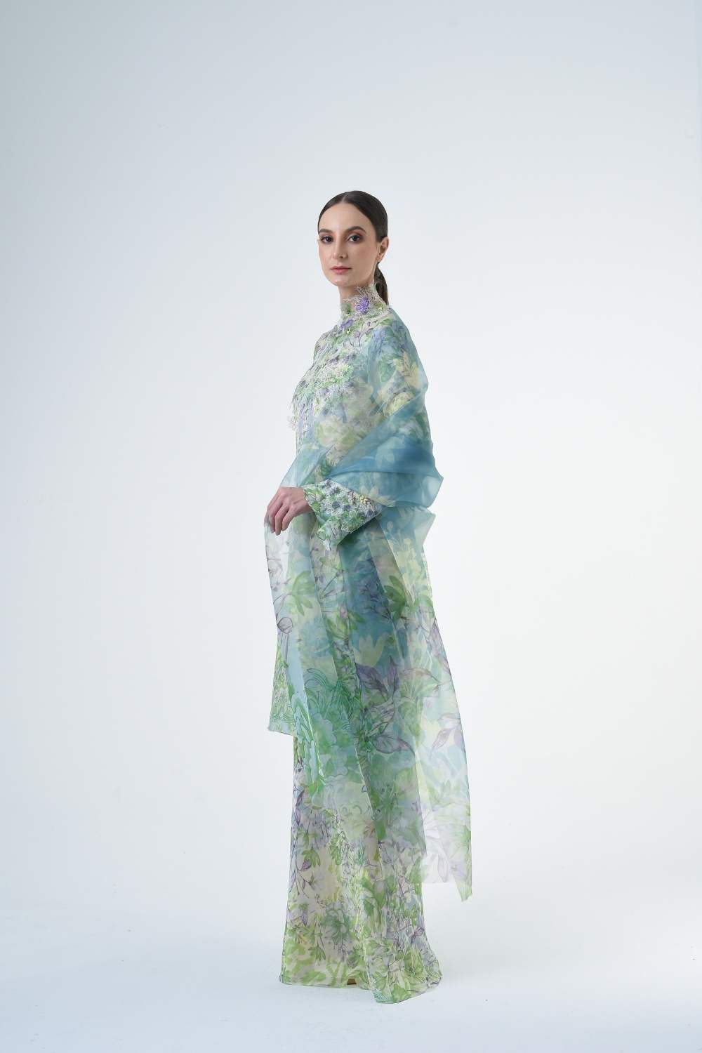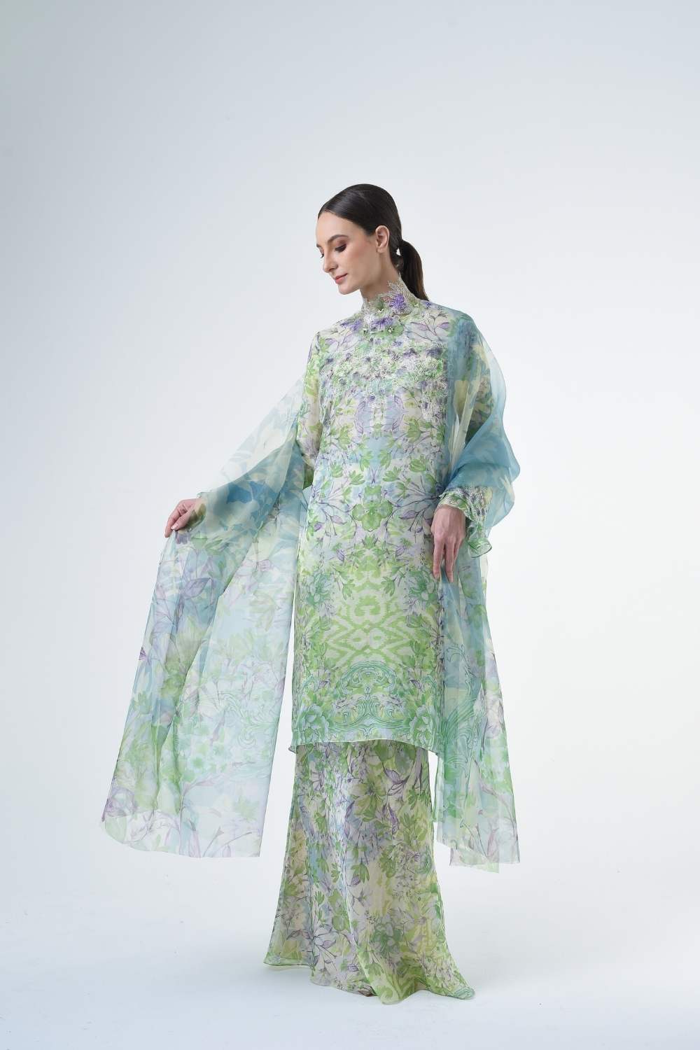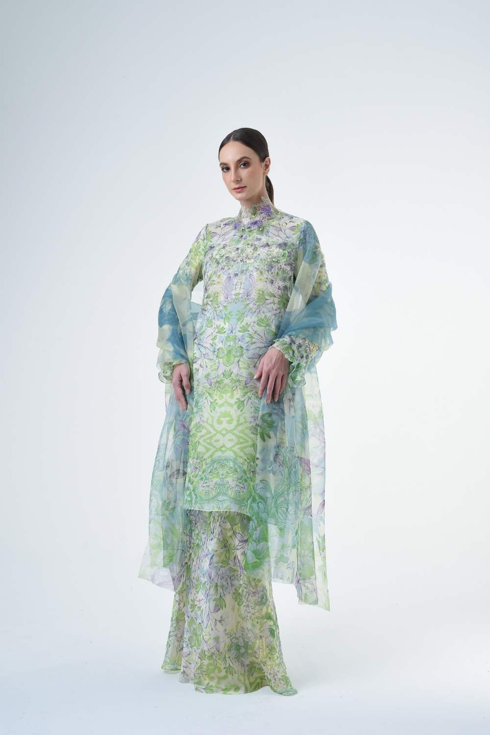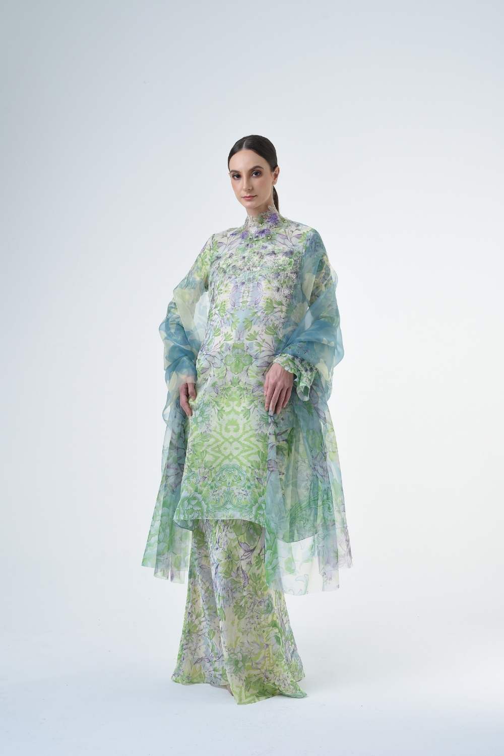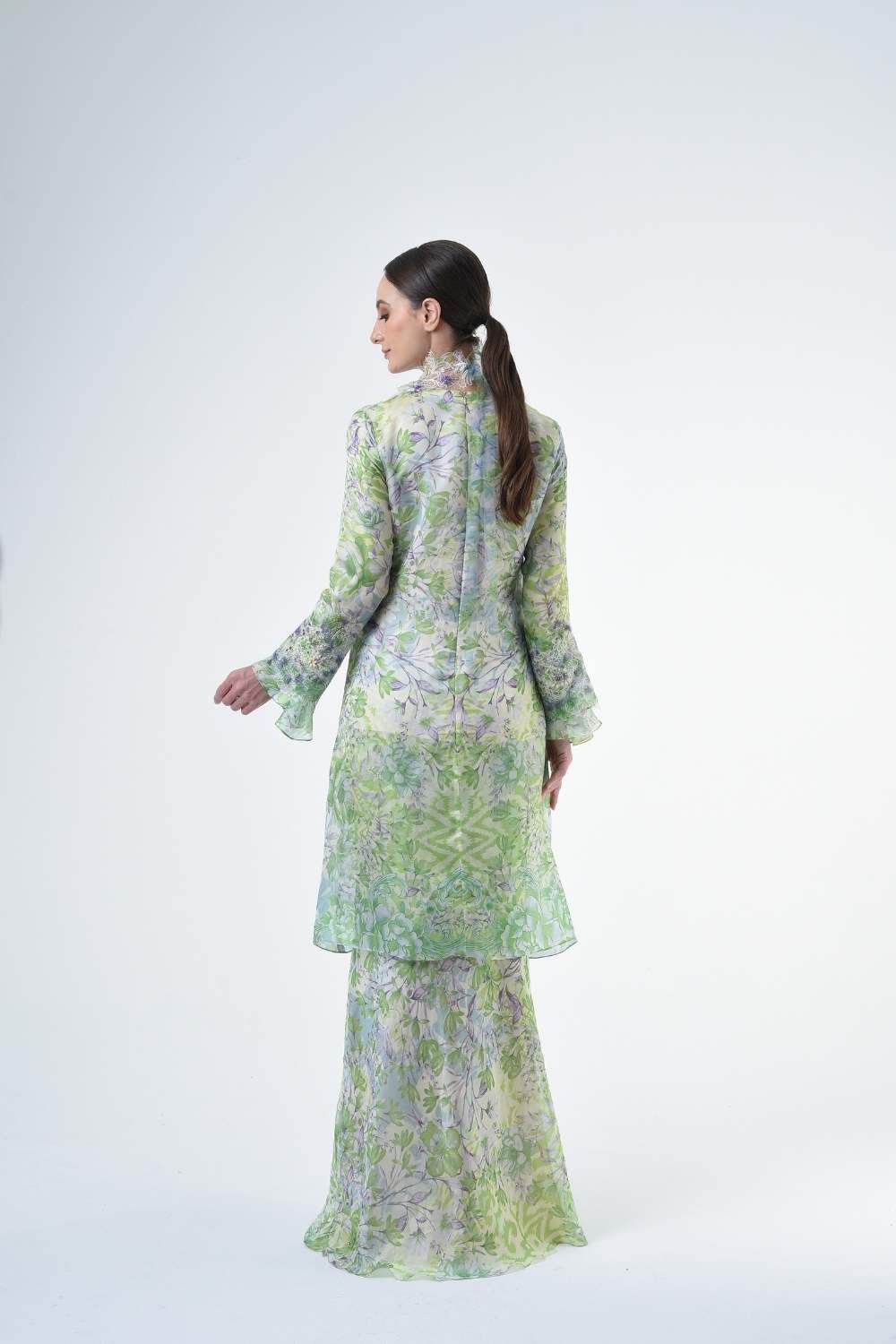 This stylish two-piece set features a loose A-cut top in the long modern Kurang style, paired with a bias-cut skirt. Layered Lace details attach on bottom of sleeves with laser cut flowers enhance the beauty with diamanté with Designed with a contemporary floral motif, it offers a fresh and versatile look, perfect for any occasion. Tailored for the confident, stylish woman, this collection exudes effortless elegance and charm