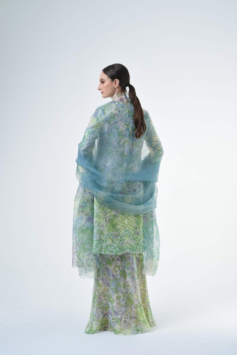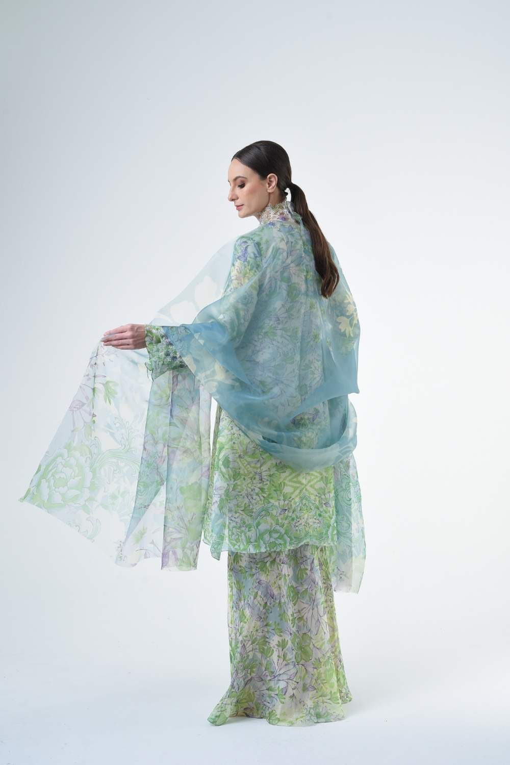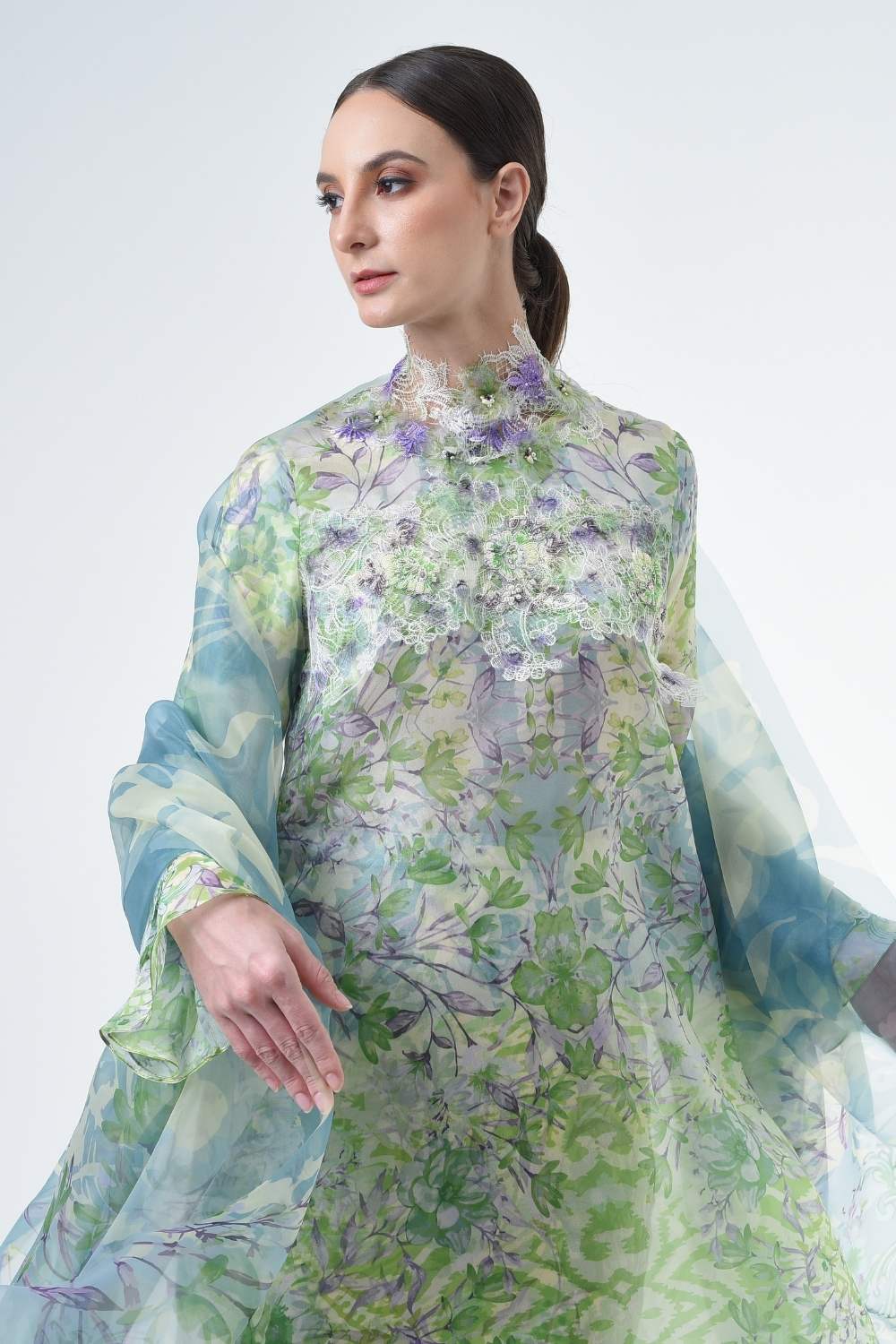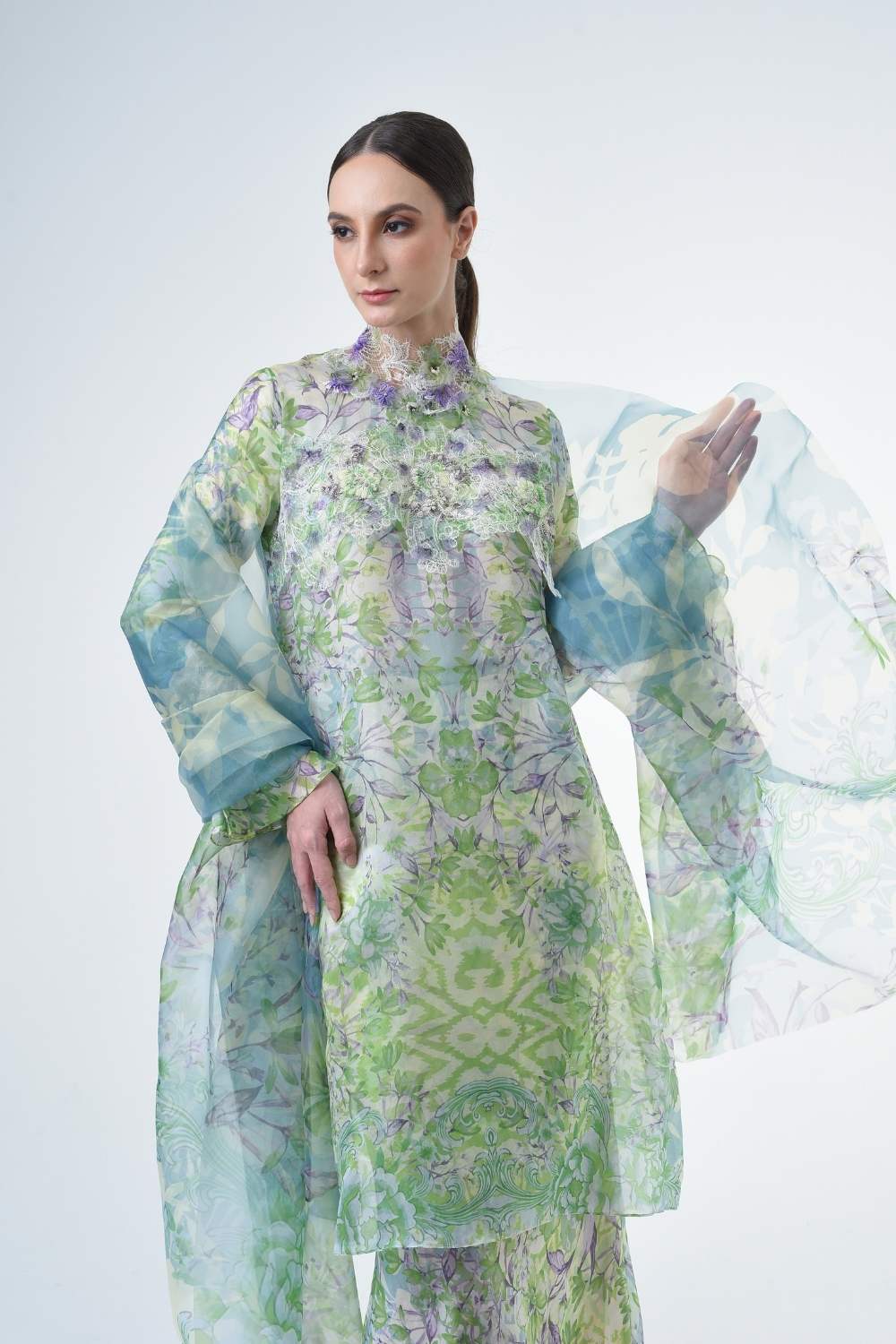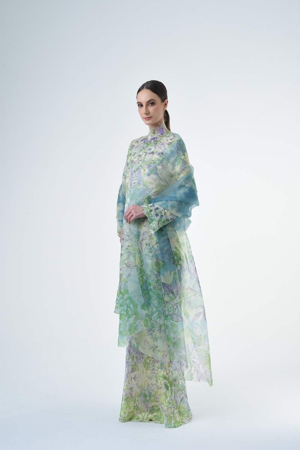 This stylish two-piece set features a loose A-cut top in the long modern Kurang style, paired with a bias-cut skirt. Layered Lace details attach on bottom of sleeves with laser cut flowers enhance the beauty with diamanté with Designed with a contemporary floral motif, it offers a fresh and versatile look, perfect for any occasion. Tailored for the confident, stylish woman, this collection exudes effortless elegance and charm