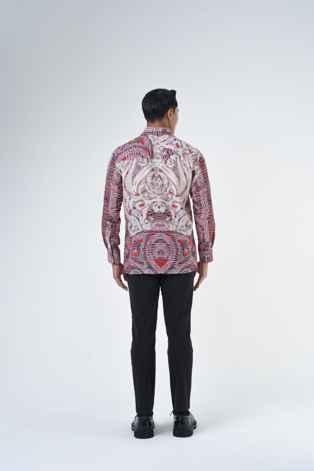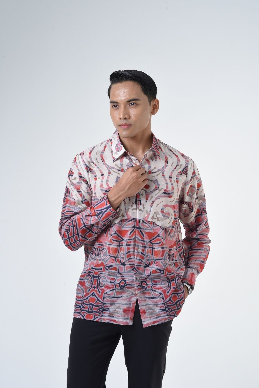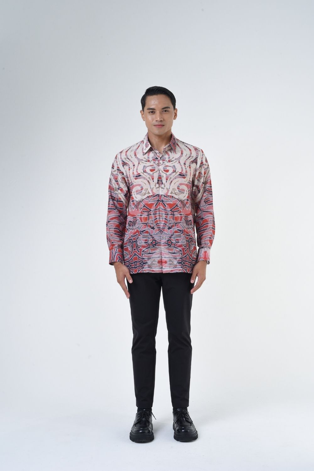 This relaxes cut men’s long sleeve batik shirt features intricate ethnic patterns. Its tailored fit makes it versatile for formal occasions, creating a striking statement piece that celebrates cultural heritage.