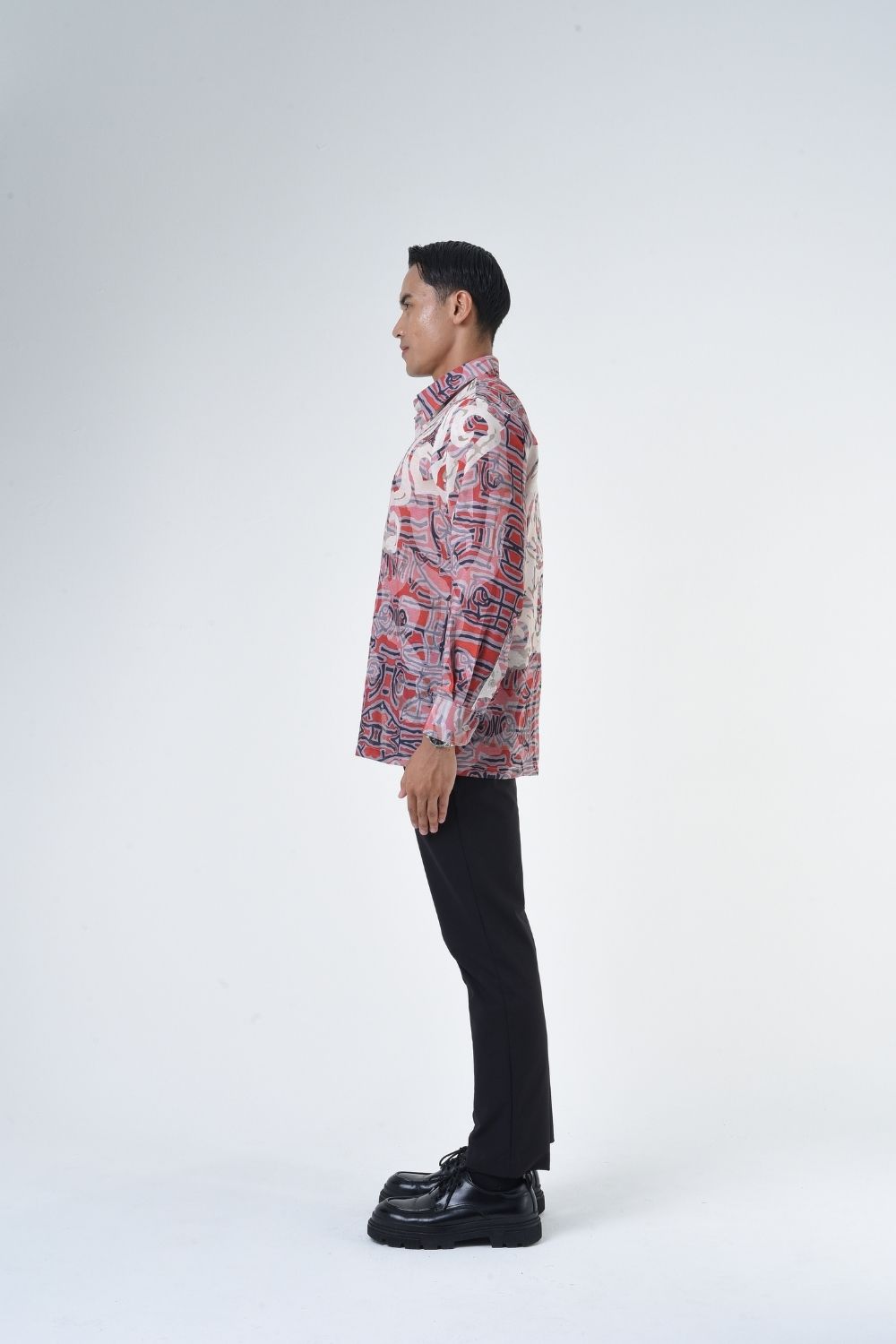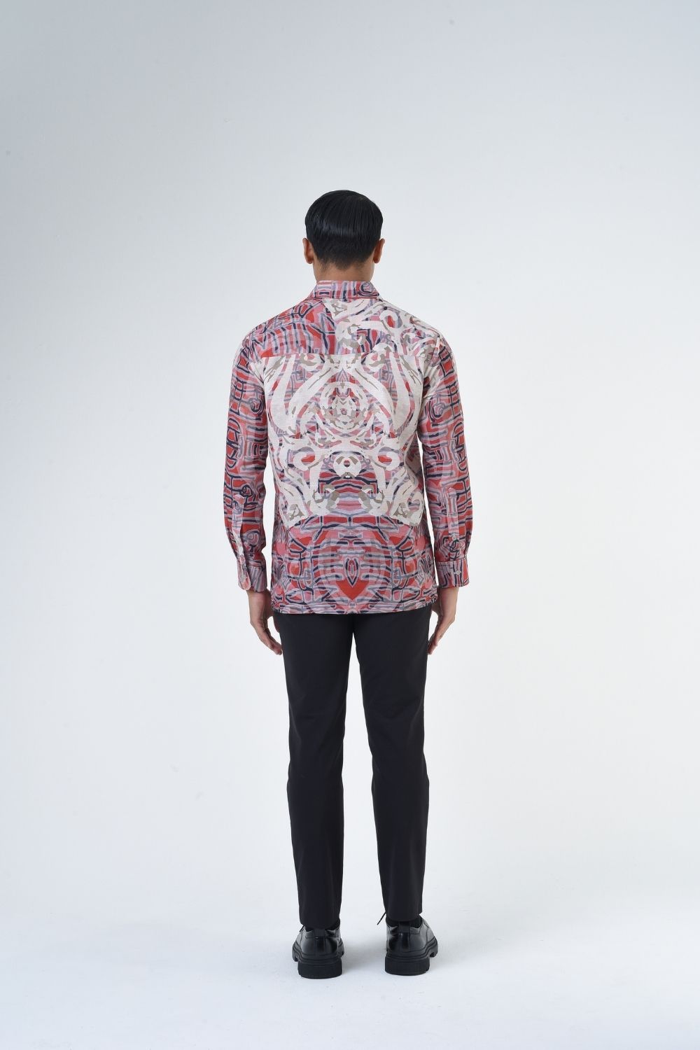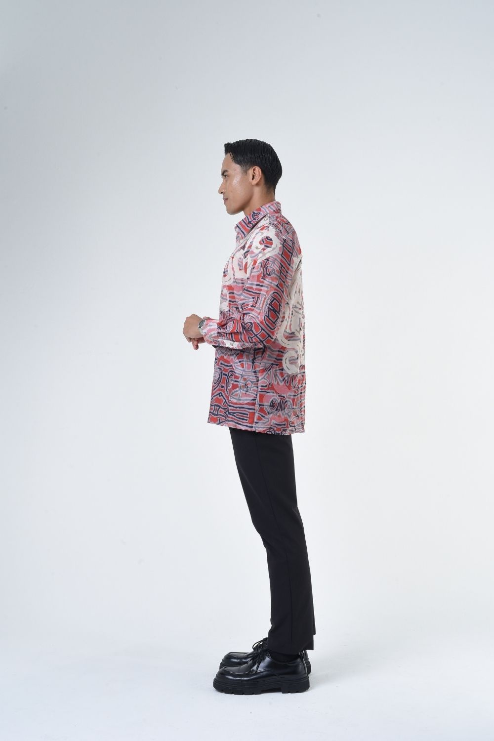 This relaxes cut men’s long sleeve batik shirt features intricate ethnic patterns. Its tailored fit makes it versatile for formal occasions, creating a striking statement piece that celebrates cultural heritage.
