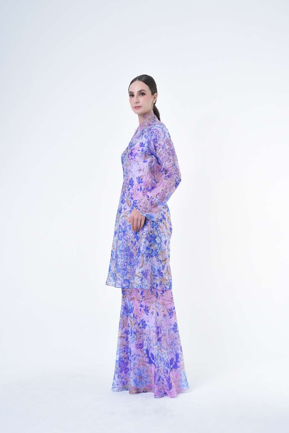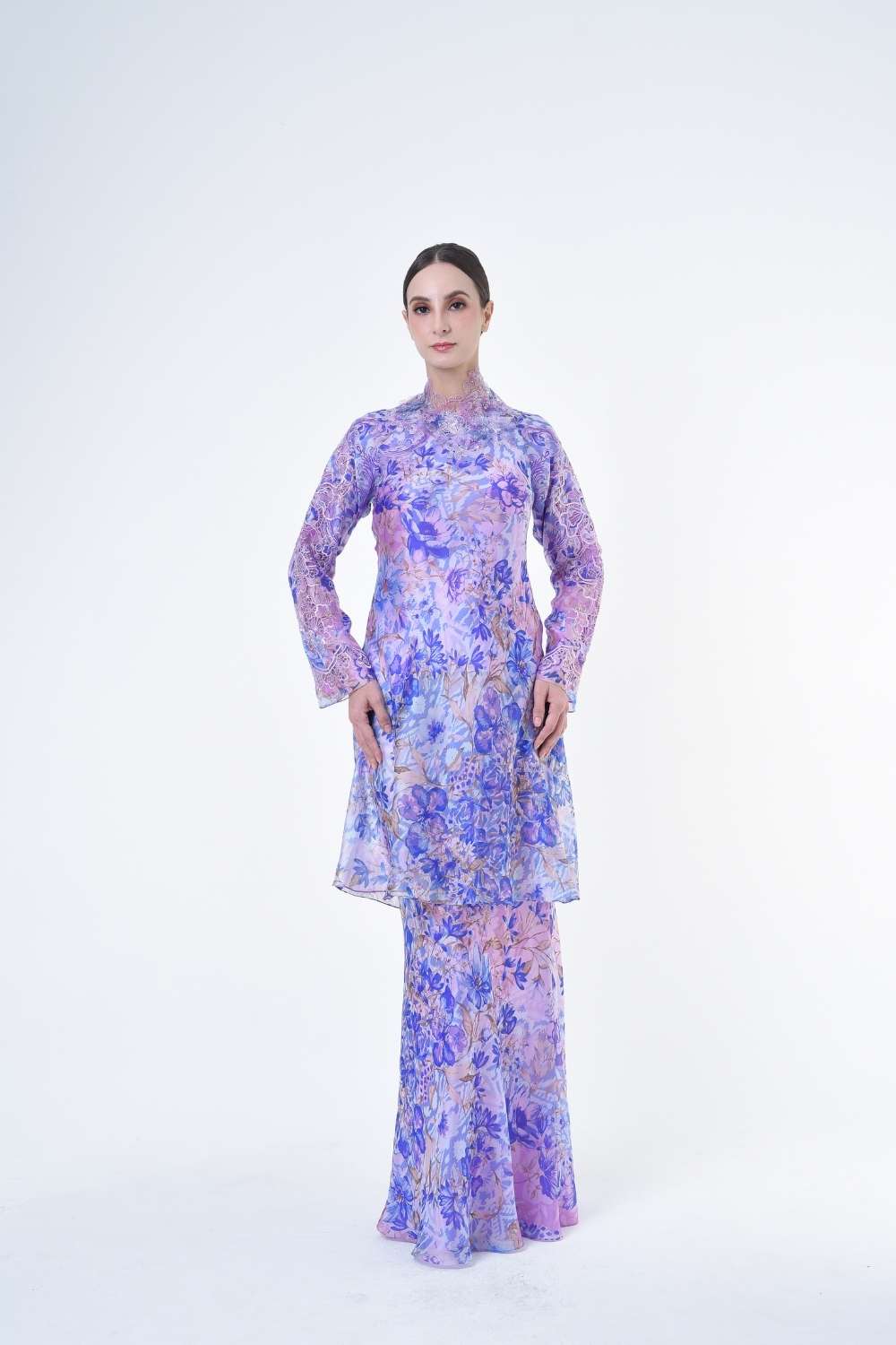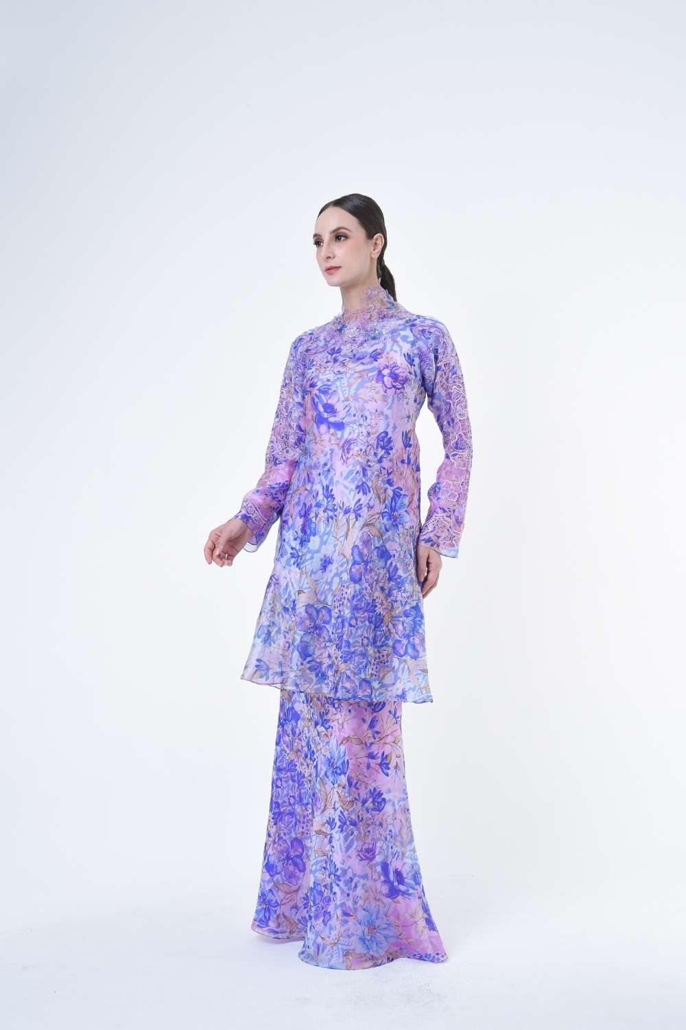 This stylish two-piece set features a loose A-cut top in the long modern Kurang style, paired with a bias cut skirt. Full Embroidery details on sleeves, Designed with a contemporary geomatic and floral motif, it offers a fresh and versatile look, perfect for any occasion. Tailored for the confident, stylish woman, this collection exudes effortless elegance and charm