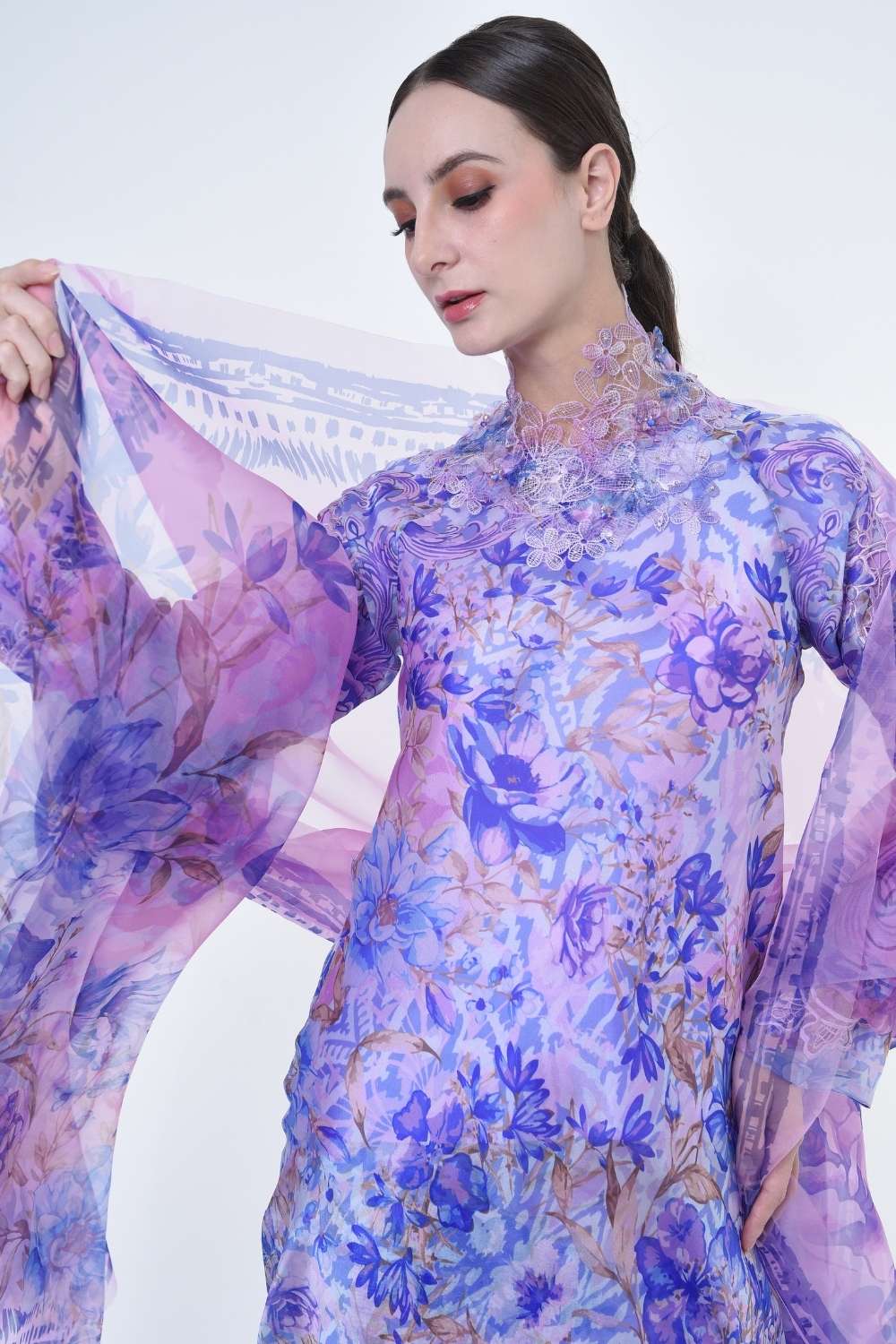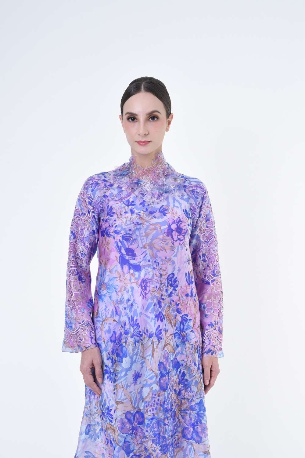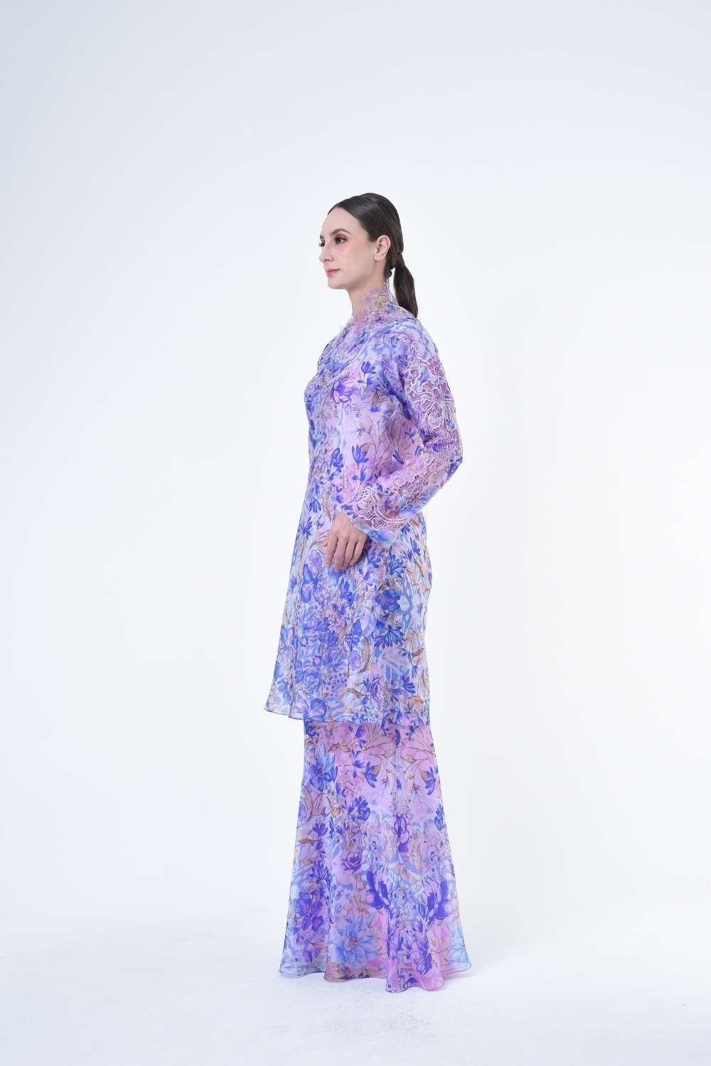 This stylish two-piece set features a loose A-cut top in the long modern Kurang style, paired with a bias cut skirt. Full Embroidery details on sleeves, Designed with a contemporary geomatic and floral motif, it offers a fresh and versatile look, perfect for any occasion. Tailored for the confident, stylish woman, this collection exudes effortless elegance and charm