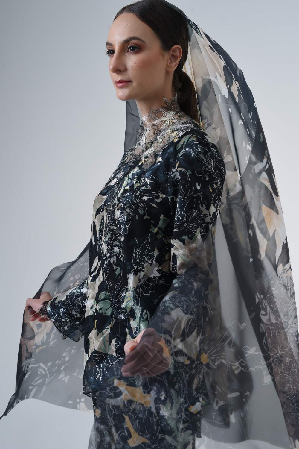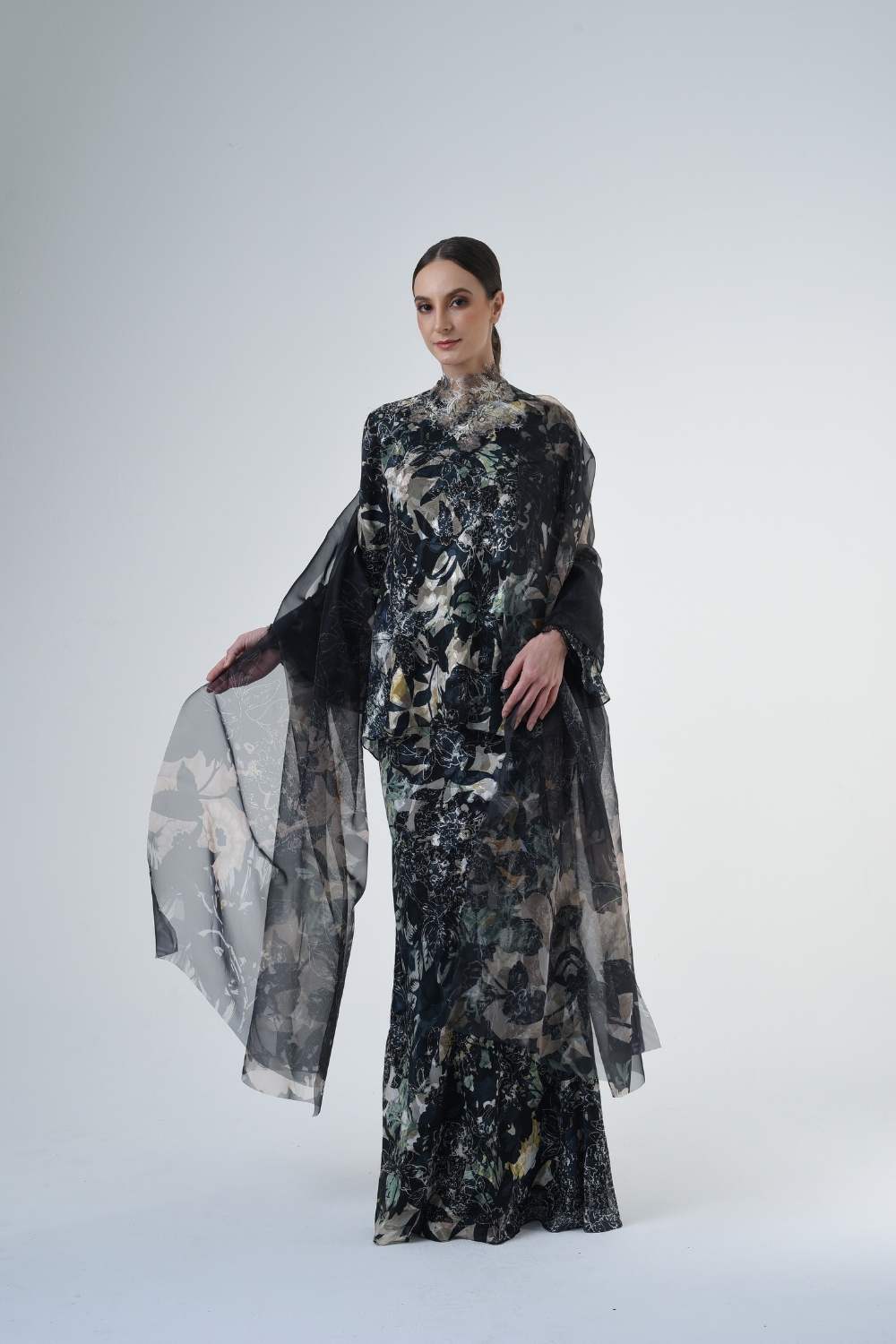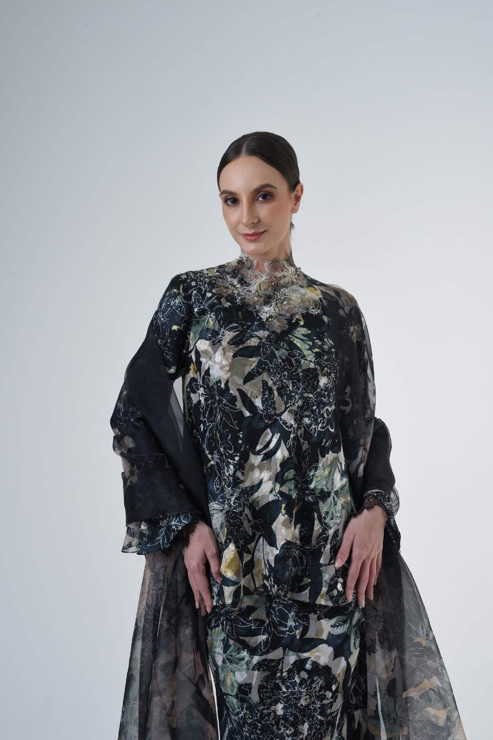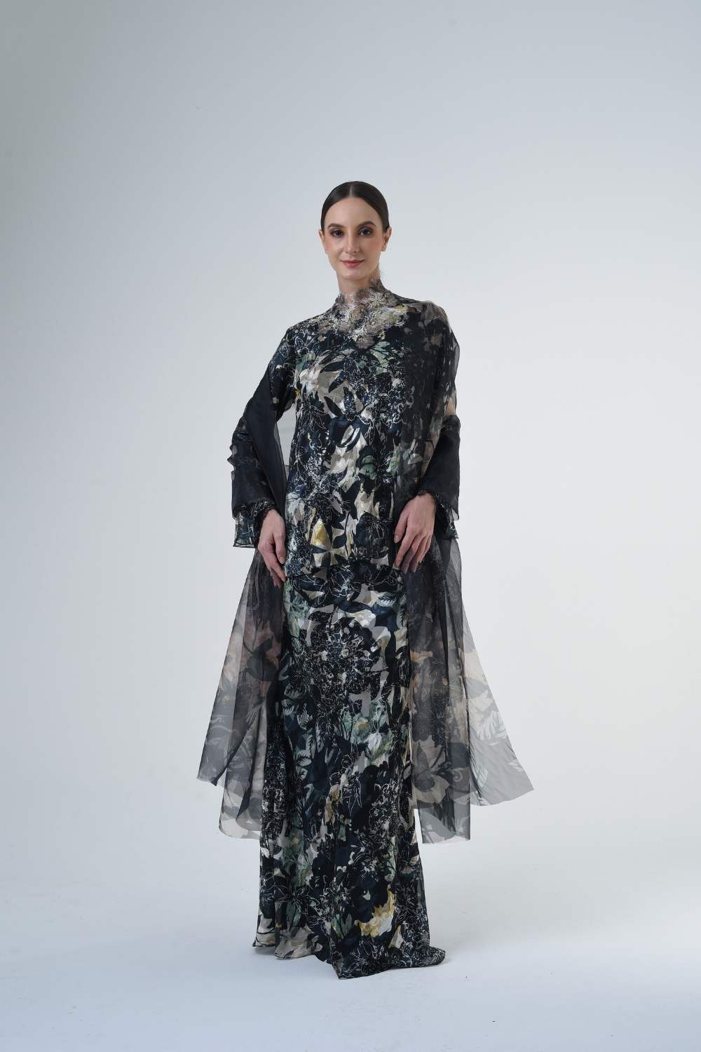This stylish two-piece set features a loose fitting cut top in the modern short kurung style, paired with a bias cut skirt. Layered Lace details attach on bottom of sleeves Designed with a contemporary batik floral motif, it offers a fresh and versatile look, perfect for any occasion. Tailored for the confident, stylish woman, this collection exudes effortless elegance and charm.