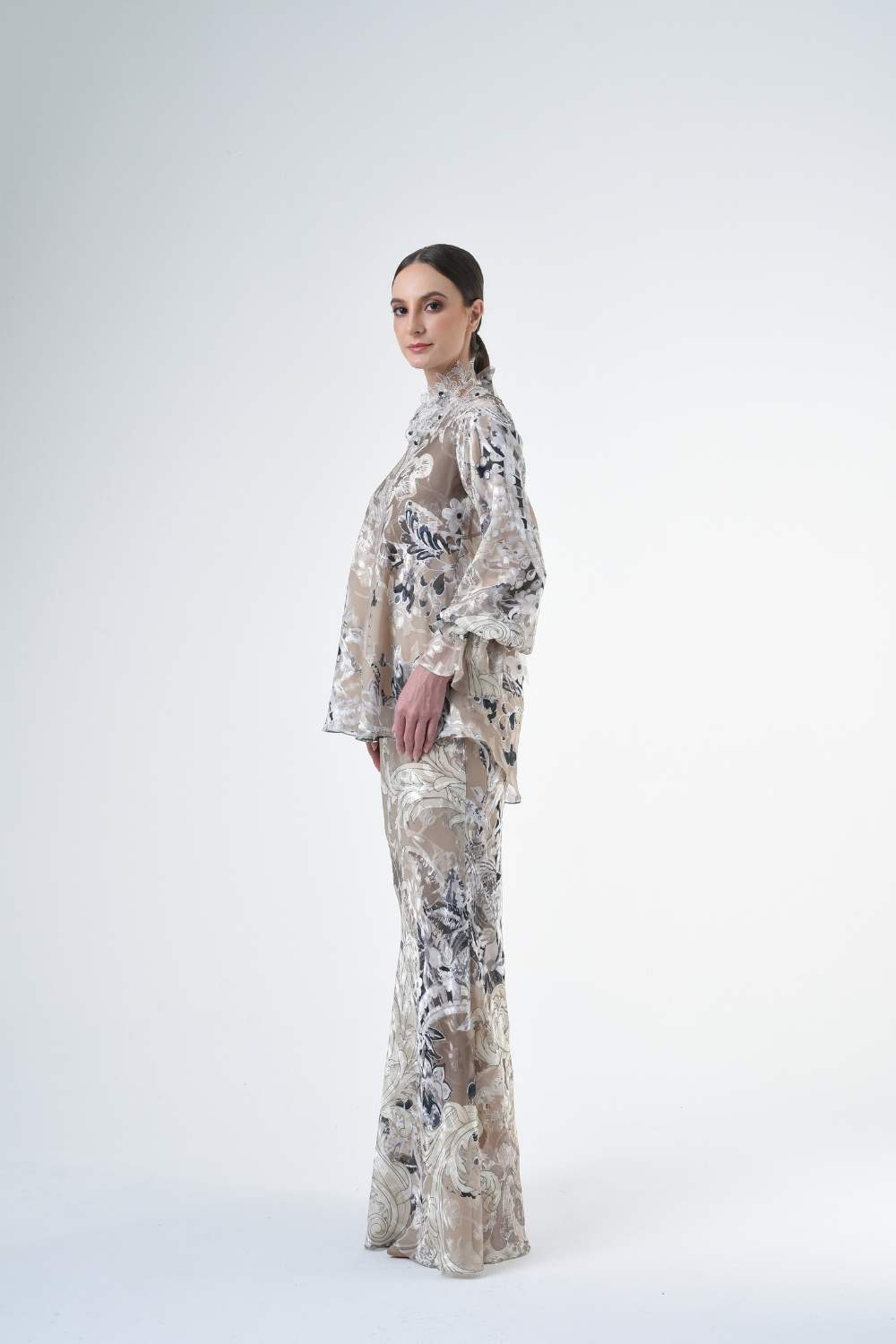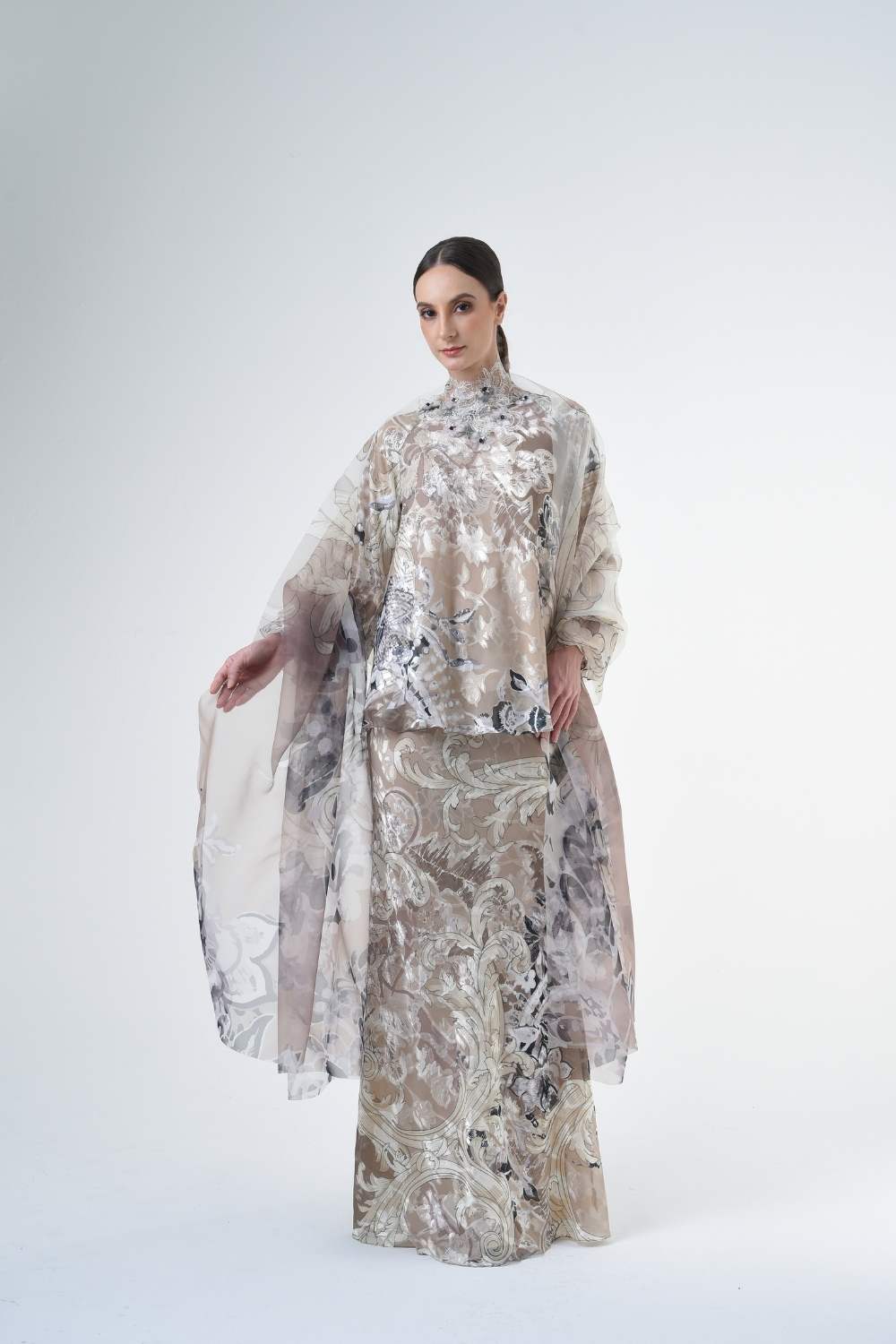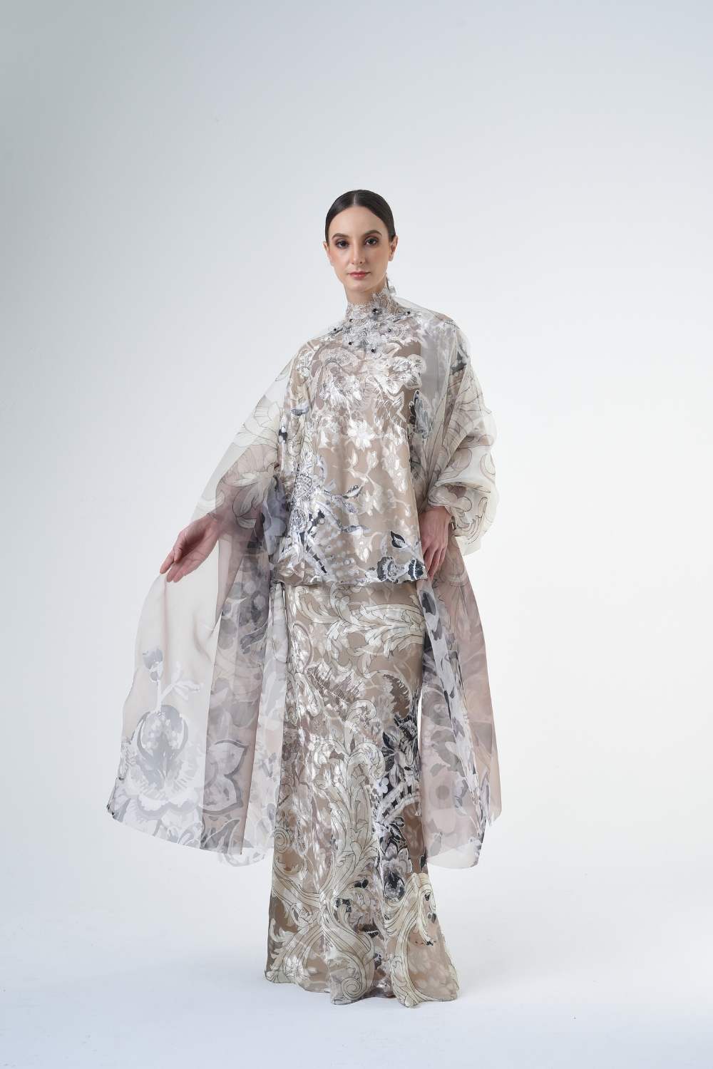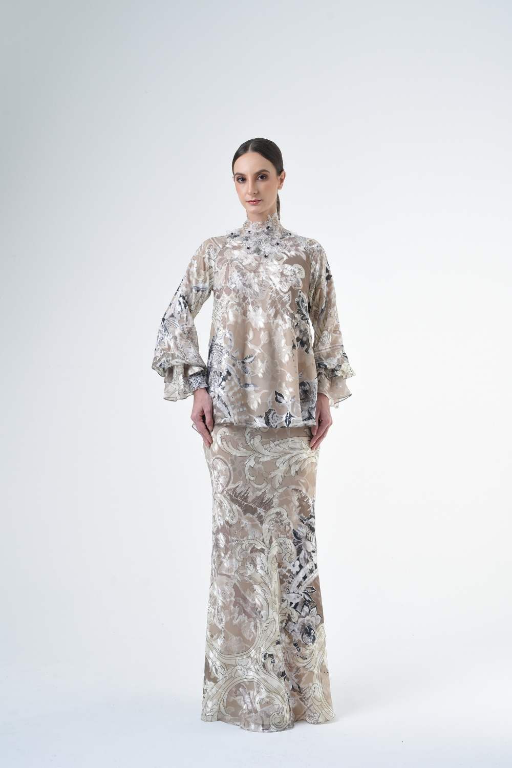 This stylish two-piece set features a 3” drop shoulder loose A-cut top in the short kurung style, paired with a lipat batik skirt. Designed with a contemporary geomatic and floral motif, it offers a fresh and versatile look, perfect for any occasion. Tailored for the confident, stylish woman, this collection exudes effortless elegance and charm.