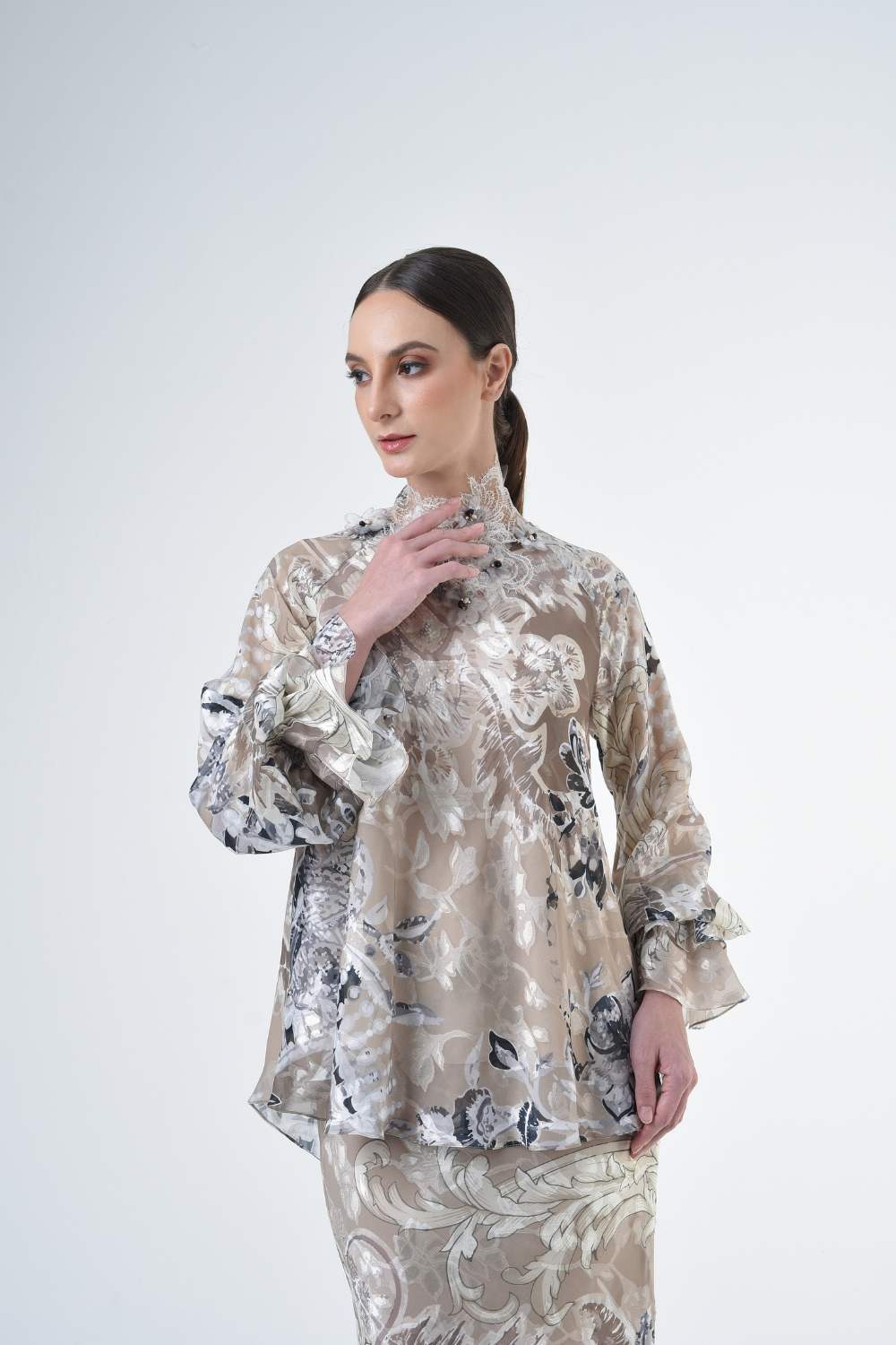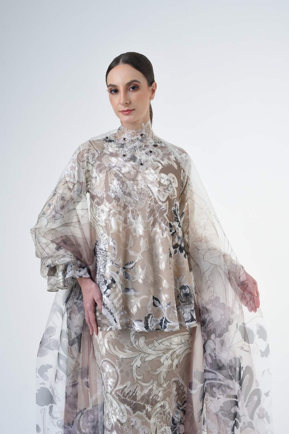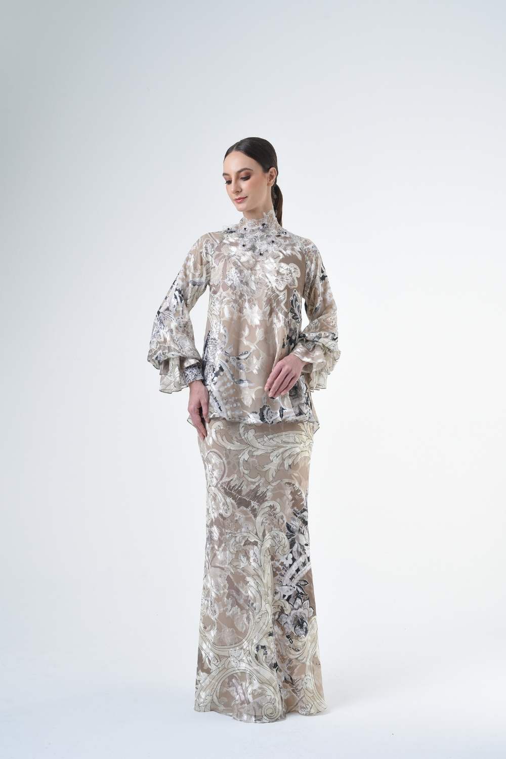 This stylish two-piece set features a 3” drop shoulder loose A-cut top in the short kurung style, paired with a lipat batik skirt. Designed with a contemporary geomatic and floral motif, it offers a fresh and versatile look, perfect for any occasion. Tailored for the confident, stylish woman, this collection exudes effortless elegance and charm.