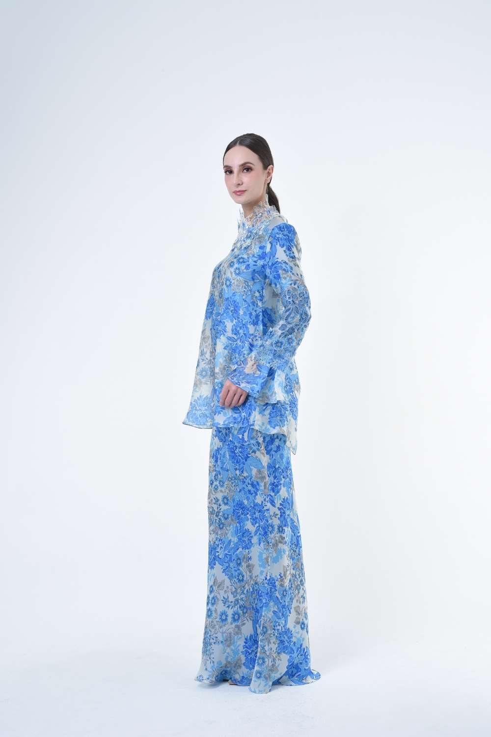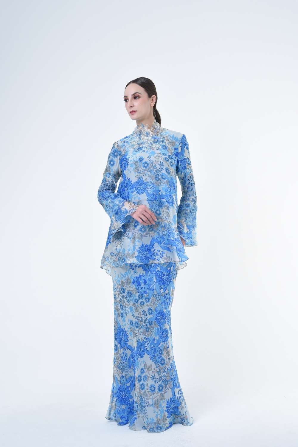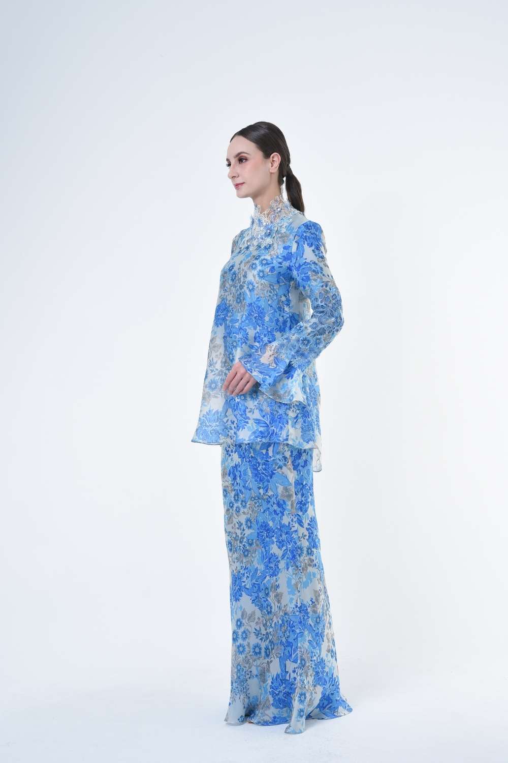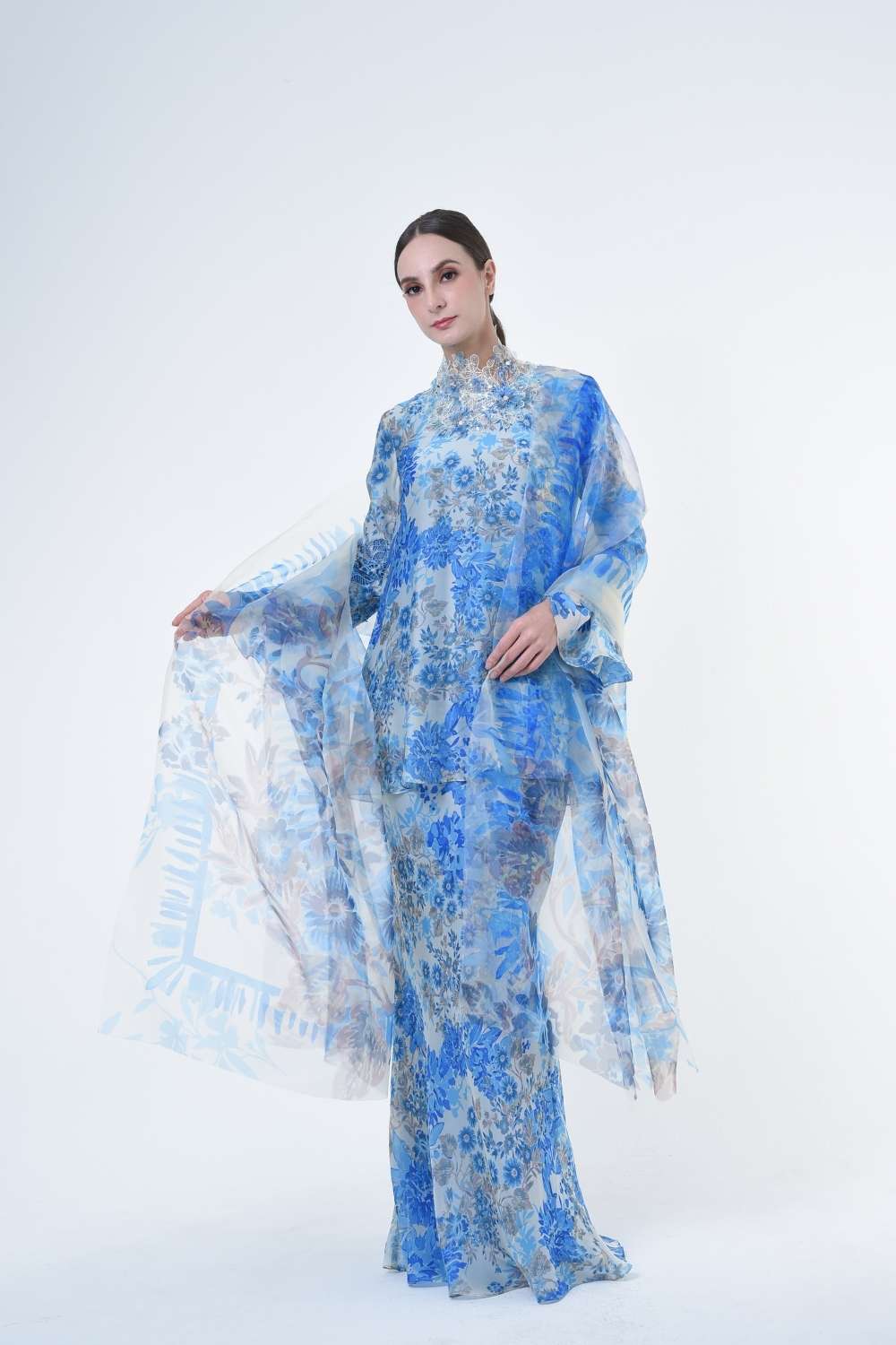 This stylish two-piece set features a loose fitting cut top in the modern short Kurang style, paired with a bias-cut skirt. Layered Lace details attach on bottom of sleeves with laser cut flowers enhance the beauty with diamanté, designed with a contemporary batik floral motif, it offers a fresh and versatile look, perfect for any occasion. Tailored for the confident, stylish woman, this collection exudes effortless elegance and charm.