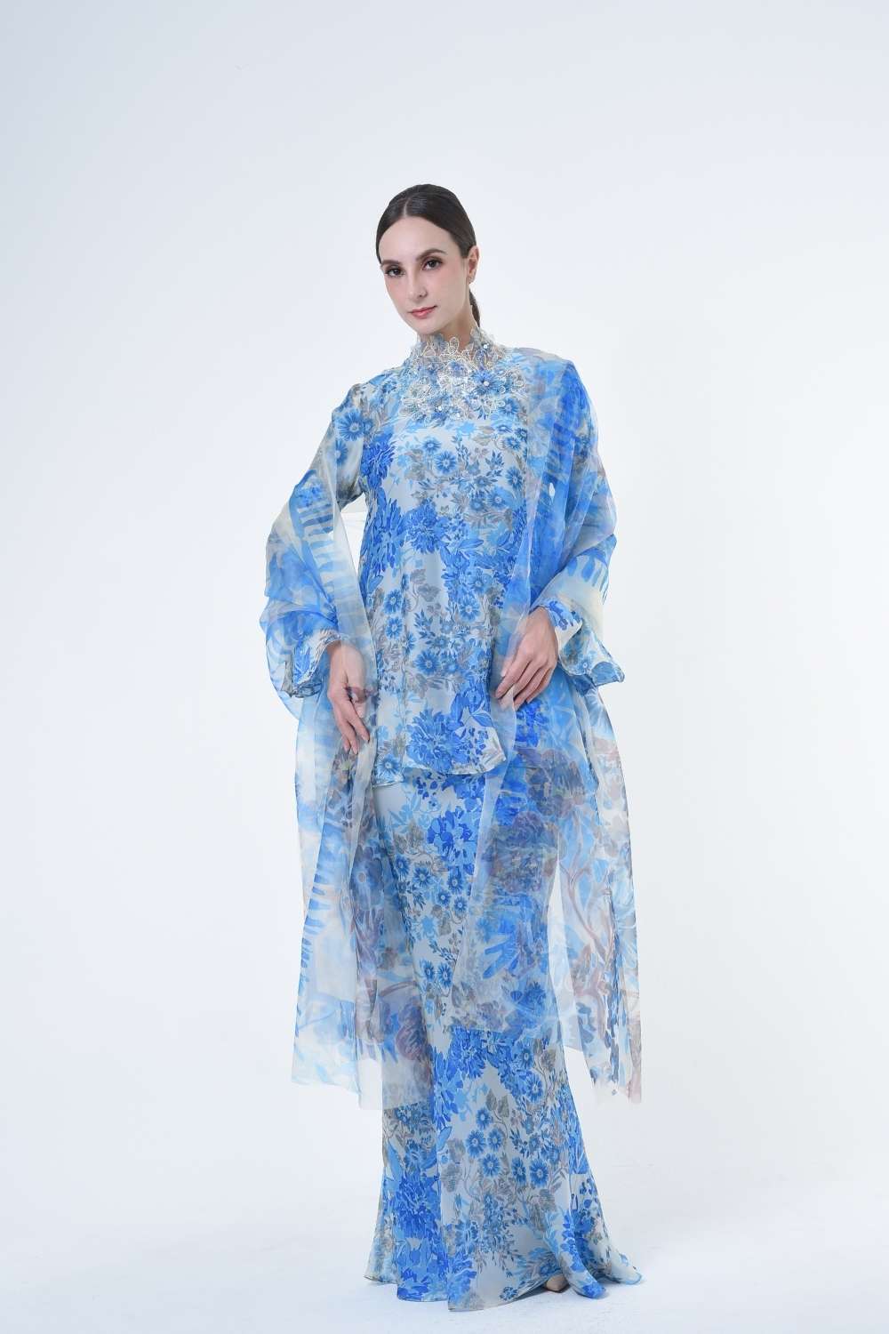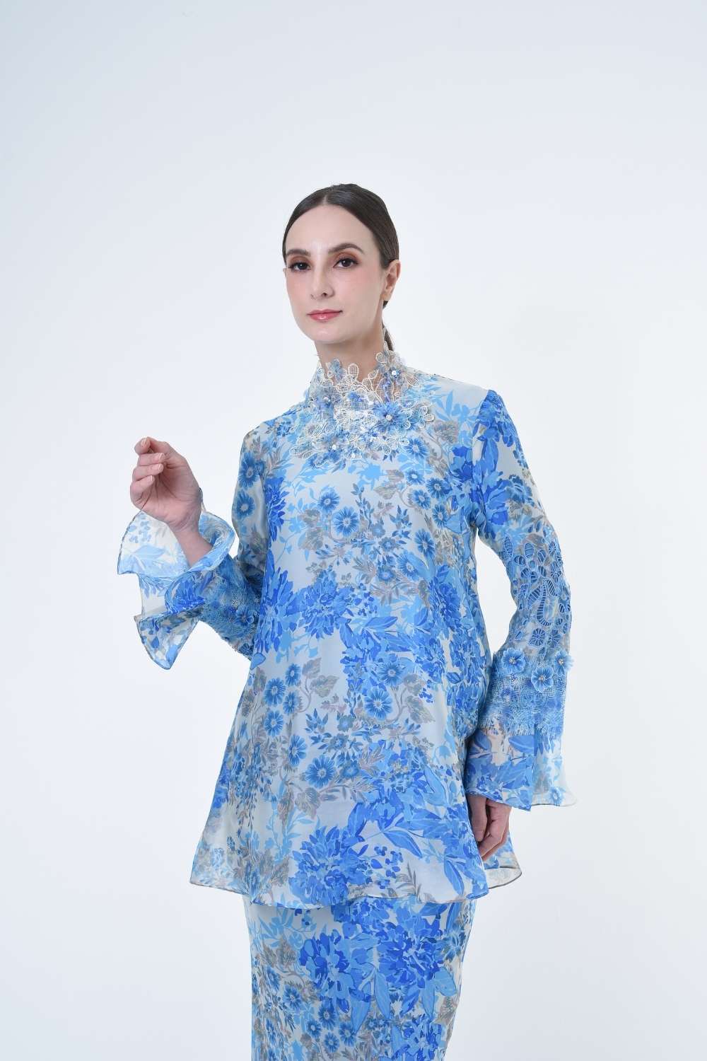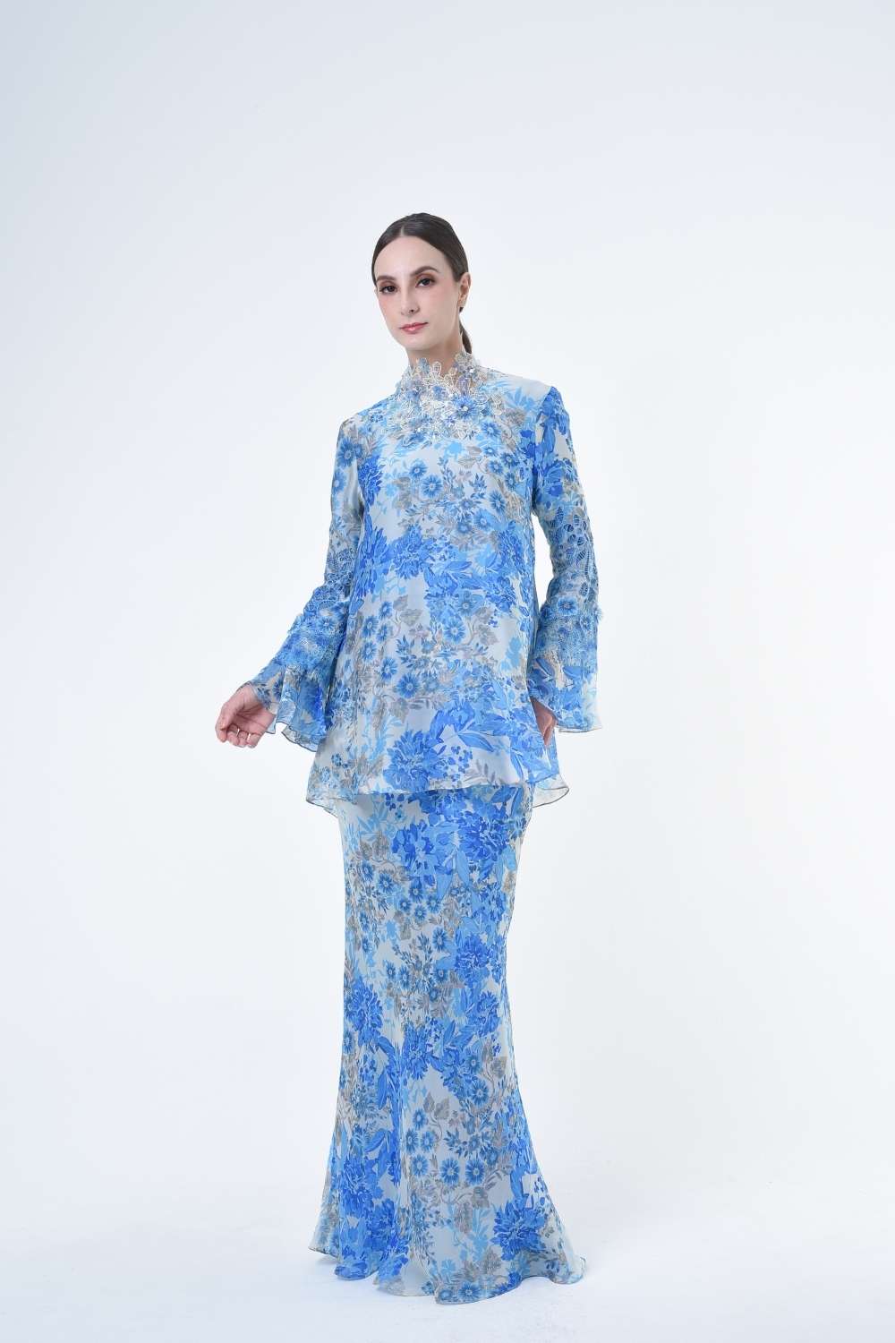 This stylish two-piece set features a loose fitting cut top in the modern short Kurang style, paired with a bias-cut skirt. Layered Lace details attach on bottom of sleeves with laser cut flowers enhance the beauty with diamanté, designed with a contemporary batik floral motif, it offers a fresh and versatile look, perfect for any occasion. Tailored for the confident, stylish woman, this collection exudes effortless elegance and charm.