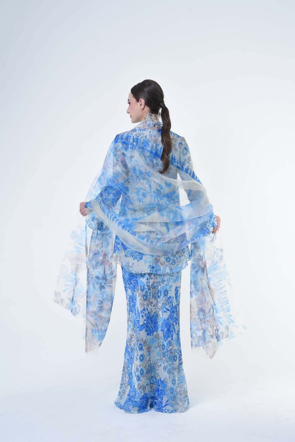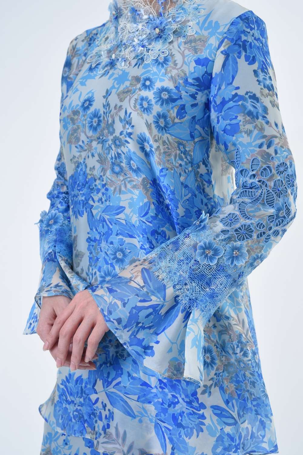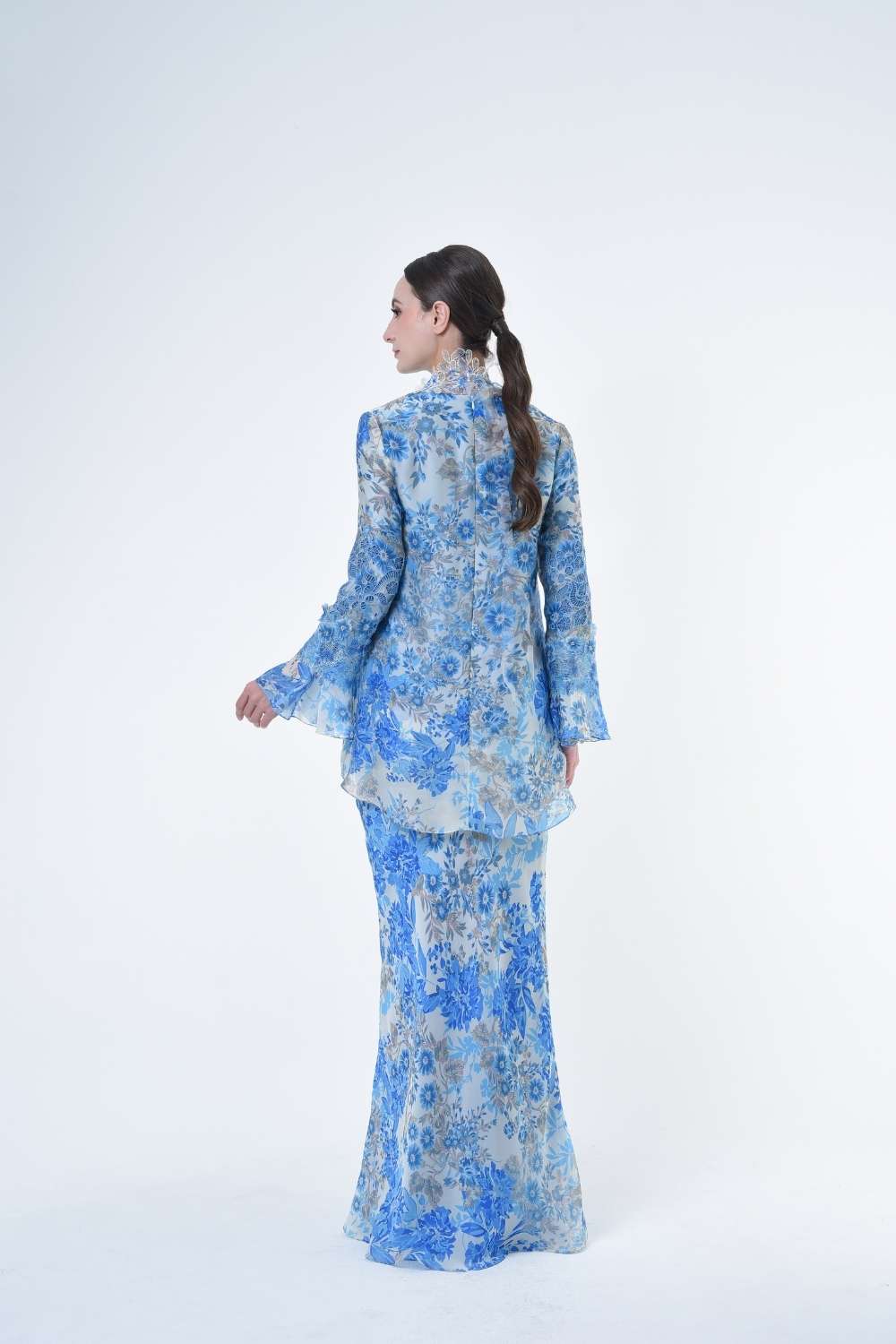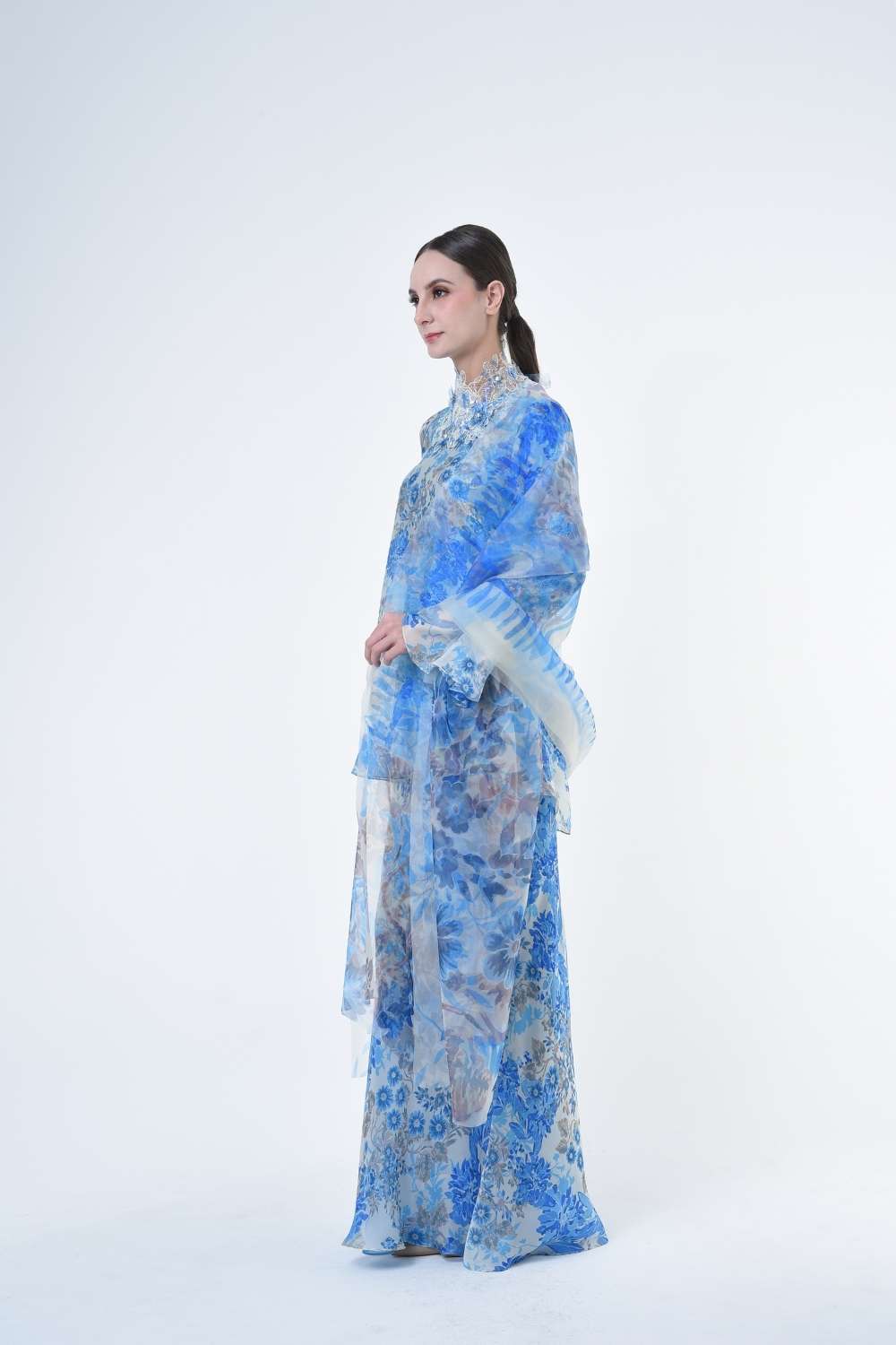 This stylish two-piece set features a loose fitting cut top in the modern short Kurang style, paired with a bias-cut skirt. Layered Lace details attach on bottom of sleeves with laser cut flowers enhance the beauty with diamanté, designed with a contemporary batik floral motif, it offers a fresh and versatile look, perfect for any occasion. Tailored for the confident, stylish woman, this collection exudes effortless elegance and charm.