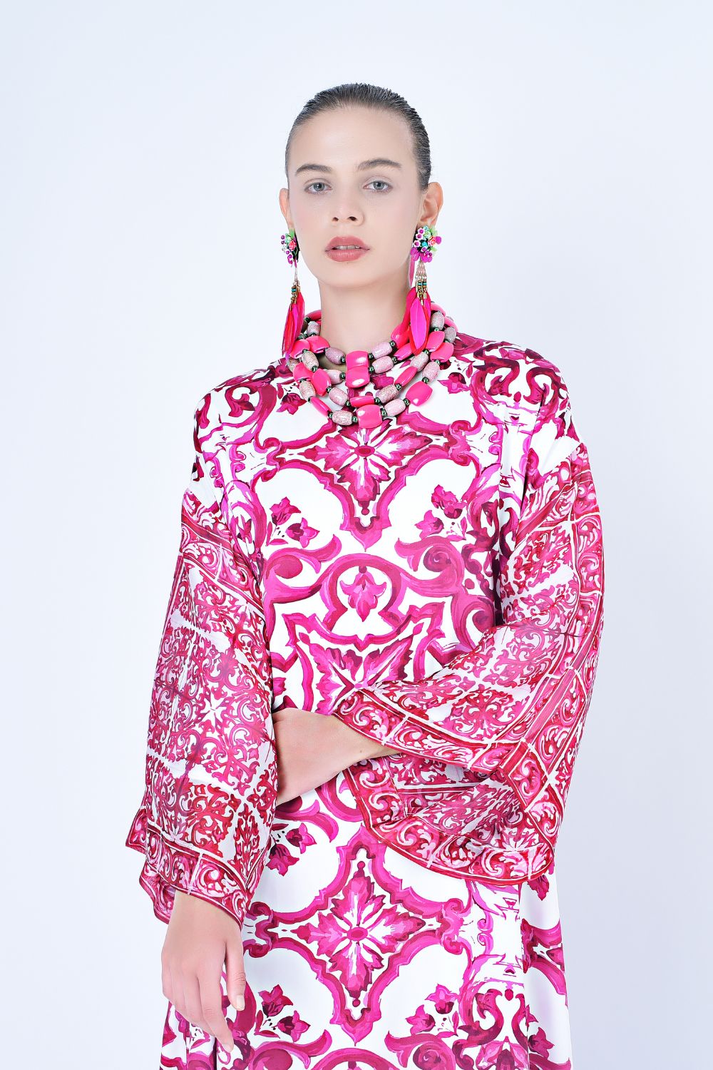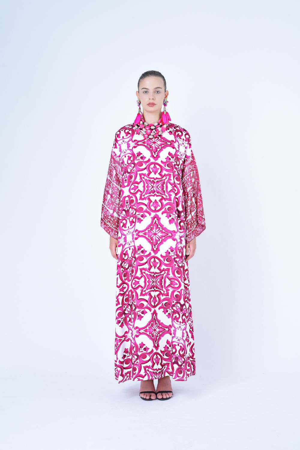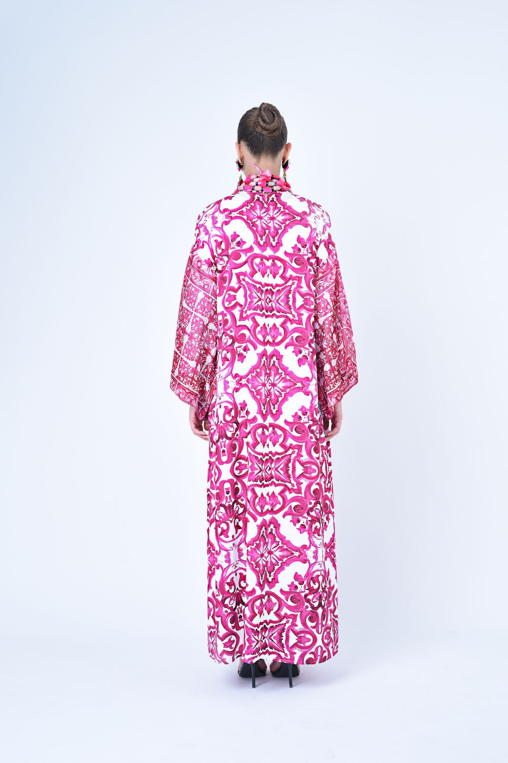 This kaftan appears to offer a contemporary style with its modern geomatic motif and placement, combined with the classic ‘A’ cut. The use of twill and soft organza adds a luxurious touch.