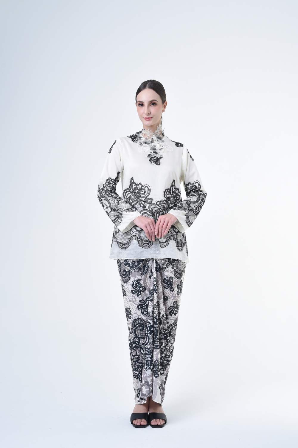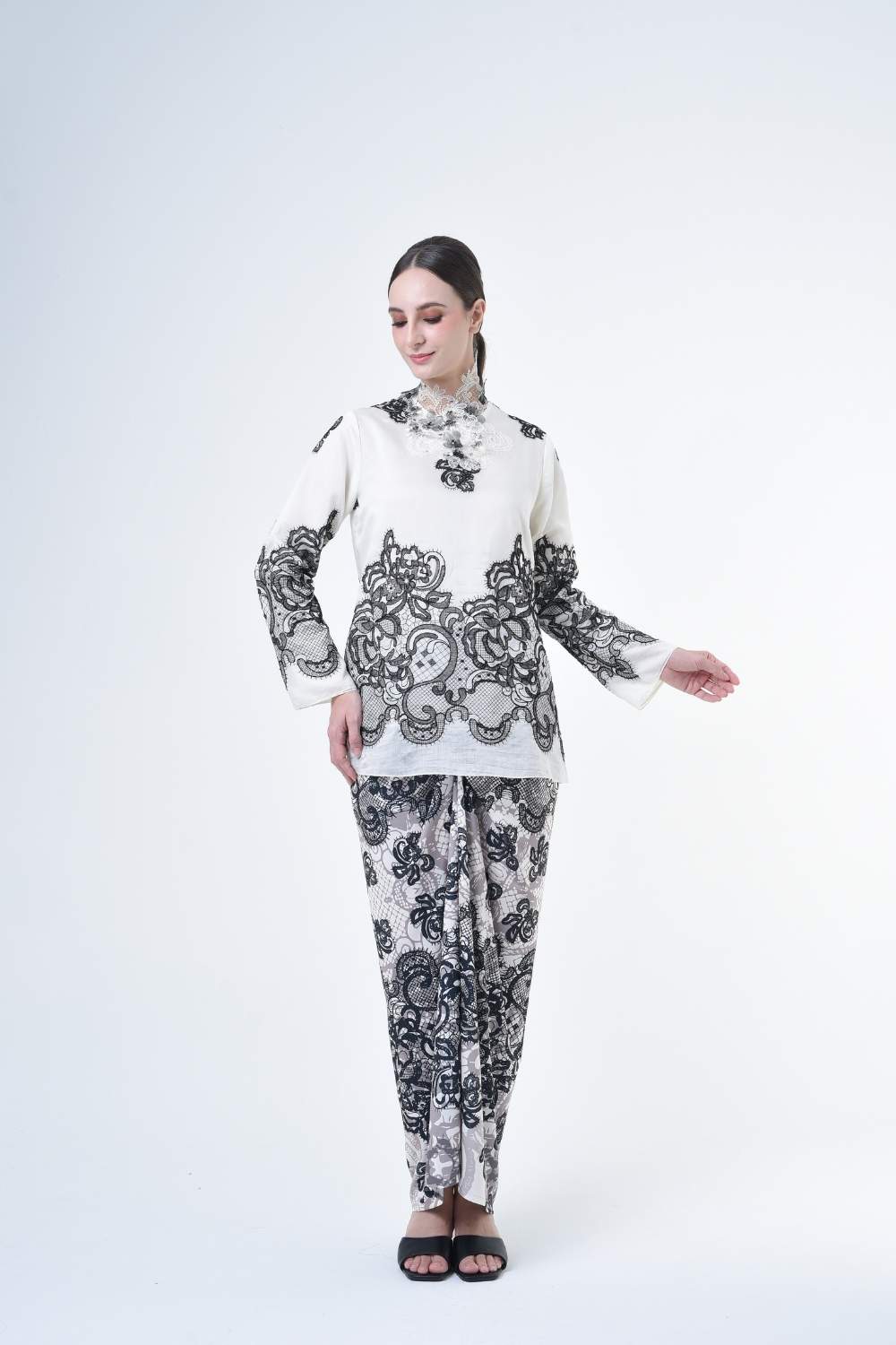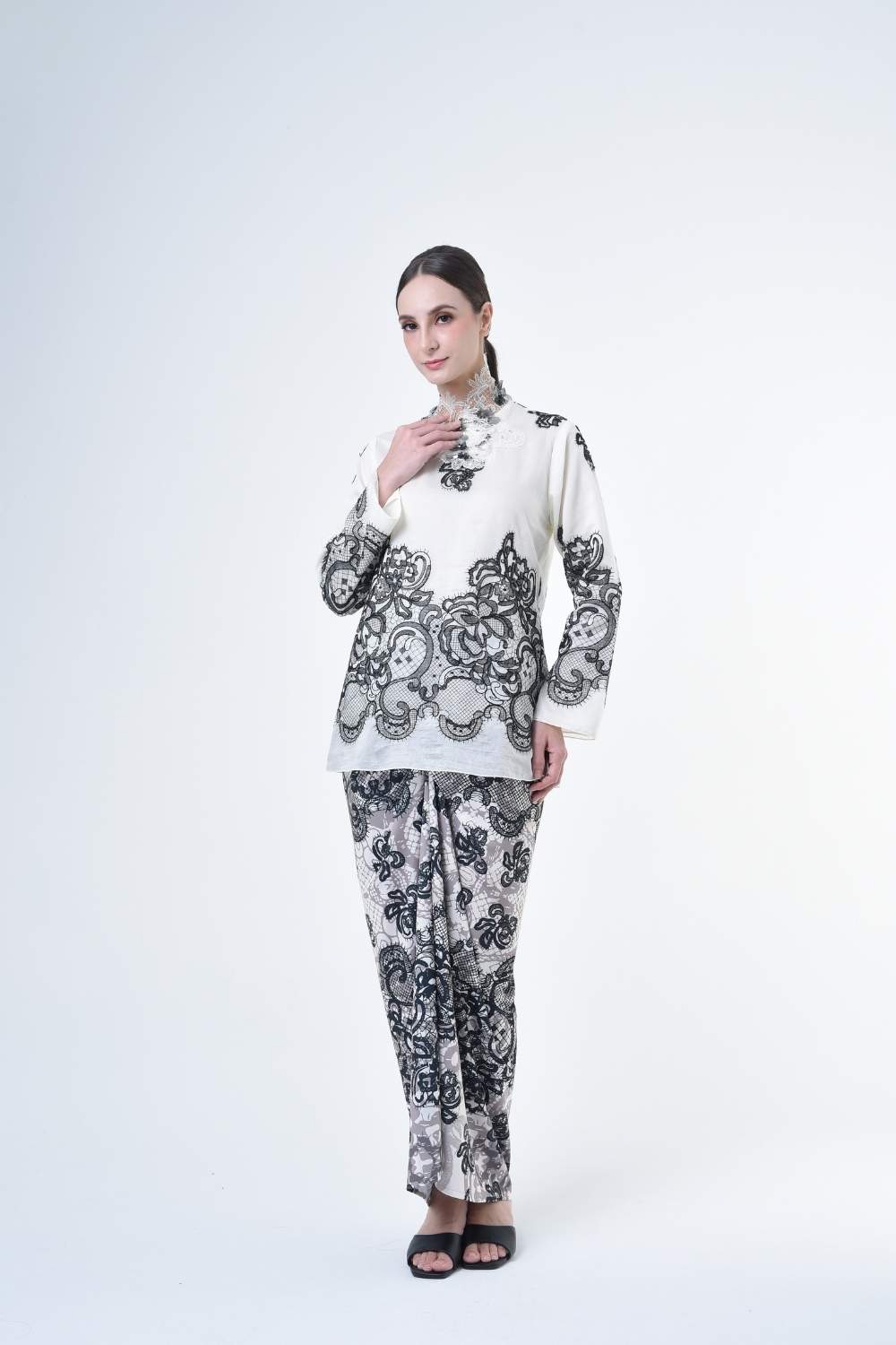 This stylish two-piece set features a loose fitting cut top in the kurung kedah style, paired with a Ikat sarong skirt.