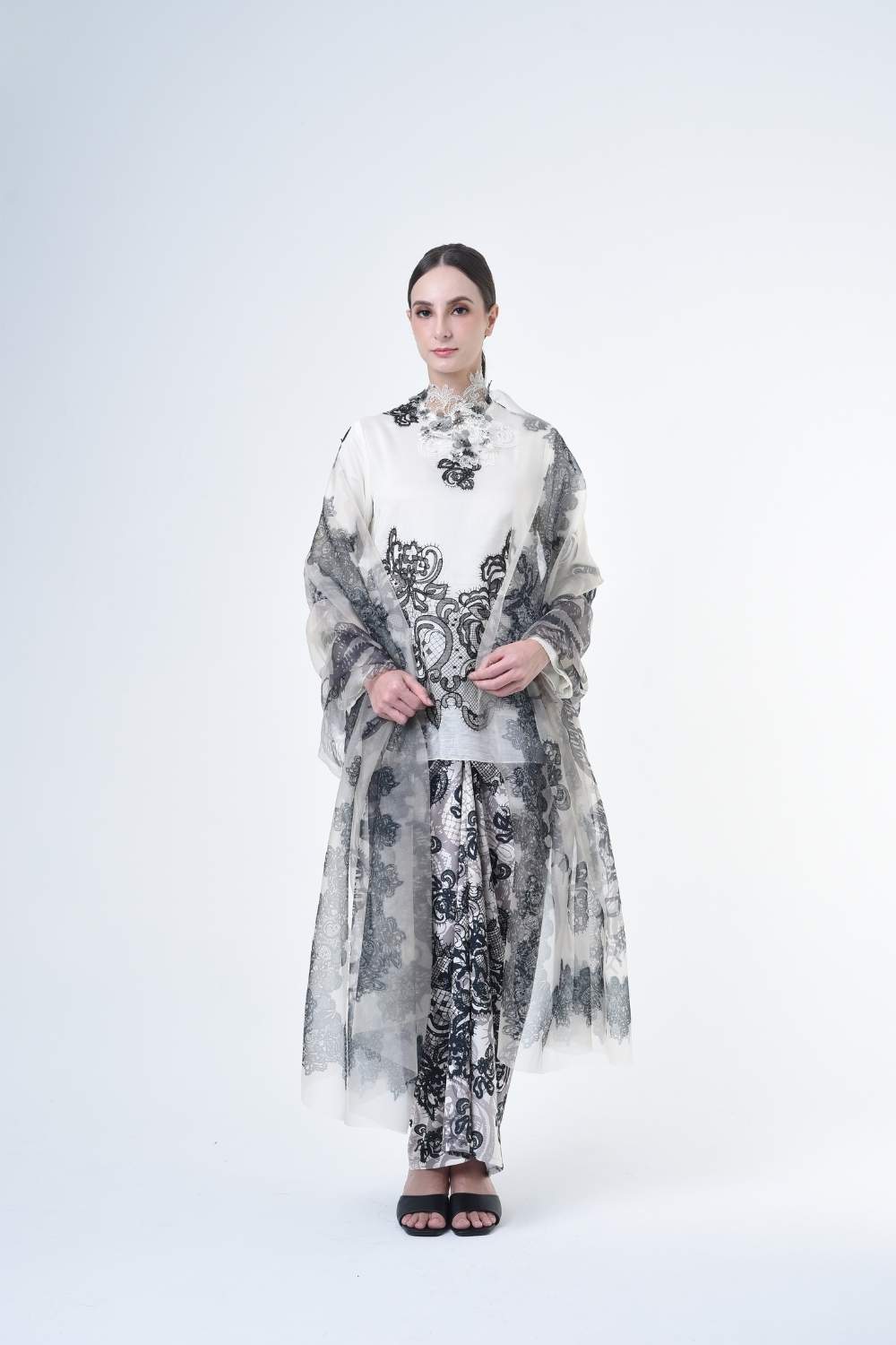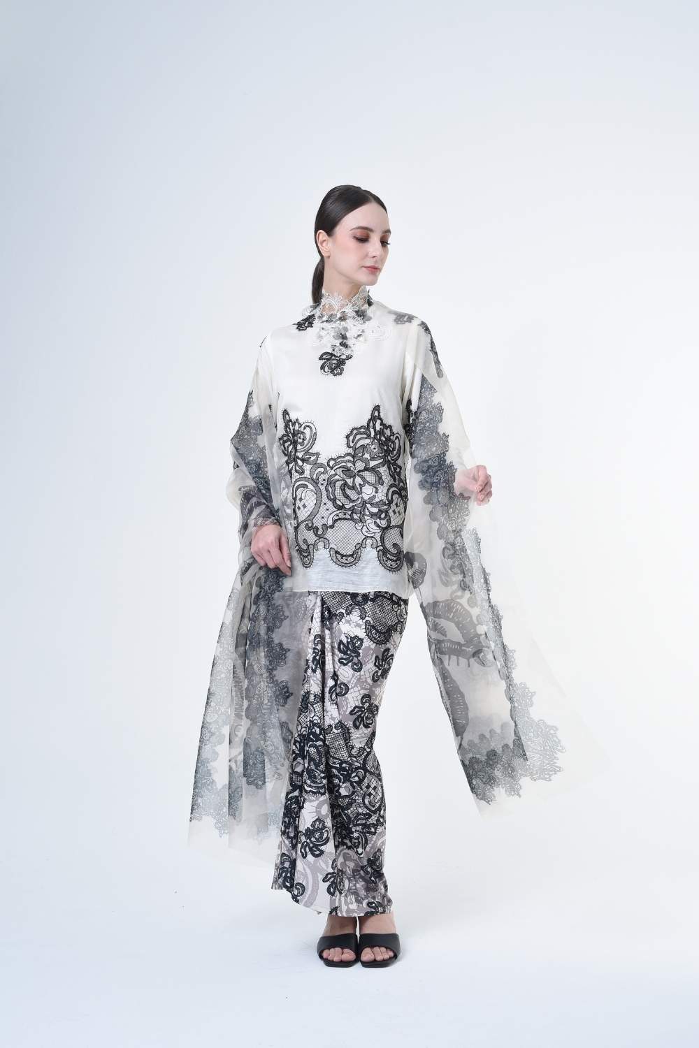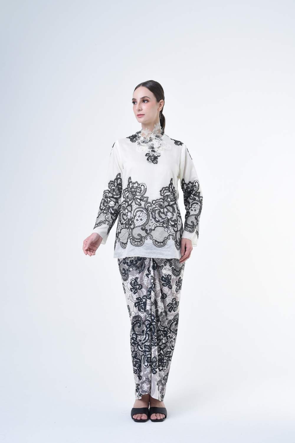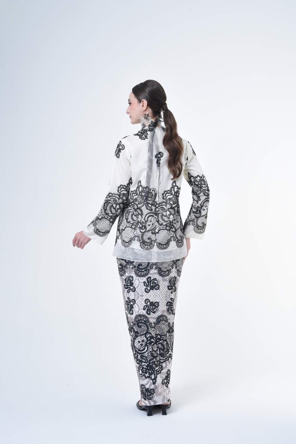 This stylish two-piece set features a loose fitting cut top in the kurung kedah style, paired with a Ikat sarong skirt.