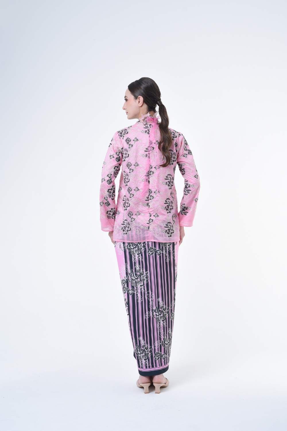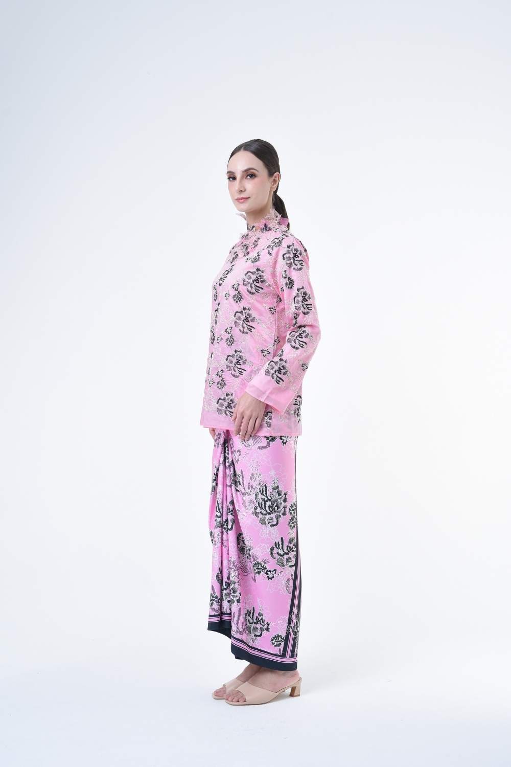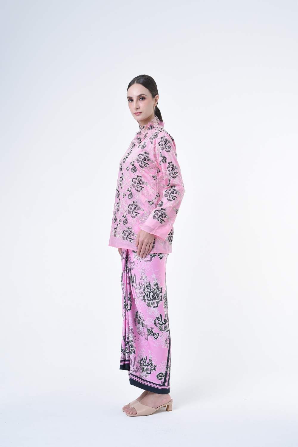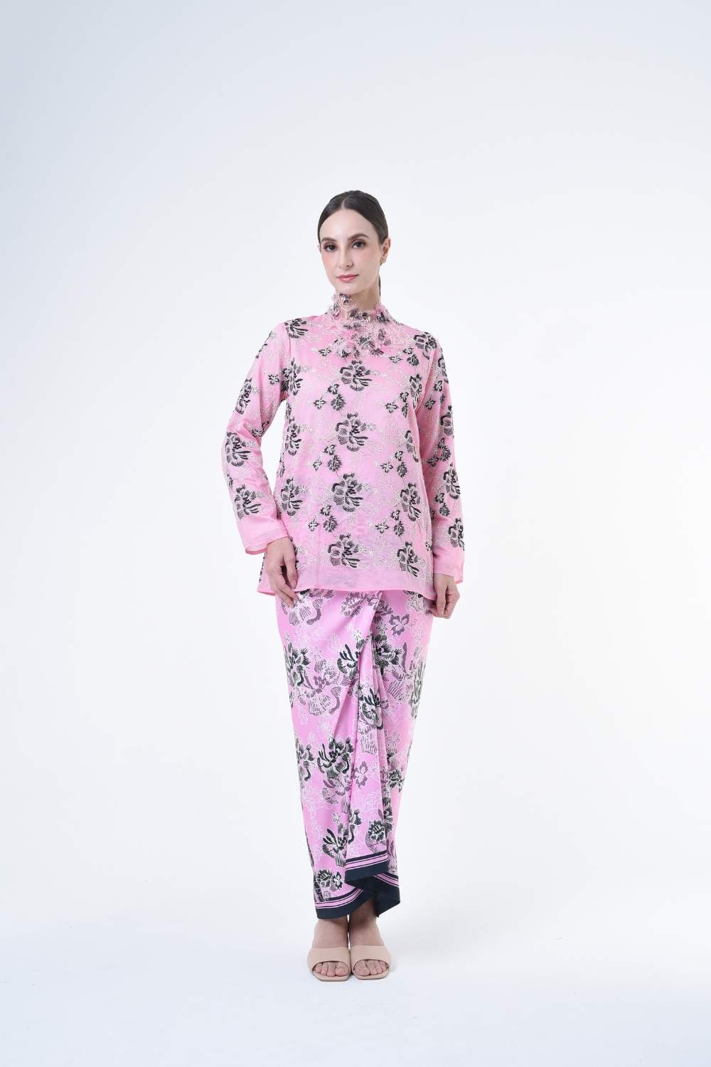 This stylish two-piece set features a loose fitting cut top in the kurung kedah style, paired with a Ikat sarong skirt.