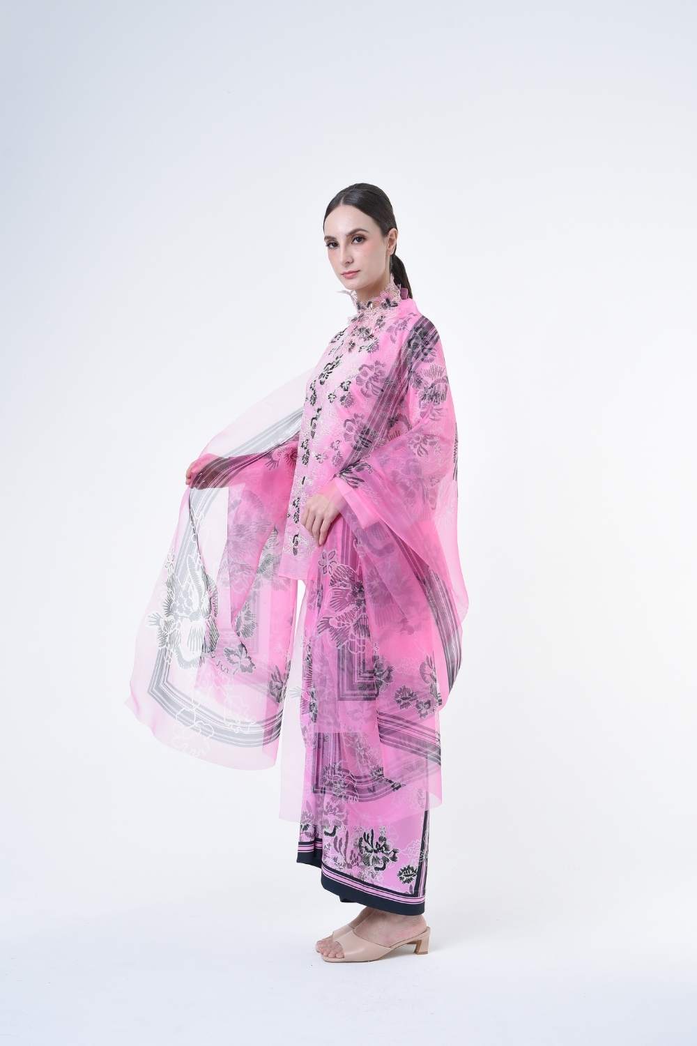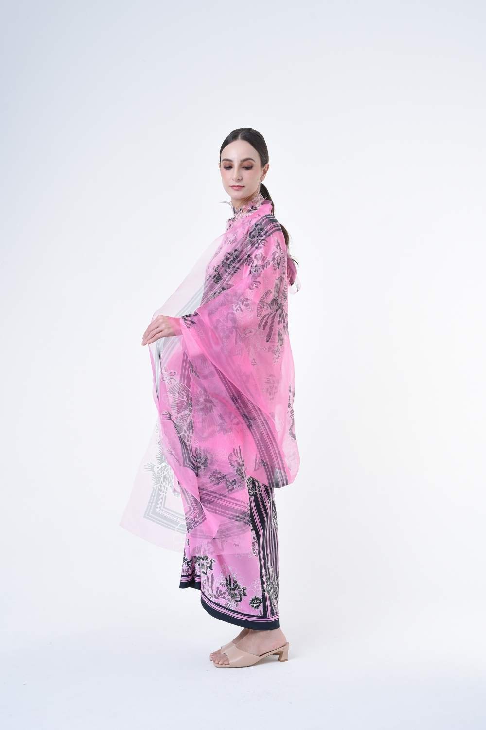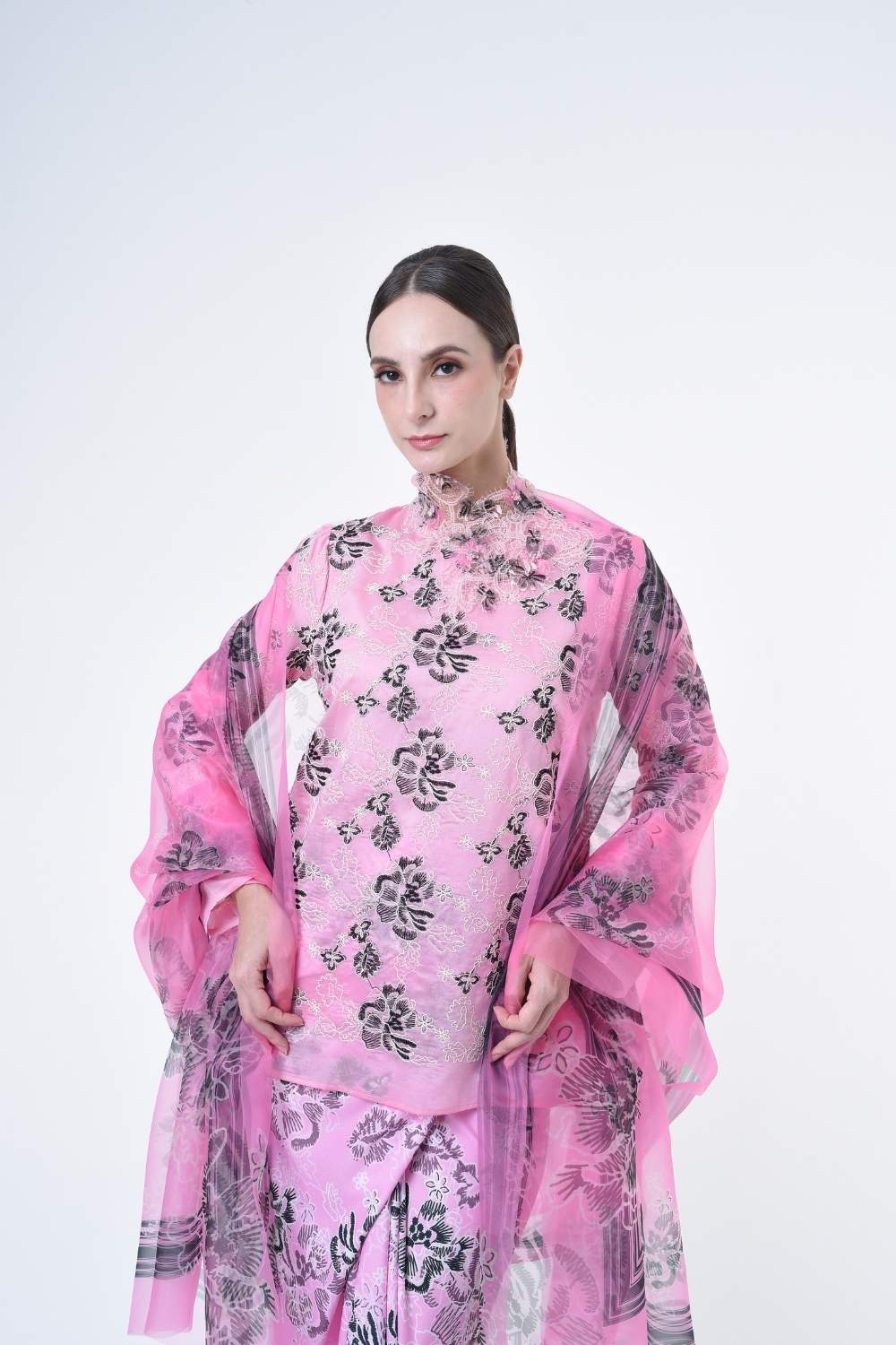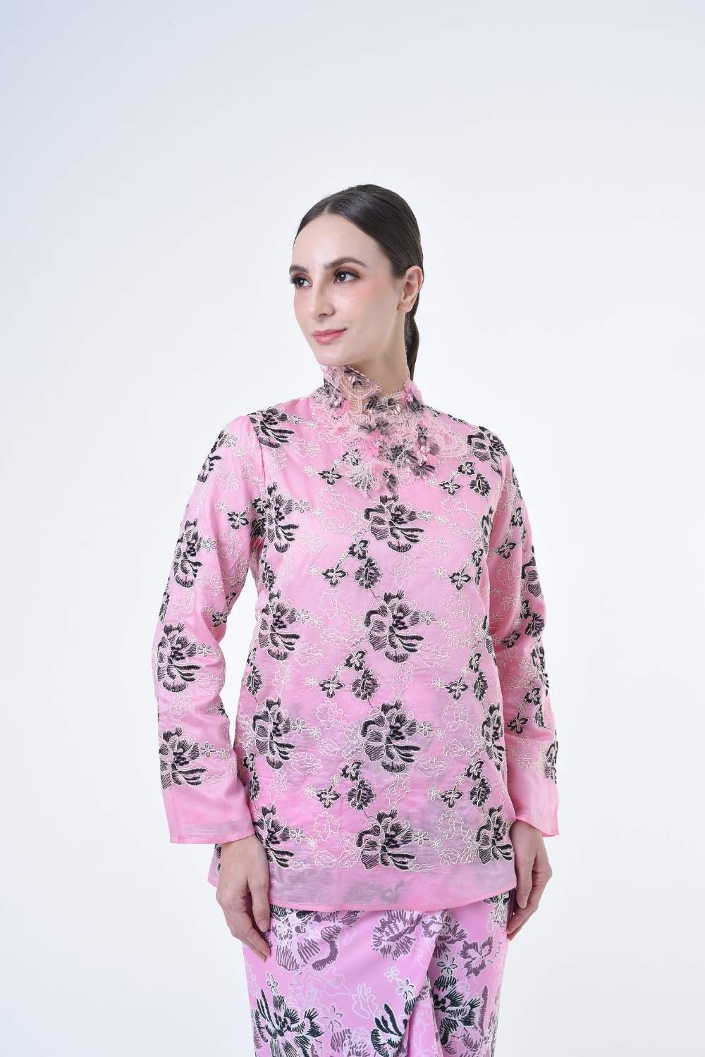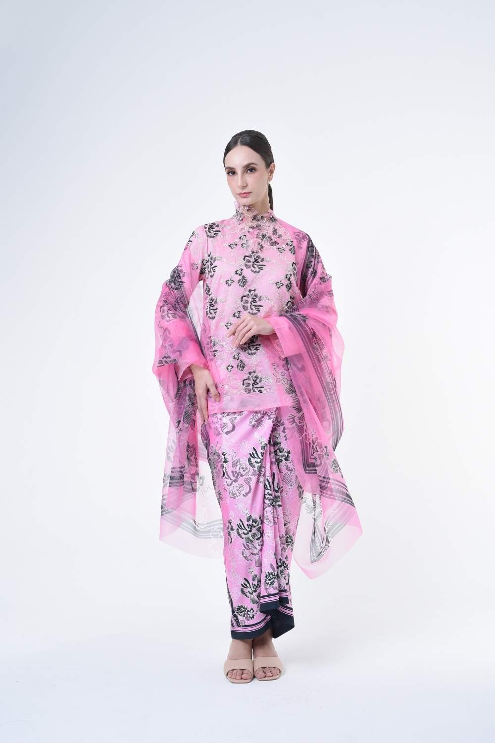 This stylish two-piece set features a loose fitting cut top in the kurung kedah style, paired with a Ikat sarong skirt.