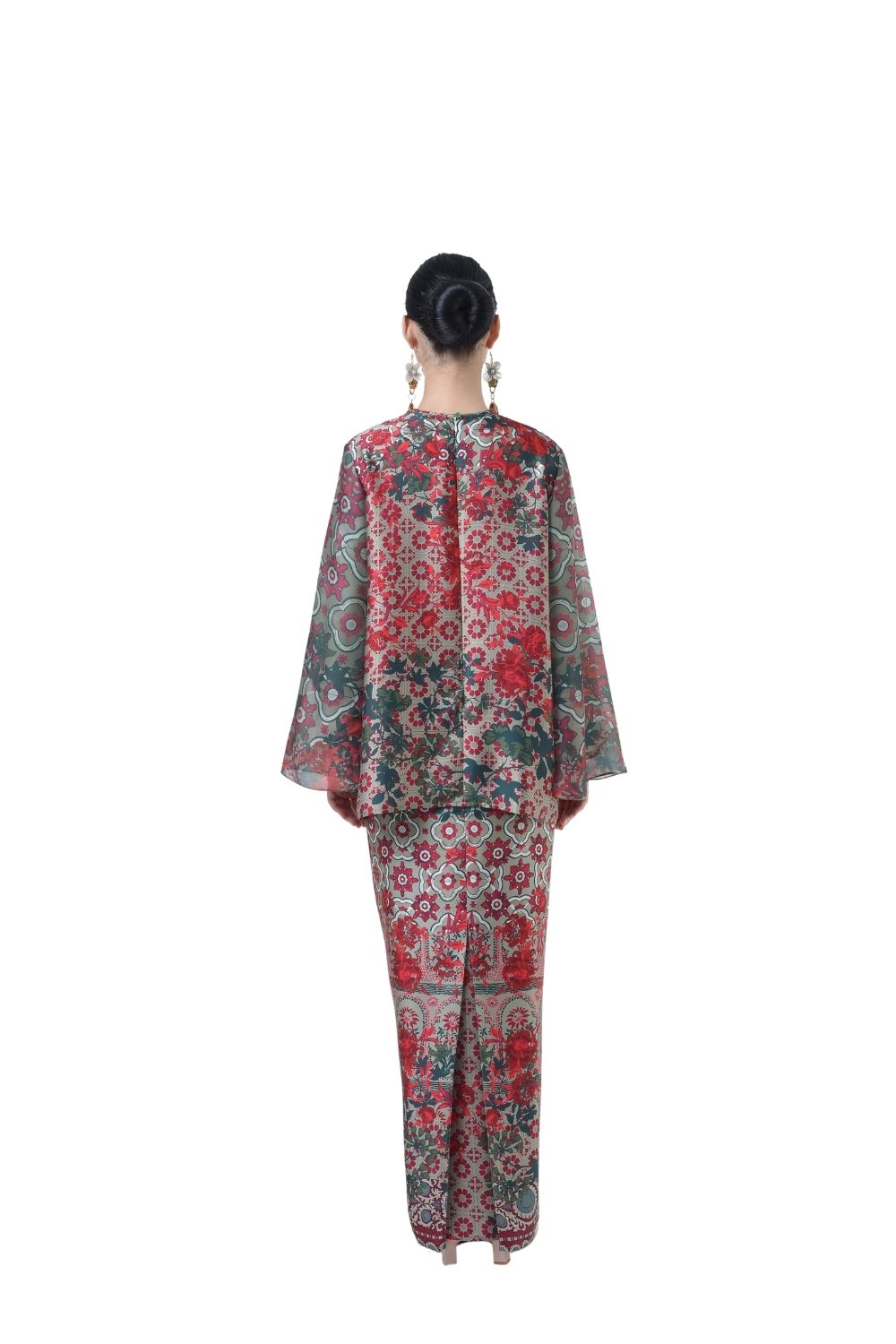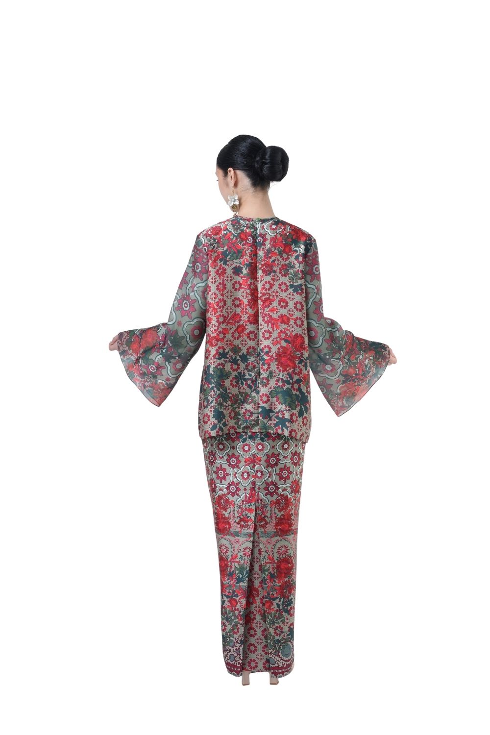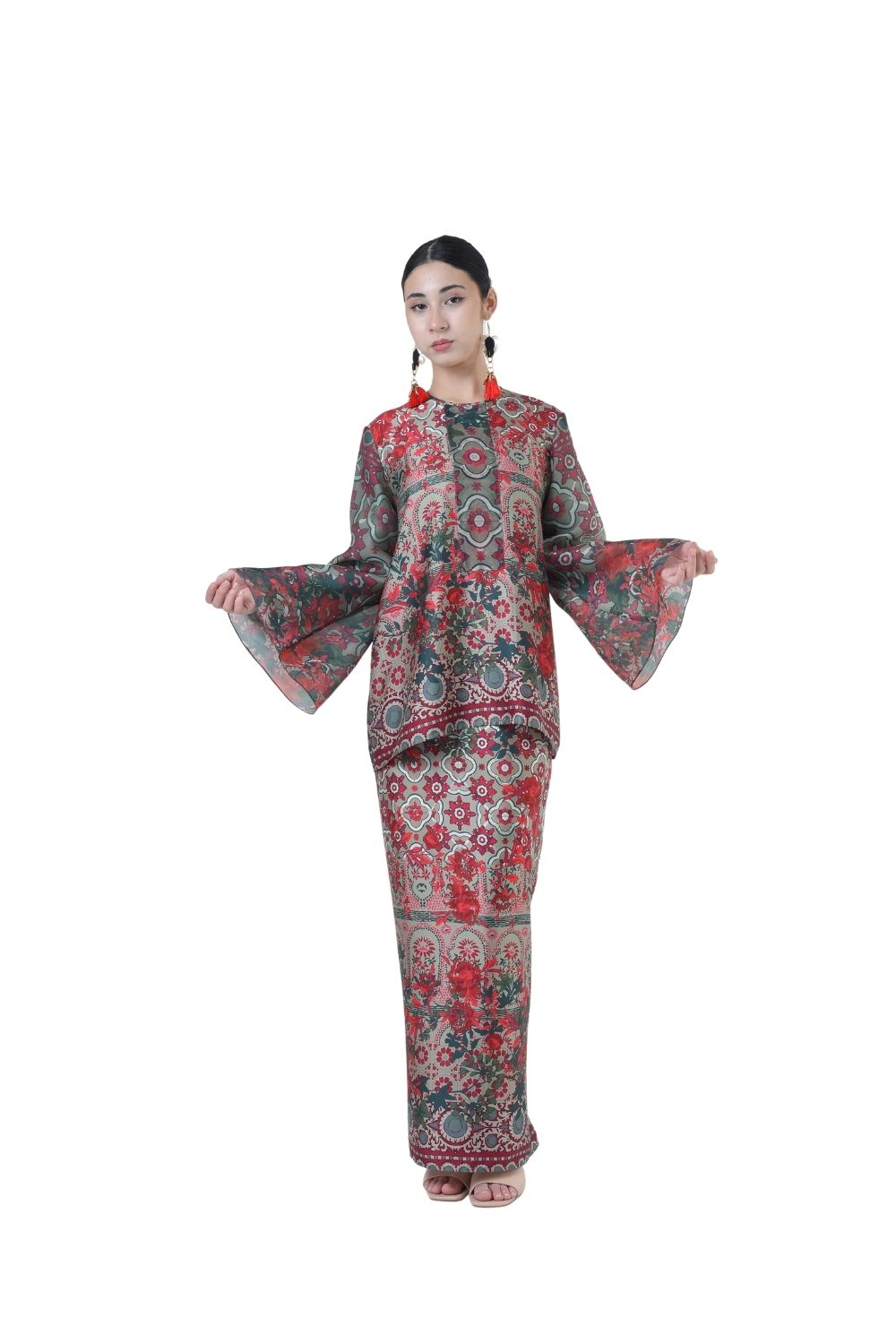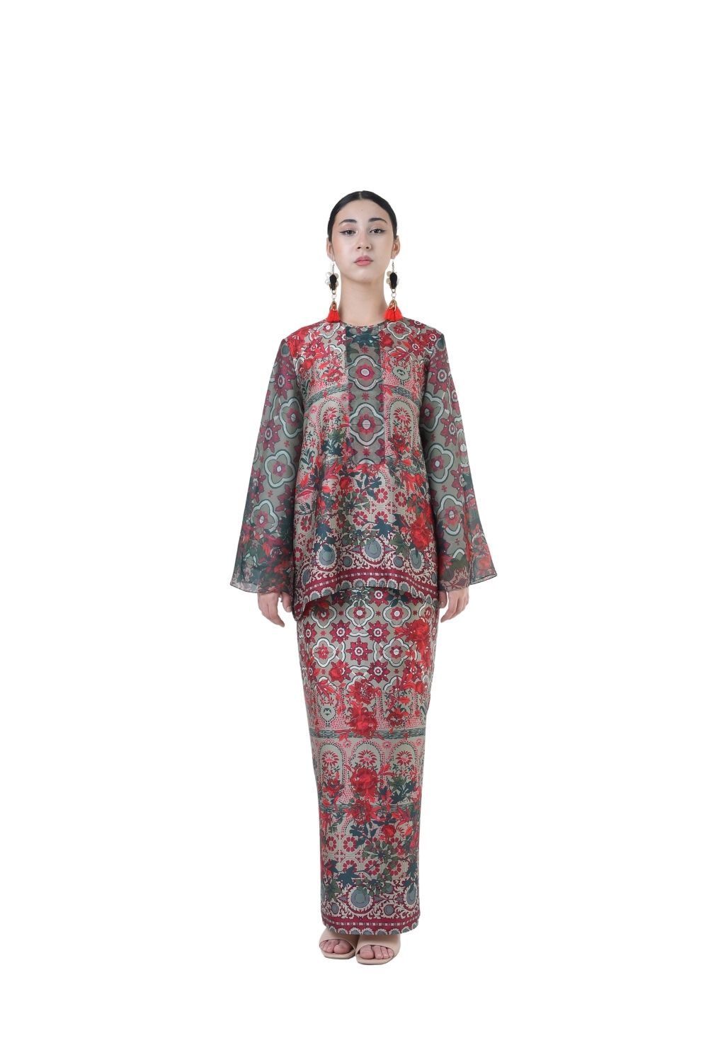 This stylish two-piece set features a loose A-cut top in the short kurung style, paired with a box pleated skirt. Designed with a contemporary floral tile motif, it offers a fresh and versatile look, perfect for any occasion. Tailored for the confident, stylish woman, this collection exudes effortless elegance and charm.