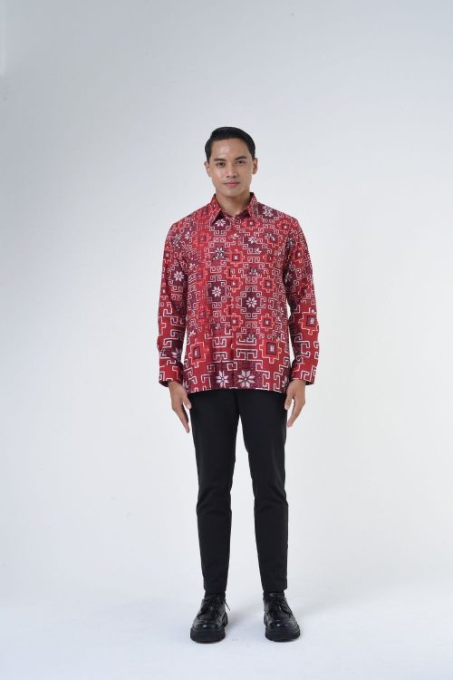 RM280.00Description: This relaxed cut men’s long sleeve batik shirt features intricate ethnic patterns. Its tailored fit makes it versatile for formal occasions, creating a striking statement piece that celebrates cultural heritage. Details: 70% Composition Cotton Shirt Collar Long sleeves with cuff button Color: Crimson Red