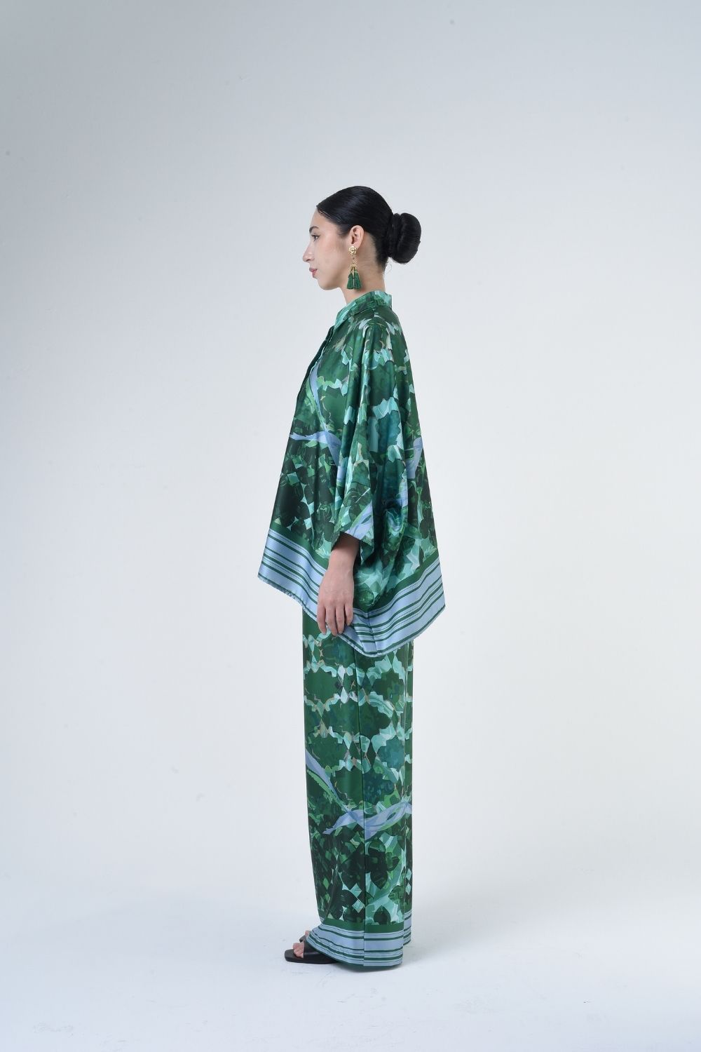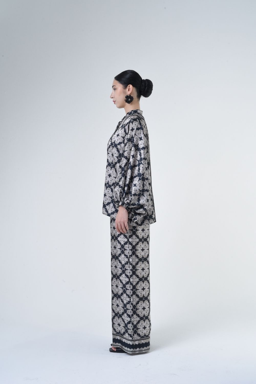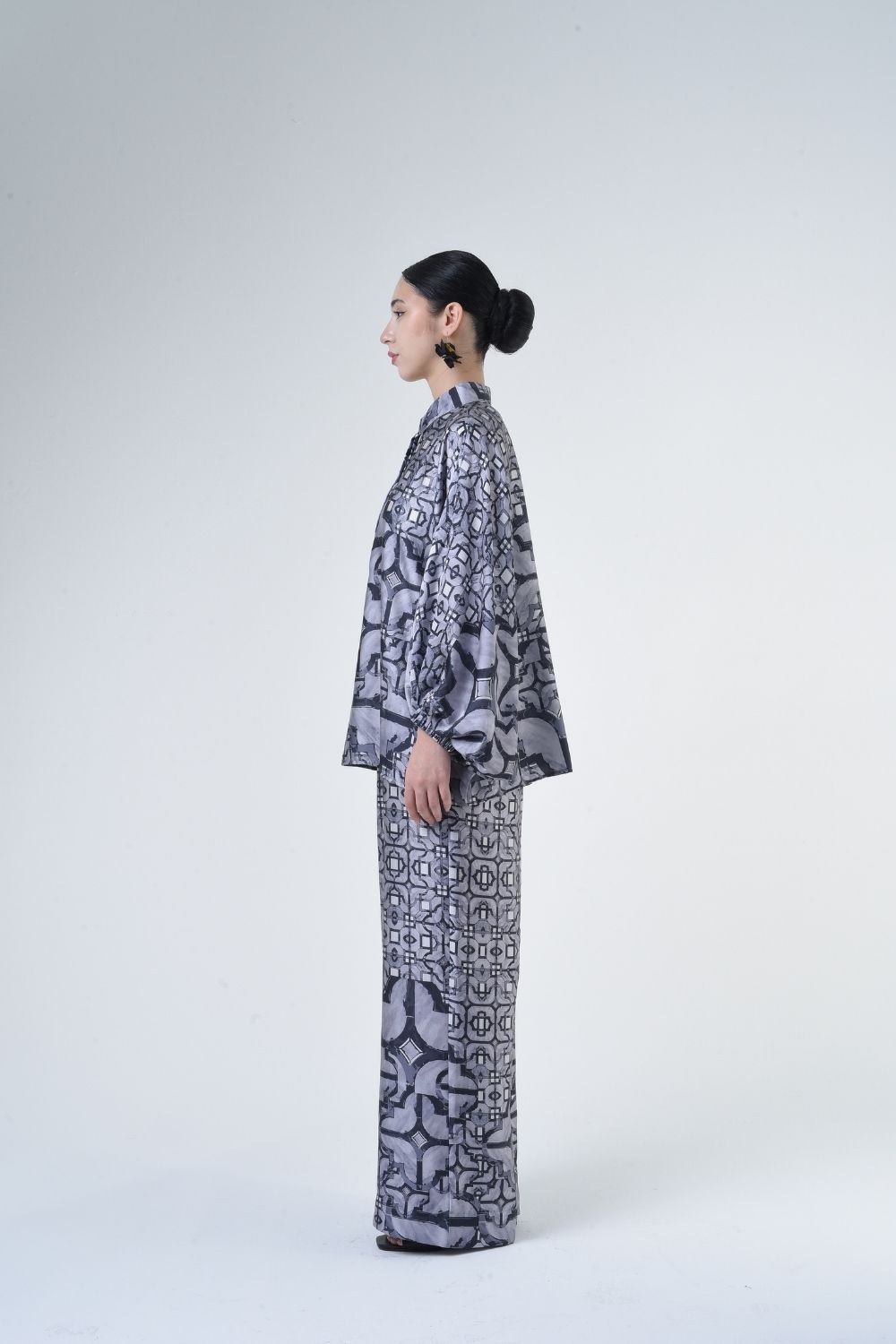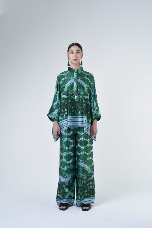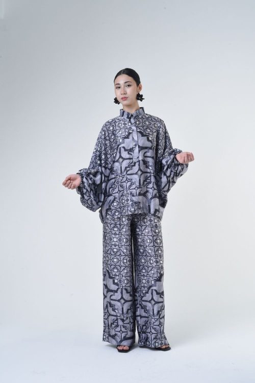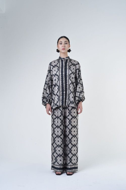 Description: This 2-piece loose top with loose pants is distinguished by its fresh, versatile cut, enlightened by modern antique tiles placement. Our collection is designed to make you feel like the confident, stylish woman you were destined to be. Details: 100% Composition mate satin Classic Collar Half Hidden Button Opening at The Front…