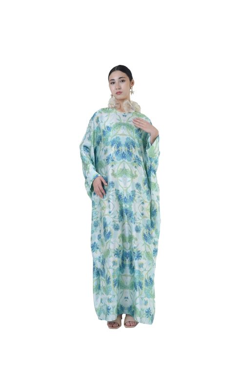 Description This loose cut long kaftan is prominent by its fresh, versatile cut, illuminated by batik floral. Our kaftan collection is designed to make you feel like the confident, stylish woman you were destined to be. Details: Composition 100% Heavy Satin Round Neckline Cuff sleeves 4” opening at the back with button Color: Pale aqua…