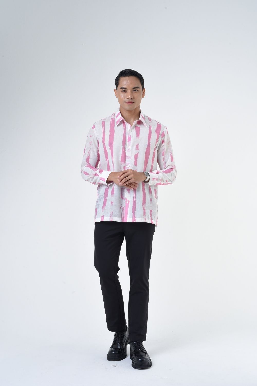 Description:   This relaxes cut men’s long sleeve batik shirt features intricate stripe patterns. Its tailored fit makes it versatile for formal occasions, creating a striking statement piece that celebrates cultural heritage.   Details: 70% Composition Linen Shirt Collar Long sleeves with cuff button    Color: Dusty Rosewood and white