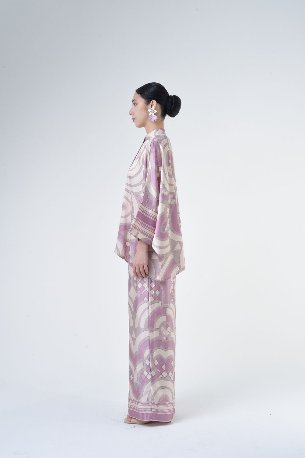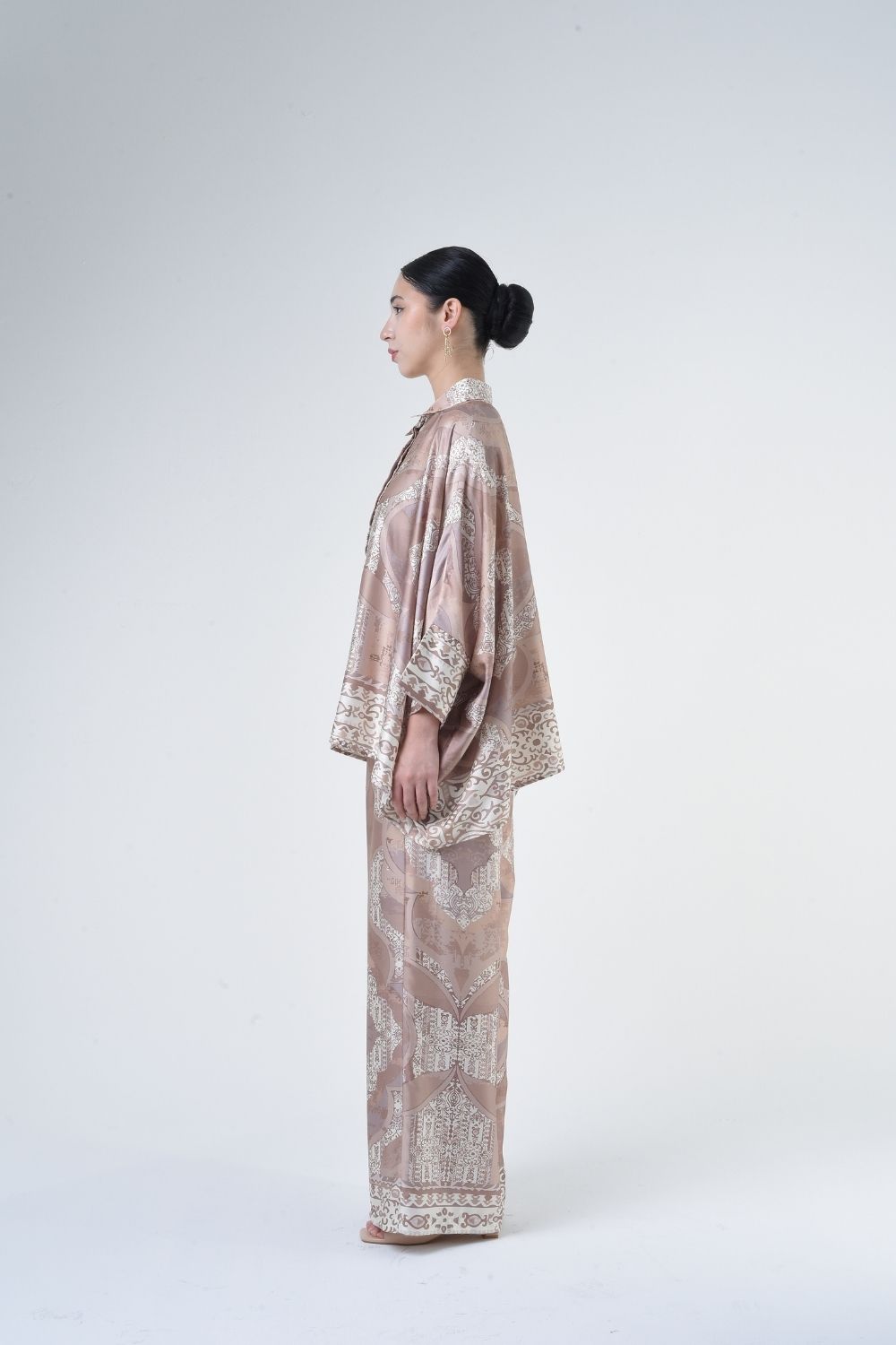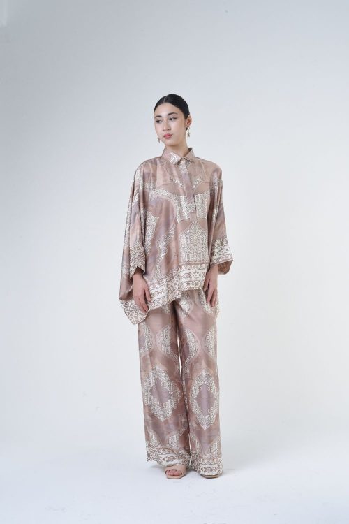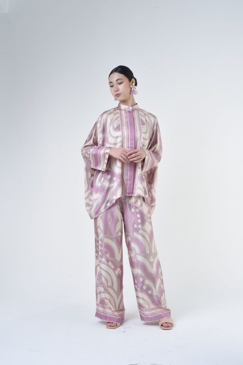 Description:   This 2-piece loose top with loose pants is distinguished by its fresh, versatile cut, enlightened by modern geometric placement. Our collection is designed to make you feel like the confident, stylish woman you were destined to be.   Details: 100% Composition mate satin Mandarin Collar Fully Hidden Button Opening at The Front Cuff…