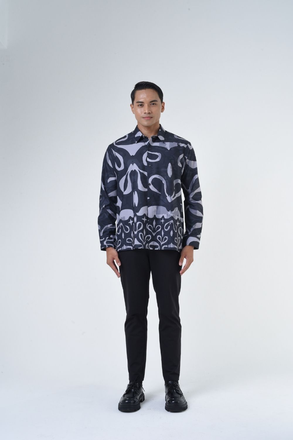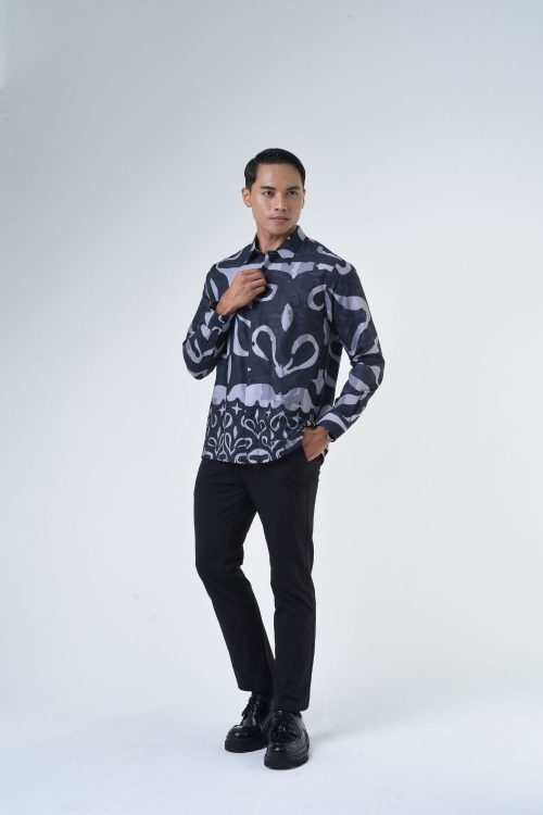 Description:   This relaxed cut men’s long sleeve batik shirt features intricate geometric patterns. Its tailored fit makes it versatile for formal occasions, creating a striking statement piece that celebrates cultural heritage.   Details: 70% Composition Cotton Shirt Collar Long sleeves with cuff button    Color: Charcoal gray and silver